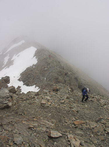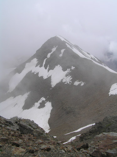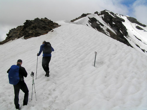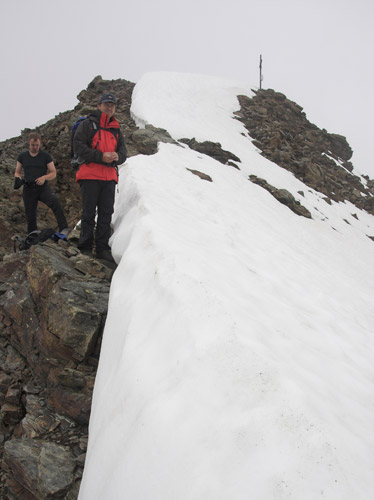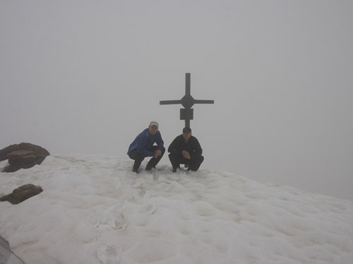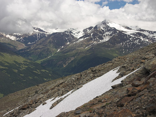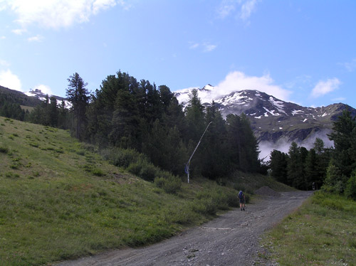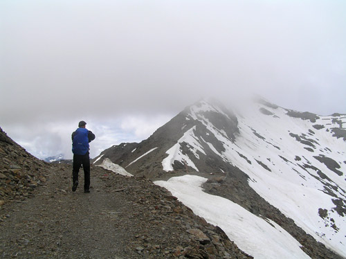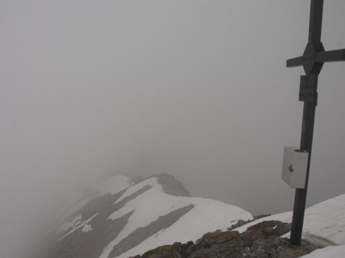 První den s vyhlídkou rozumného počasí jsme chtěli udělat úplně jiný okruh, něž co jsme nakonec absolvovali, protože ten den nejela jedna lanovka. Byli jsem nuceni změnit operativně plány přímo na místě u ní. A tak ze stanice Bormio 2000 se vydáváme vzhůru po cestě kopírující sjezdovku na stanici lanovky Bormio 3000 poblíž Cima Bianca 3012m. Cesta byla místy strmá, místy travnatá po jindy jinak sněhem zakrytém svahu. Ne moc záživná. Po cestě nás provázel silný vítr a občas i spadlo pár kapek. Tu a tam se odkryl pohled vpravo na dnešní náš cíl Monte Vallecetta 3148m. Od poslední stanice lanovky jdeme po hřebenové cestě se zbytky sněhu zahaleni již jen v šedých mracích. Po přibližně půlhodince dorazíme na vrcholu u kříže. Bohužel není nic vidět, je mlha, že by se dala krájet. Jen tu a tam je vidět po hřebenu kousek dále. Pořídíme tedy jen pár záběrů a vracíme se zpět. Na Bormiu 3000 začně svítit konečně sluníčko, které nás přiměje si na chvíli tady zarelaxovat. Máme totiž čas. A tak slunečno nás již provází až zcela dolů. Po dvou hodinách cesty jsme dole u lanovky, která nás doveze do Bormia. |