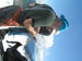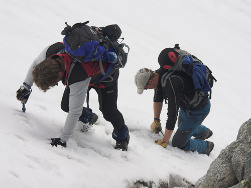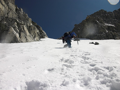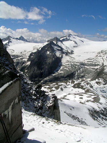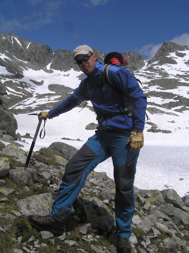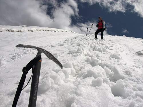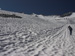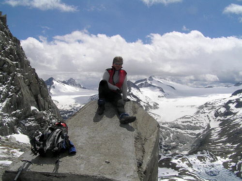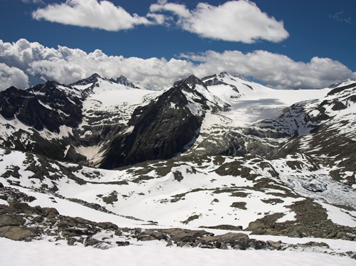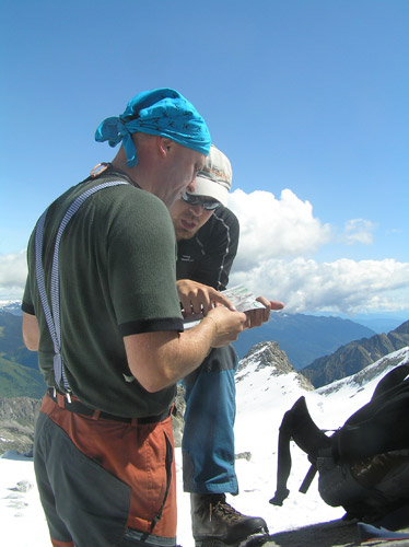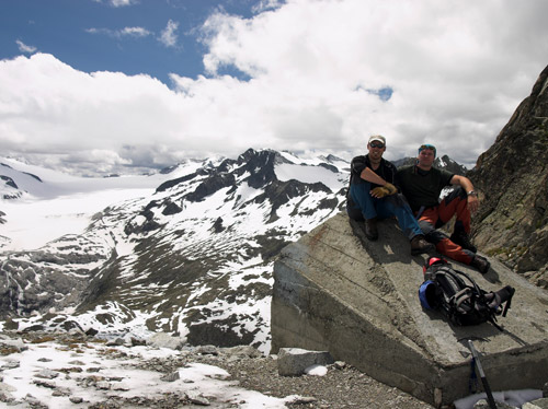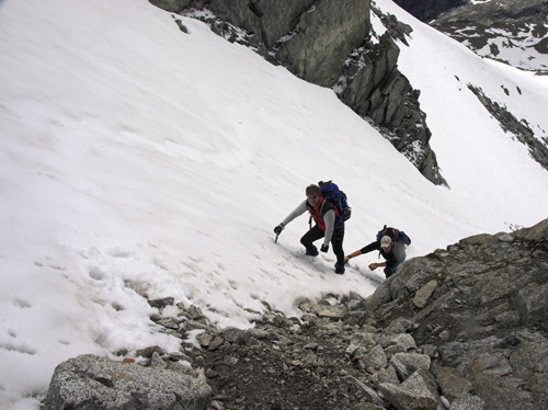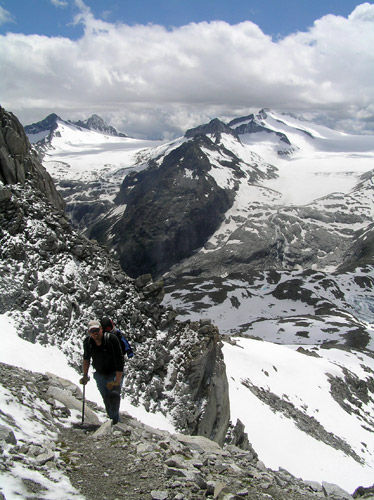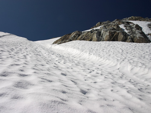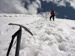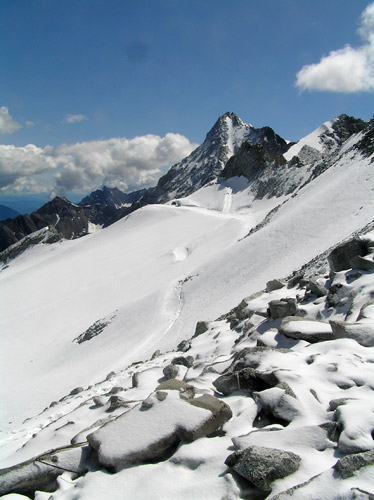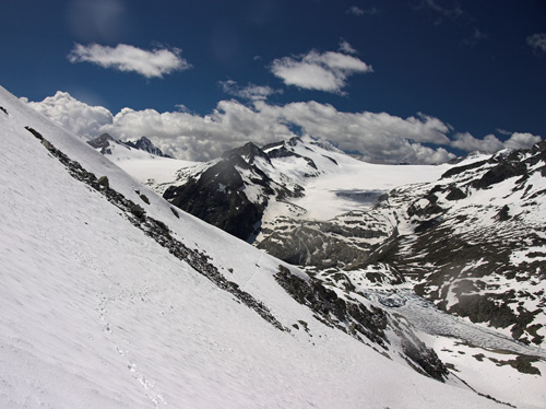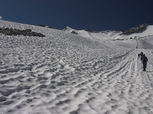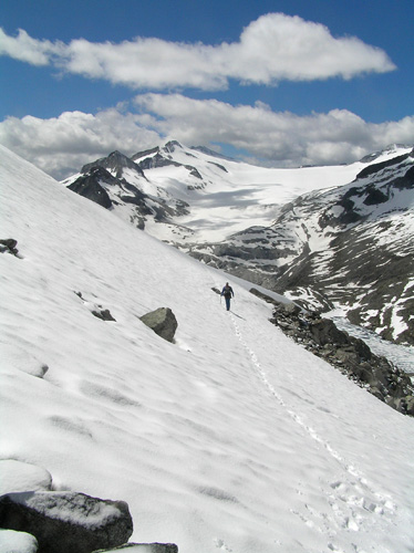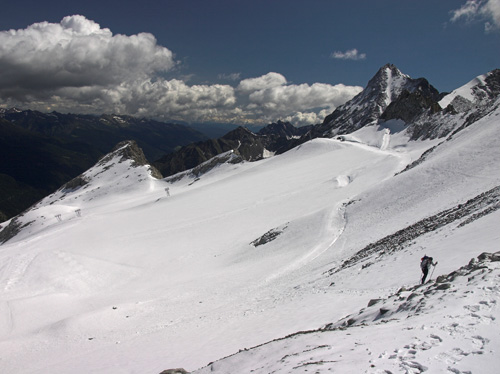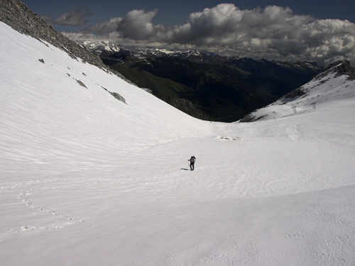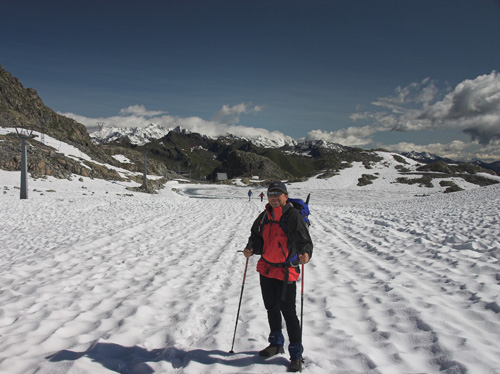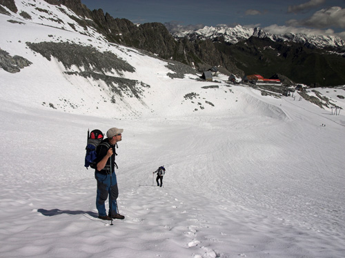 Třetí den se necháváme z Passo Tonale 1883m první lanovkou vyvézt na Passo Paradiso 2585m. Počasí nahoře nás trochu zaskočilo a hřebenová cesta leží pod sněhem, všude ledová krusta, nelze nalézt značky natož onu cestu, volíme proto postup po sněhových pláních ležících na ledovci Vedretta della Presena. Ledová krusta po ránu je nepříjemná, ale po půlhodince sníh bředne a tempo je s hůlkami rychlejší. Míjíme mezistanici pro vleky Ghiacciaio Presena 2730m. Chyběly nám dnes mačky, protože se plánovala jiná cesta a tak se nebrali ( nečekali jsem ani sníh ). Brzy dorazíme do sedla Passo del Maroccaro 2975m. Odkud je fascinující rozhled, především na Vedretta dei Mandron. S obavami nakonec zdoláme opravdu příkrý setup, bez cepínu by to bylo docela nebezpečné, kdyby ujely nohy, litujeme absence maček. Klesáme dolů k Lago Scuro kam ještě dorazíme, ale směrem k Rif.Mandron však již nejdeme s časových důvodů. Vracíme se po chvíli odpočinku zpět nahoru do sedla. Slunce nás hřeje a sníh je hlubší a mokrý, klouže stále více. Ze sedla již se rychle doklouzáme dolů na Ghiacciaio Presena. Na cestě od sedla jsem se propadnul a přišel jsem o hůlku. Lepší nežli o kotník. |