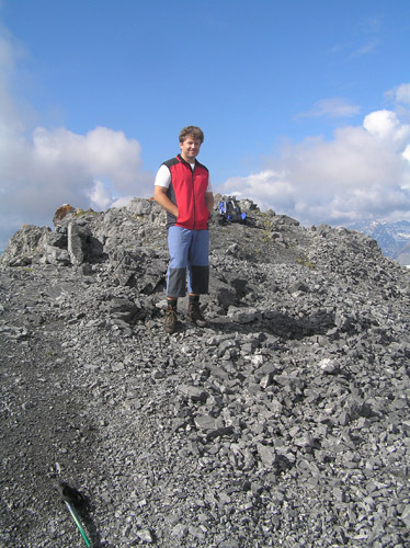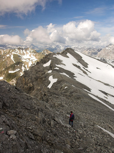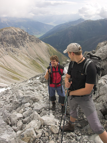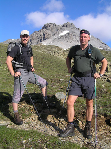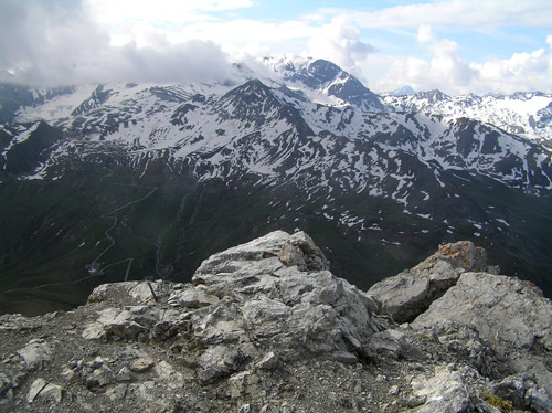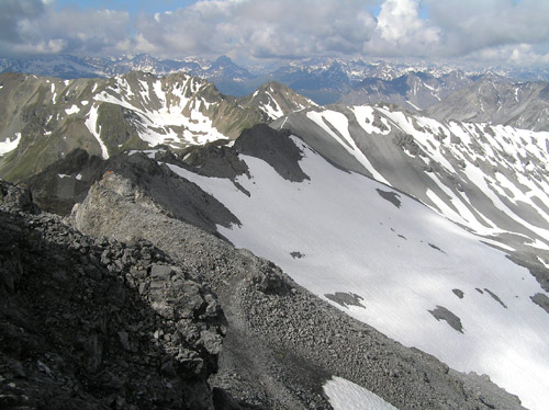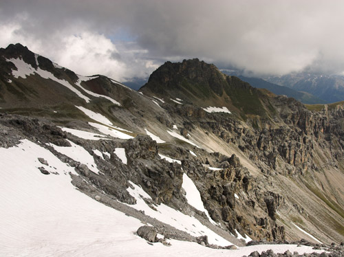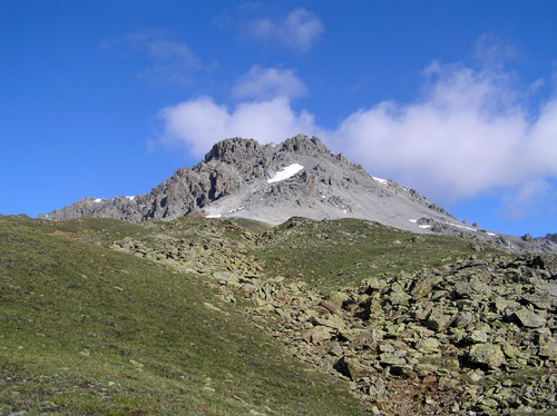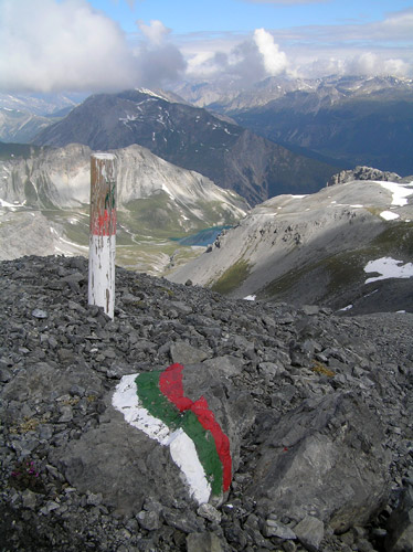 První den vyrážíme jako obvykle aby se nohy rozhýbaly, plíce pomalu zykly a oko pokochalo na nějakou menší akci. Autem dorazíme do sedla Pass Umbrail 2498m, kde startujeme a odkud je vidět vrcholek Piz Umbrail 3031m, kam míříme nejdříve. Nenáročná a schůdná cesta utíká velmi rychle a tak brzo jsme na místě. Po malé relaxaci na slunci, které nám dne přeje, dále cestou pokračujeme po hřebenu, který zde tvoří zároveň státní hranici. Tu a tam jsou zbytky sněhu, ale jinak je to pěkná a svižná cesta. Vpravo pod námi se objeví pohled na jezero Lai da Rims. Po hřebenu dorazíme až do málo zřetelného sedla pod Punta di Rims 2947m, kde odbočujeme vlevo a padáme již do údolí na zpáteční cestu. Dnes máme dost času a tak se i zastavujeme na delší svačinku v travnatém údolí. Pak již jen sejdeme do sedla. Bylo to takové příjemné rozhýbání na první den. Ze sedla se vracíme autem směrem k Bormiu. |