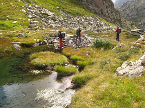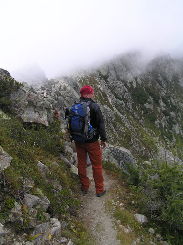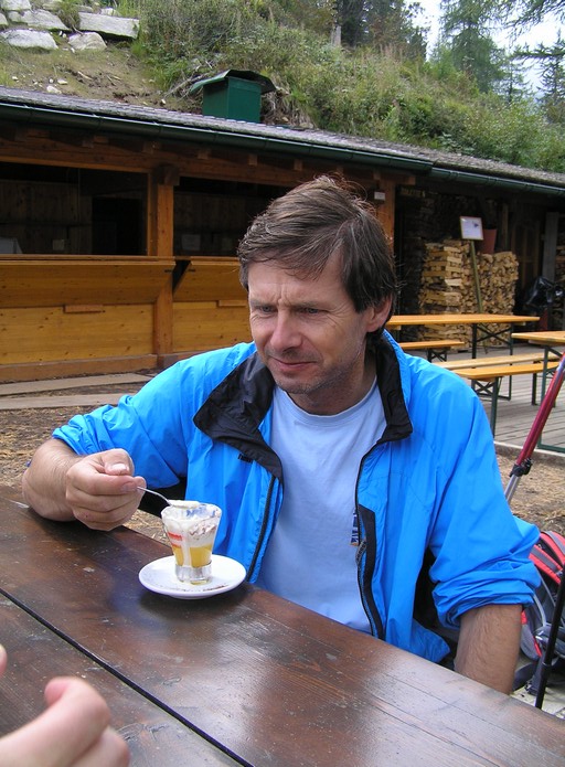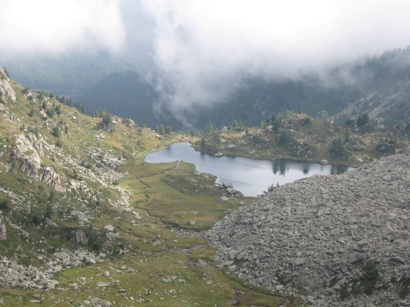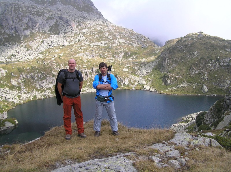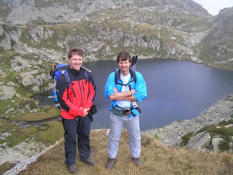 Druhý den po poněkud pro nás náročnějším dni předchozím, volíme odpočinkovou trasu kolem jezer. Nejprve vyjedeme horní lanovkou z Madonna di Campiglio vyjedeme k Rif.Pradalago 2119m a odtud vystoupíme po cestě 267 za mlhy na Monte Zeledria 2426m. Škoda, že nebylo nic vidět. Mlha nás provází ještě nějakou chvíli. Míjíme odbočku na pěkný okruh kolem pěti jezer, ale čas není a ani počasí, takže dle plánu pokračujeme přesto krásnou krajinou plnou bohaté zeleně a rozmanitých vod, postupně kolem jednotlivých jezer Tri Laghi a Lago Alto, kde dáváme malý odpočinek na sluníčku, což není běžným zvykem. Při sestupu k poslednímu Lago delle Malghette 1890m jsme potkali dvojici holek, kdy Petr J. pozval jednu z nich s námi na ferraty. A tak Romana se k nám na dva dny další přidala. Od posledního jezera po cestě 265 se vracíme dolů už jen k rušnému jezeru Lago di Pradalago, kde si Petr J. je dopřál konečně očekávané Bombardino. Po krátké pauze vcelku odpočatí po nenáročném dni jdeme na lanovku zpět. |