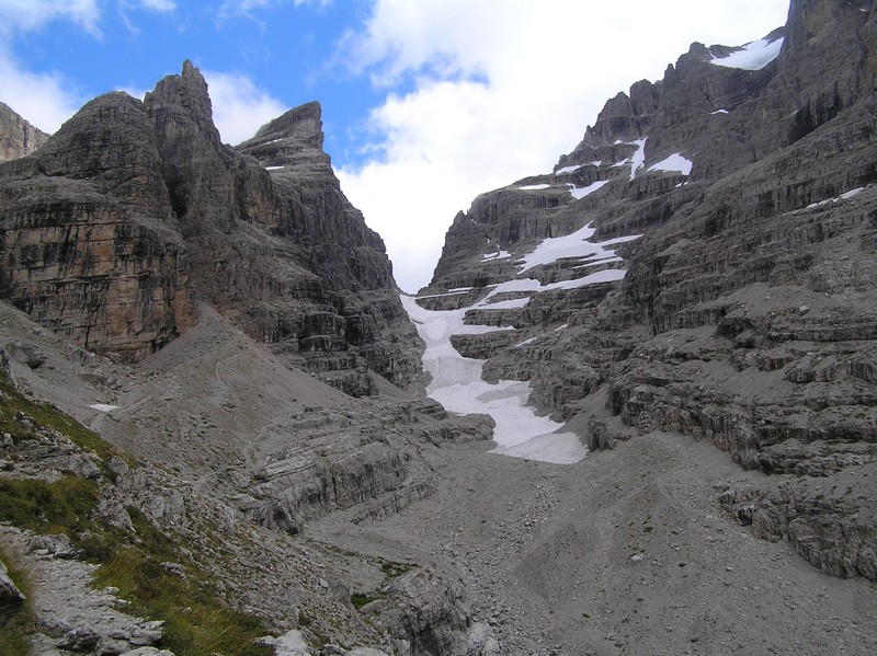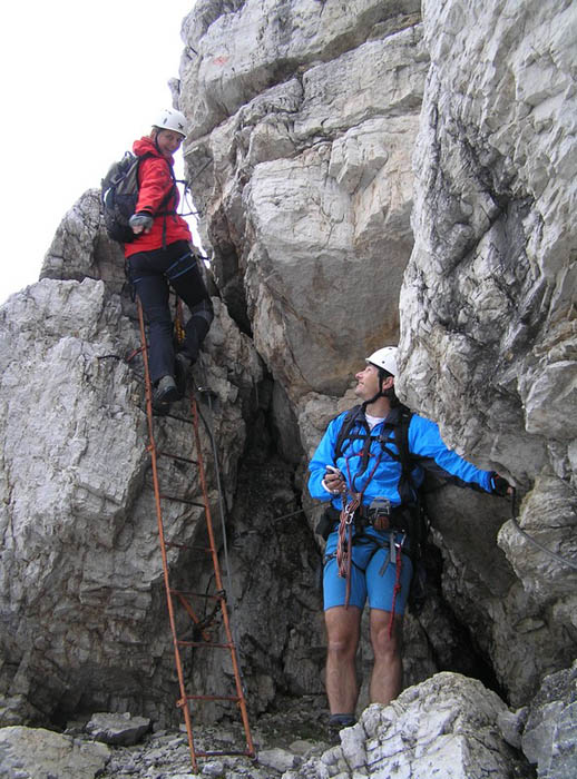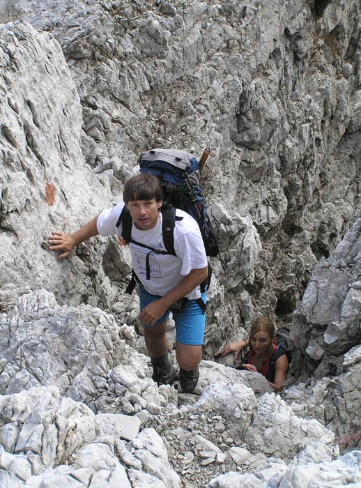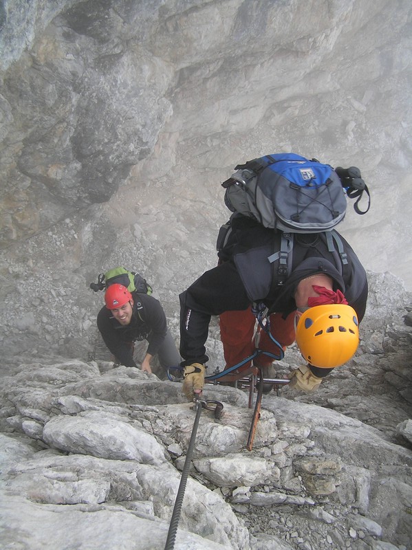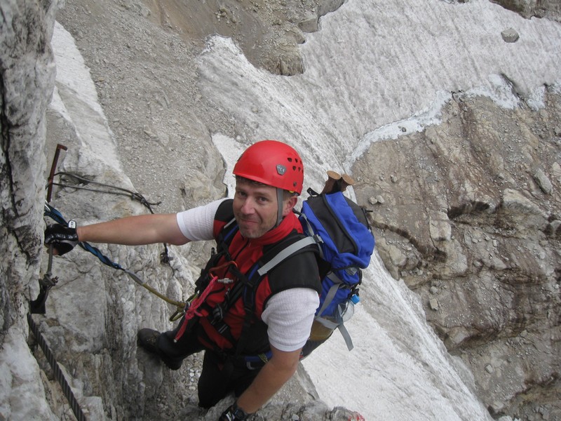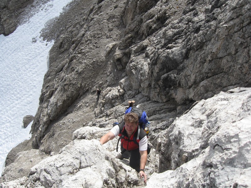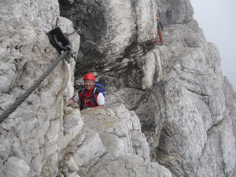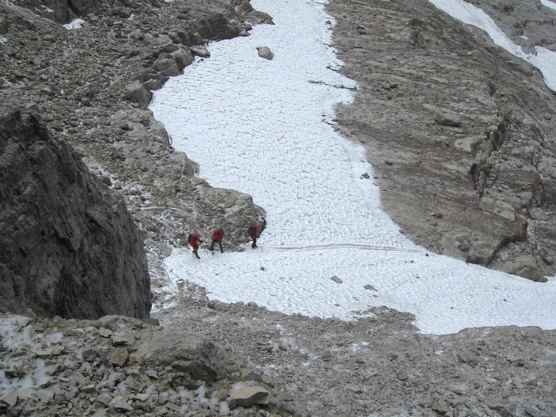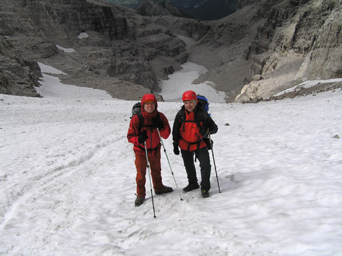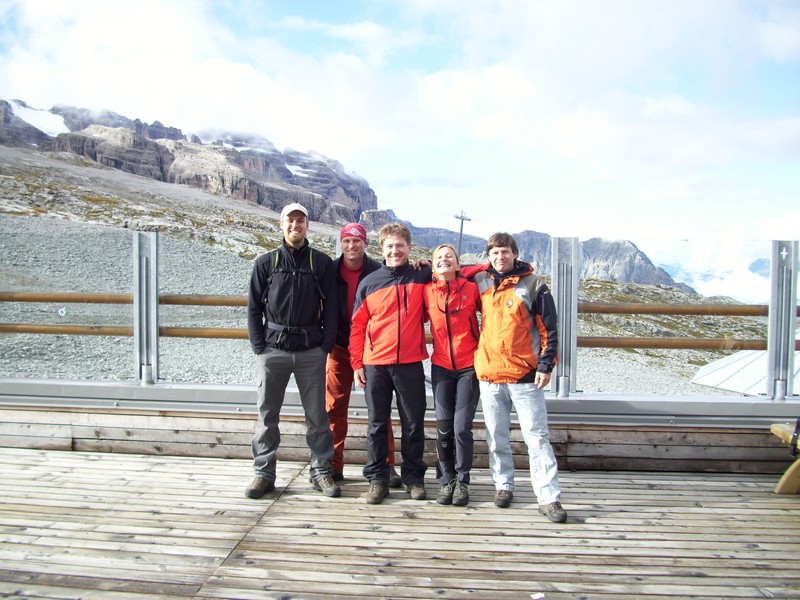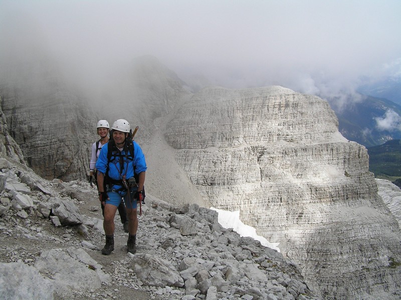 Čvrtý den jsme lanovkou brzy ráno dorazili na chatu Rif.Grosté 2442m, kde je naše východisko pro další nejkrásnější ferratu této oblasti Via delle Bocchette I. Pomalu vyrážíme po 305, nádherné okolí zpomaluje náš postup, kdy se kocháme okolím. Rozhodli jsme se zdolat vrchol Cima Groste 2901m a tak se odkláníme z trasy a vpravo vzhůru vyrážíme na vrchol. Cesta byla náročná, místy trochu lezecká, nejištěná, obzvláště sestup 40 metrovou spárou byl nepříjemný. Dole se opět napojujeme na původní trasu a pokračujeme dál. Přichází mlha a mraky. Bez povšimnutí míjíme vrcholy Cima Falkner 2999m nad námi. Žebříky, lana a zase žebříky, místy vzdušná a dobře zajištěná ferrata potěšila. S posledními metry začíná foukat a padají malé kroupy, které bubnují do přileb - ještě že je máme. V sedle Bocca del Tuckett posvačíme. Po chvíli se mění počasí a slunce chvíli i hřeje. Dělíme se, Petr a Romana jdou zpět celou ferratu na Rif.Grosté a my tři nasazuje mačky a po mokrém a kluzkém sněhu ledovce Vedretta di Brenta Inferiore sestoupíme na Rif.Tuckett 2270m. Po malé pauze, razíme velmi svižně pod masivem Torrione di Vallesinella po 316 na skoro poslední lanovku jedoucí z Rif.Grosté. |