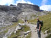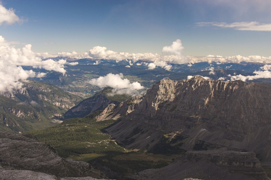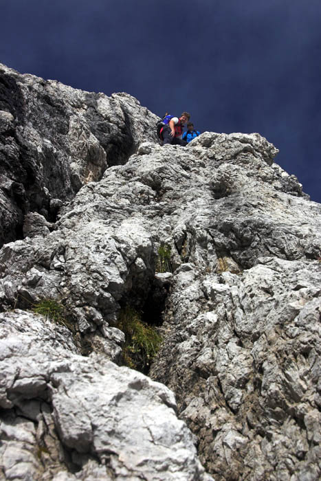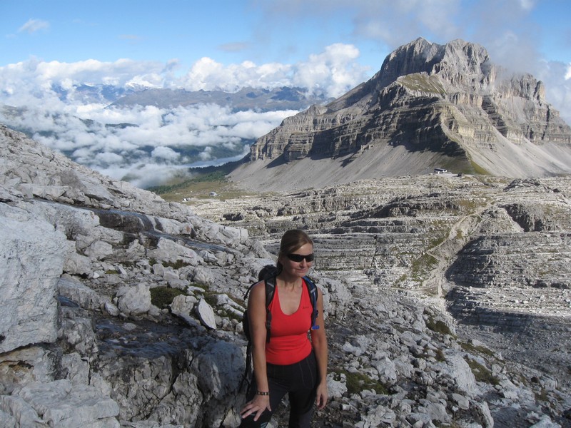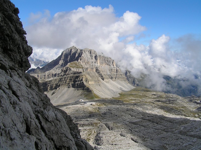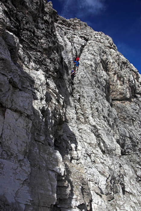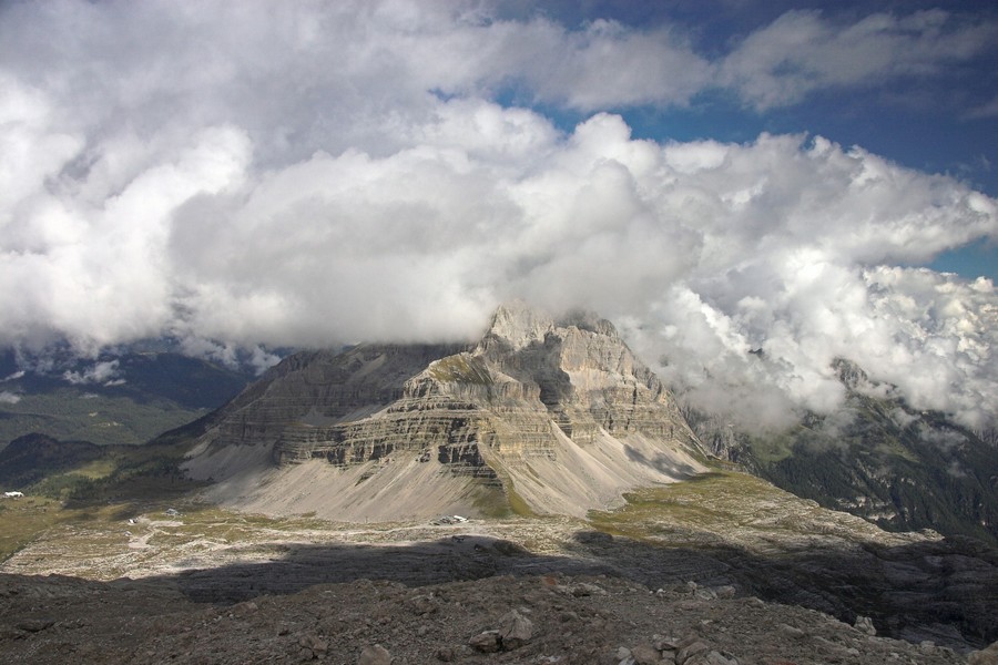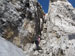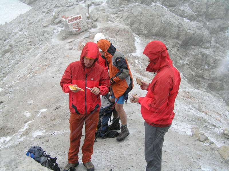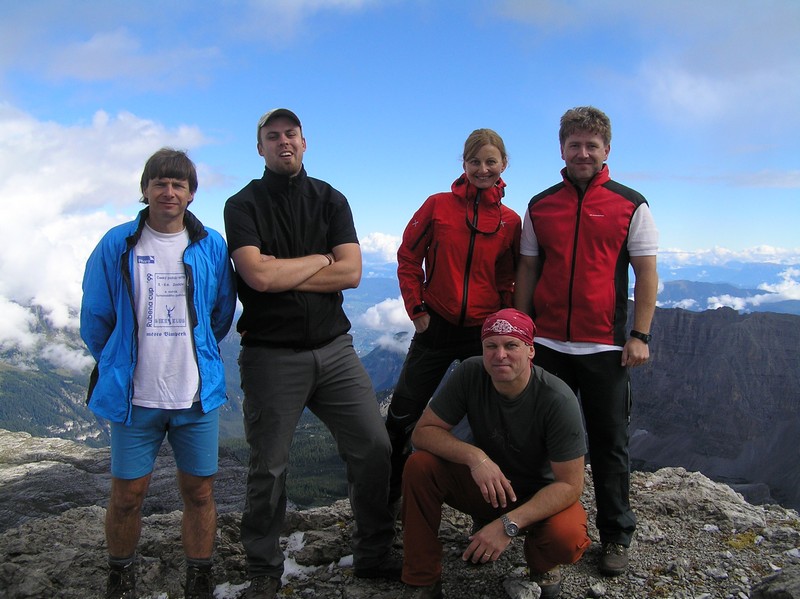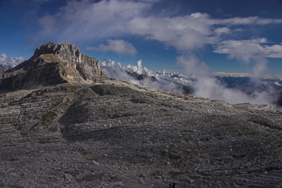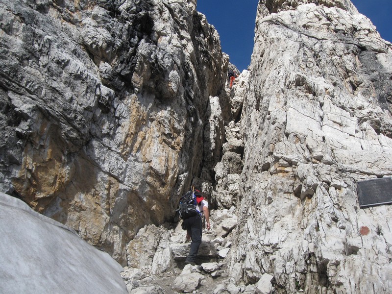 Čvrtý den jsme lanovkou brzy ráno dorazili na chatu Rif.Grosté 2442m, kde je naše východisko pro další nejkrásnější ferratu této oblasti Via delle Bocchette I. Pomalu vyrážíme po 305, nádherné okolí zpomaluje náš postup, kdy se kocháme okolím. Rozhodli jsme se zdolat vrchol Cima Groste 2901m a tak se odkláníme z trasy a vpravo vzhůru vyrážíme na vrchol. Cesta byla náročná, místy trochu lezecká, nejištěná, obzvláště sestup 40 metrovou spárou byl nepříjemný. Dole se opět napojujeme na původní trasu a pokračujeme dál. Přichází mlha a mraky. Bez povšimnutí míjíme vrcholy Cima Falkner 2999m nad námi. Žebříky, lana a zase žebříky, místy vzdušná a dobře zajištěná ferrata potěšila. S posledními metry začíná foukat a padají malé kroupy, které bubnují do přileb - ještě že je máme. V sedle Bocca del Tuckett posvačíme. Po chvíli se mění počasí a slunce chvíli i hřeje. Dělíme se, Petr a Romana jdou zpět celou ferratu na Rif.Grosté a my tři nasazuje mačky a po mokrém a kluzkém sněhu ledovce Vedretta di Brenta Inferiore sestoupíme na Rif.Tuckett 2270m. Po malé pauze, razíme velmi svižně pod masivem Torrione di Vallesinella po 316 na skoro poslední lanovku jedoucí z Rif.Grosté. |
