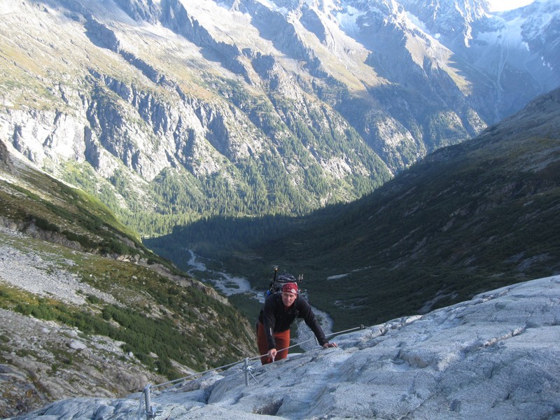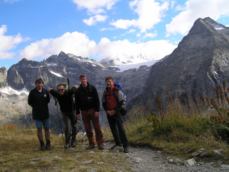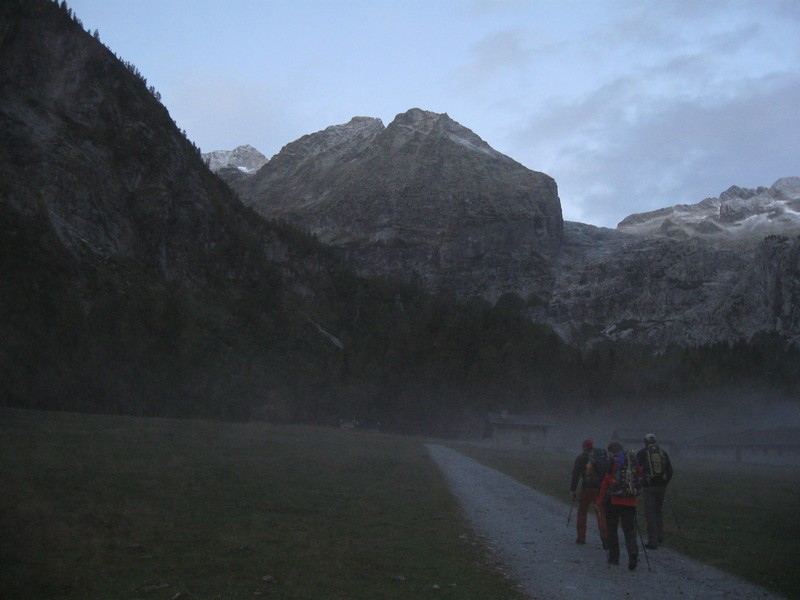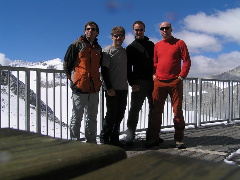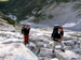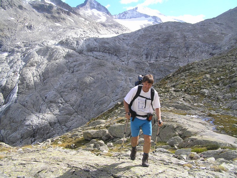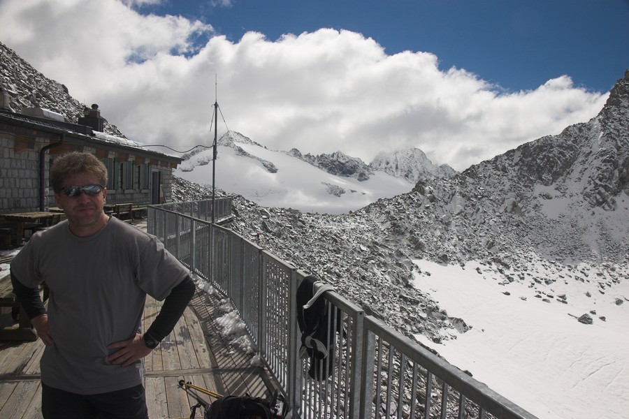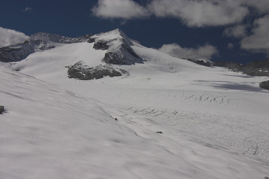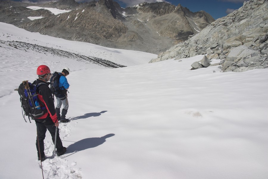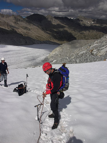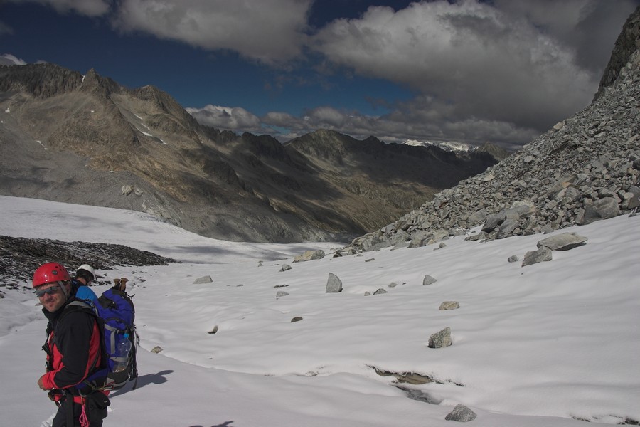 Poslední pátý den vstáváme velmi brzy. Autem se přesouváme daleko k Val Genova. Kolem šesté jsme Malga Bedole 1584m, kde za šera vyrážíme po "medvědích" stezkách, přes husté porosty a cesty s velkými vlhkými balvany po cestě Sentiero del Matarot. Pomalu stoupáme, je to nekonečné, opuštíme porost a obdivujeme hloubku tohoto údolí. Stoupání je stále ostřejší, tu se jde podél koryta vodopádu, tu po sněhu. Nakonec po pár hodinách dorazíme k ledovci, kde však ztrácíme značku a tak zvolíme postup azimutem směrem k Rif.Lobbia Alta 3050m přes suťovisko s metrovými kameny namísto postupu spodem přes sněhový okraj ledovce. Tato špatná volba nás stála hodinu času. Okolí bylo úchvatné v záři slunce a modré oblohy. Nasazujem mačky, navázání na lano a pomalu asi hodinu sestupujeme v čele s Petrem J. po ledovci Vedretta dei Mandron. Cesta je lehce vrásčitá bez komplikací, výrazné trhliny jsou jak bylo vidět, v jiných částech mimo náš sestup. Po rovinaté hodince cesty dorazíme k Rif.Mandrone 2450m. Odtud nás čeká již jen přes dvě hodiny dlouhý sestup k Rif.Bedole. V závěru cesty dolů mně vypověděla službu moje kolena. Byla to nejdelší naše celodenní túra v Dolomitech. |