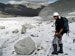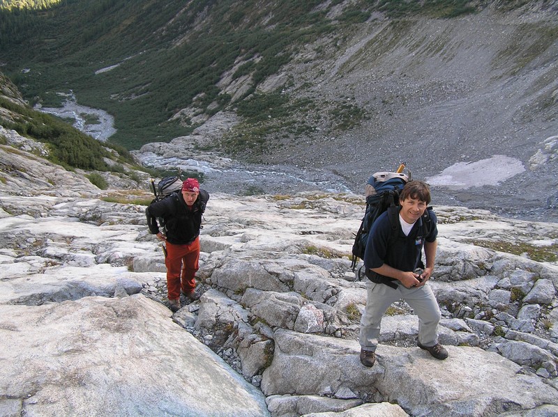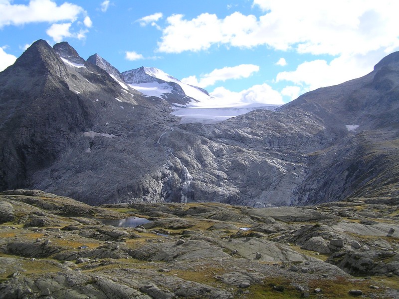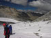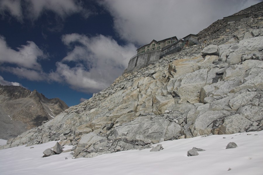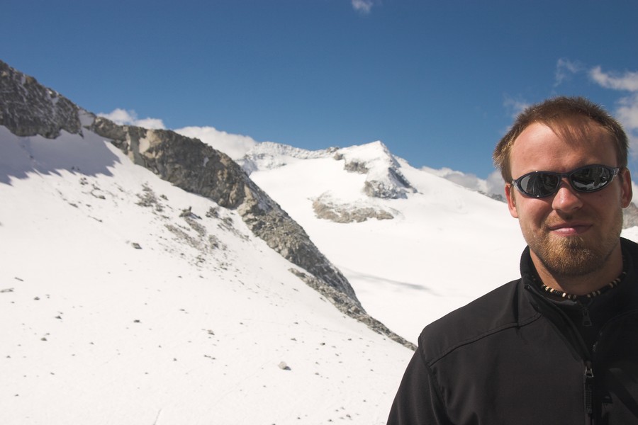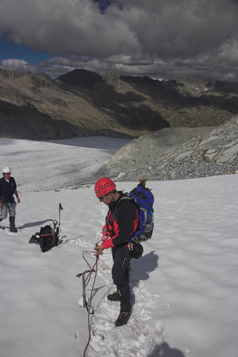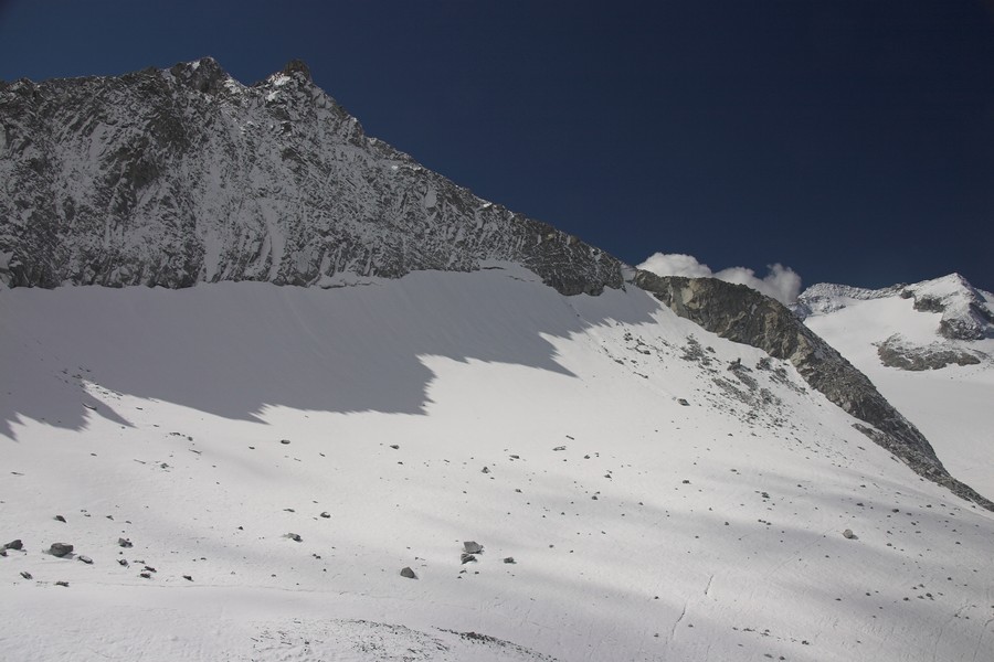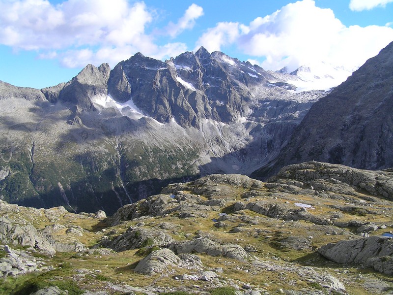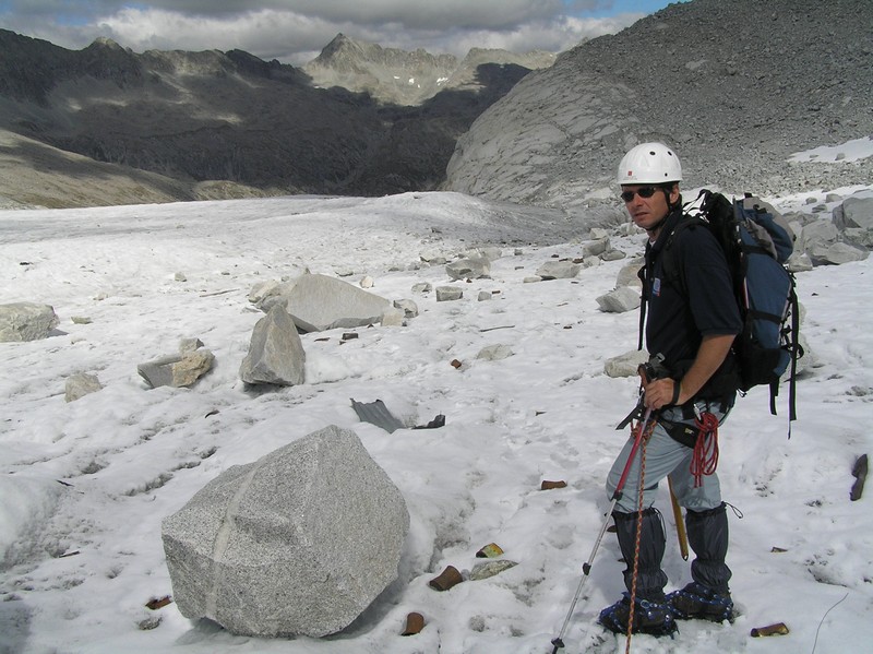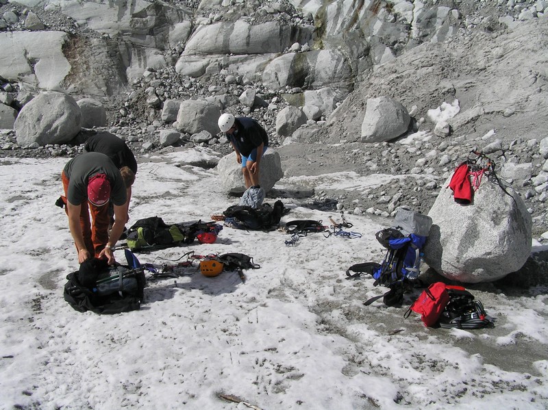 Poslední pátý den vstáváme velmi brzy. Autem se přesouváme daleko k Val Genova. Kolem šesté jsme Malga Bedole 1584m, kde za šera vyrážíme po "medvědích" stezkách, přes husté porosty a cesty s velkými vlhkými balvany po cestě Sentiero del Matarot. Pomalu stoupáme, je to nekonečné, opuštíme porost a obdivujeme hloubku tohoto údolí. Stoupání je stále ostřejší, tu se jde podél koryta vodopádu, tu po sněhu. Nakonec po pár hodinách dorazíme k ledovci, kde však ztrácíme značku a tak zvolíme postup azimutem směrem k Rif.Lobbia Alta 3050m přes suťovisko s metrovými kameny namísto postupu spodem přes sněhový okraj ledovce. Tato špatná volba nás stála hodinu času. Okolí bylo úchvatné v záři slunce a modré oblohy. Nasazujem mačky, navázání na lano a pomalu asi hodinu sestupujeme v čele s Petrem J. po ledovci Vedretta dei Mandron. Cesta je lehce vrásčitá bez komplikací, výrazné trhliny jsou jak bylo vidět, v jiných částech mimo náš sestup. Po rovinaté hodince cesty dorazíme k Rif.Mandrone 2450m. Odtud nás čeká již jen přes dvě hodiny dlouhý sestup k Rif.Bedole. V závěru cesty dolů mně vypověděla službu moje kolena. Byla to nejdelší naše celodenní túra v Dolomitech. |
