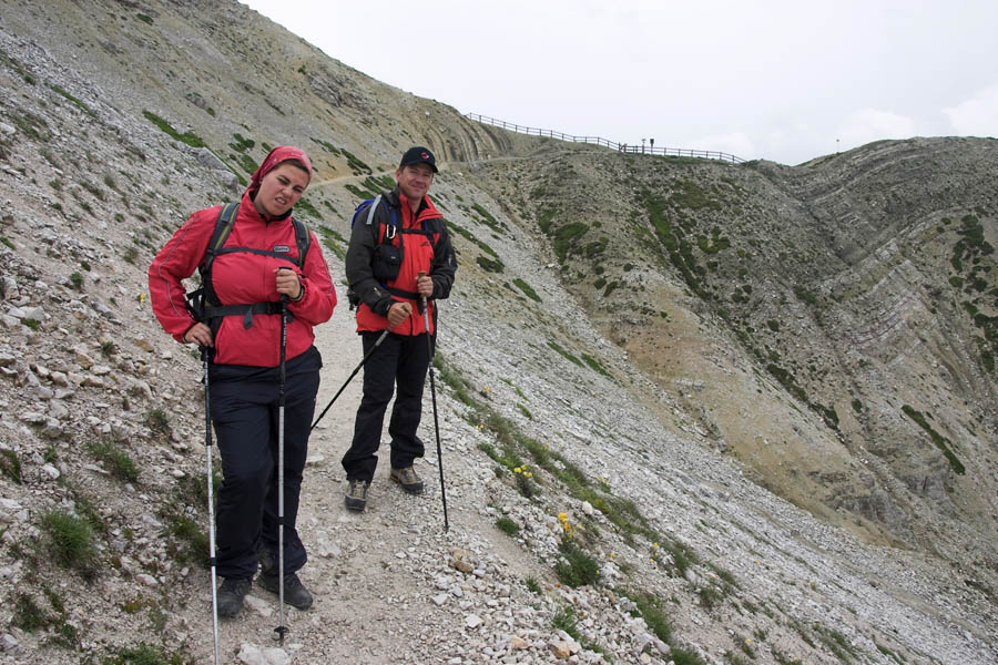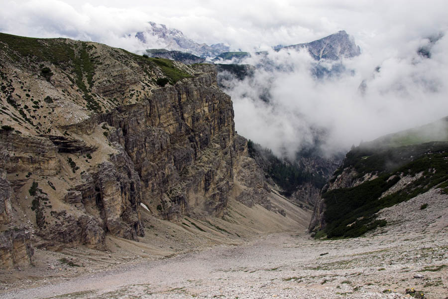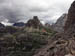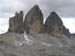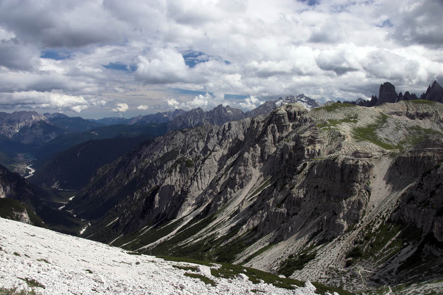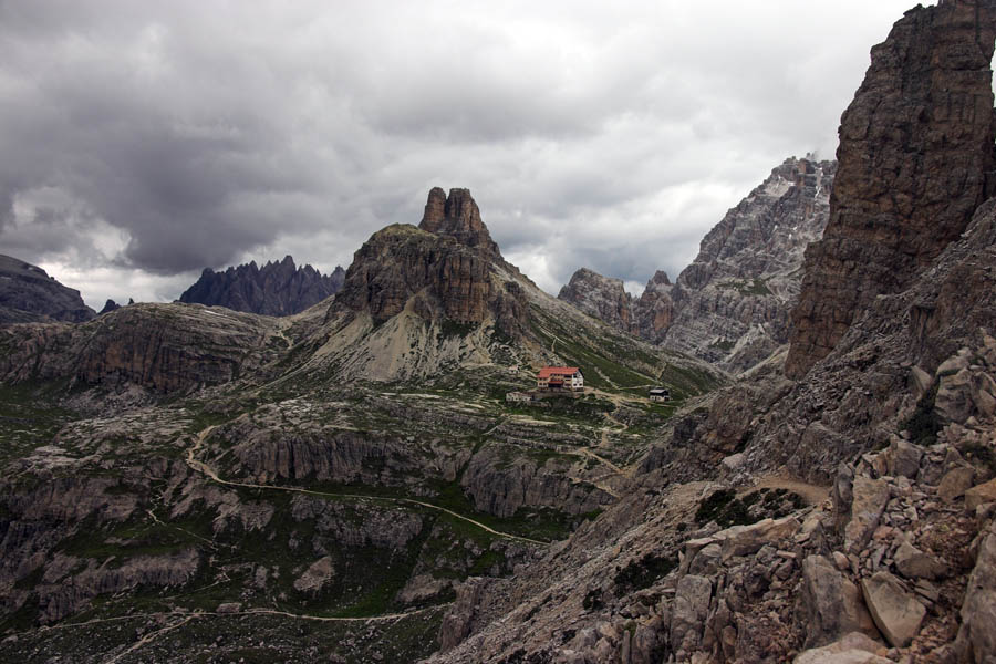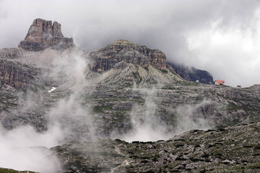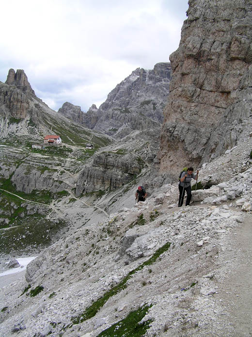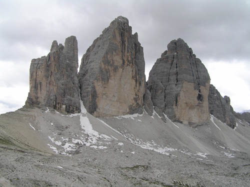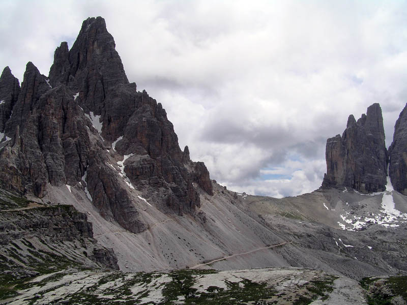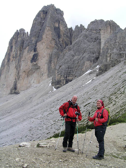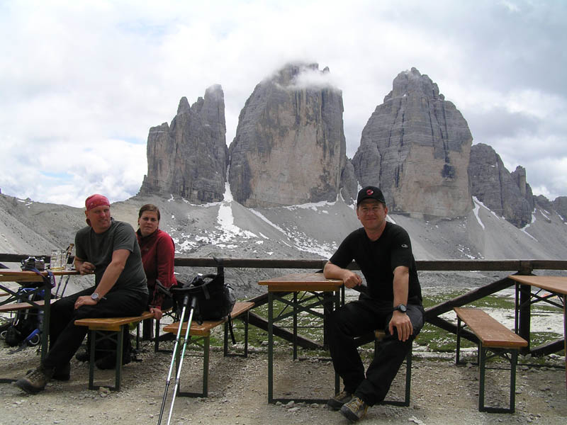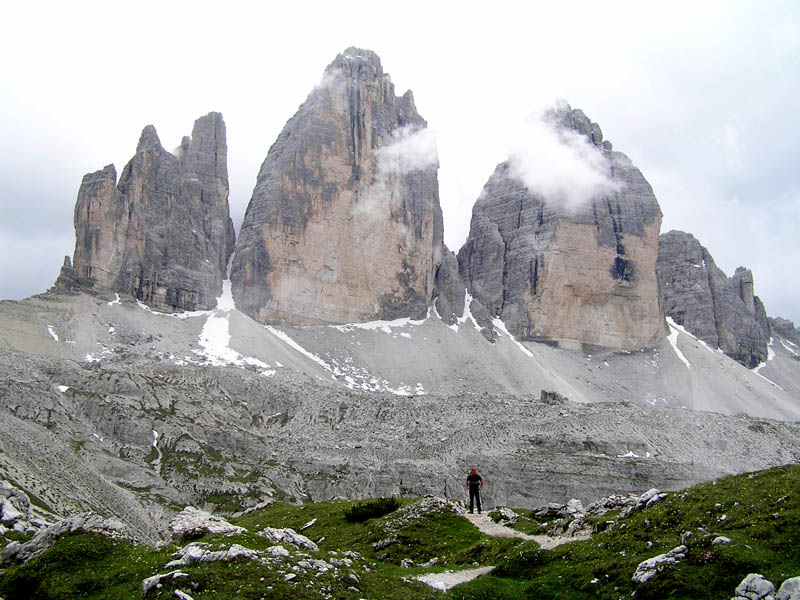Na druhý den mělo být poměrně deštivo a tak volíme náhradní plán, okružní cestu kolem Tre Cime di Lavaredo 2999m ( Drei Zinnen ) neodmyslitelnou dominantou této oblasti. Zážitek číslo jedna - na mýtnici jsme osobně viděli Reinholda Messnera !! Z poměrně vysoko položeného parkoviště u Rif. Auronzo 2320m ( Auronzo Hütte ) vyrážíme pod šedou nevlídnou oblohou po cestě 105 směrem na Rif. Locatelli 2405m ( Drei Zinnen Hütte ) . Během cesty v těsné blízkosti si vychutnáváme pohled na masivní skalní věže. Obloha se trhá, tu a tam se tu objeví slunko. Cesta utíká rychle a za nedlouho jsme na chatě. Výhoda období června spočívá v tom, že hory jsou skoro liduprázdné. Zde posedíme a kocháme se okolím, které se střídavě odkrývá z mraků. Přeci jenom dnes máme spoustu času. Kdyby nebyly avizivány bouřky, vydali bychom se navíc přes Via ferrata De Luca na Monte Paterno ( Paternkofel 2744m ), ale takto jsme nebrali s sebou vybavení. Vyrážíme zpět cestou pod Monte Paterno v silnějším větru směrem do nedalekého sedla. Pod námi v sestupu vidíme Rif. Lavaredo 2385m ( Lavaredo Hütte )a odtud již cesta utekla rychle až k autu. Byla to malá odpočinková túra k regeneraci sil. |