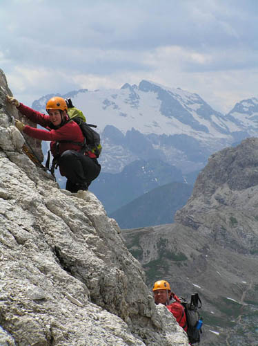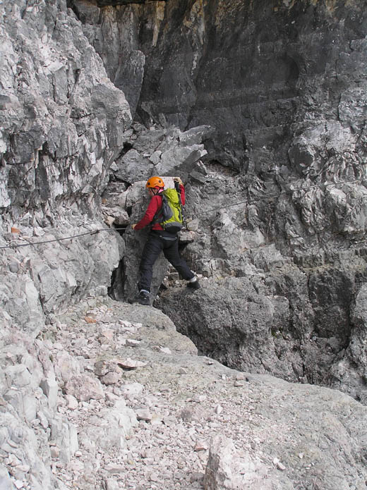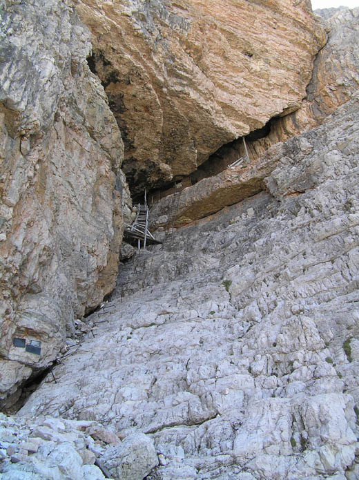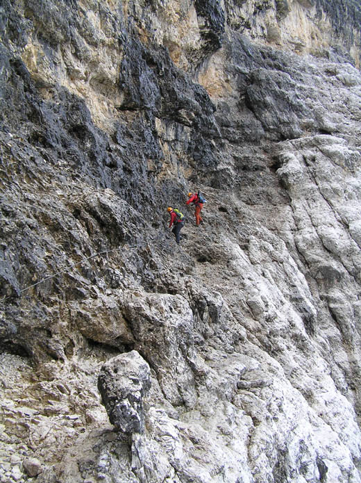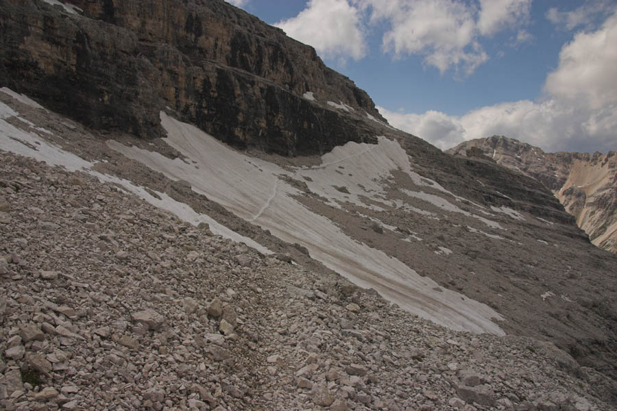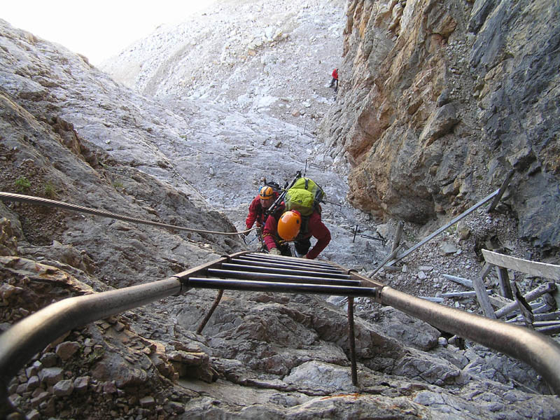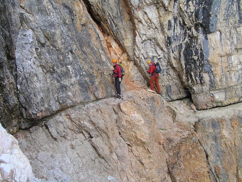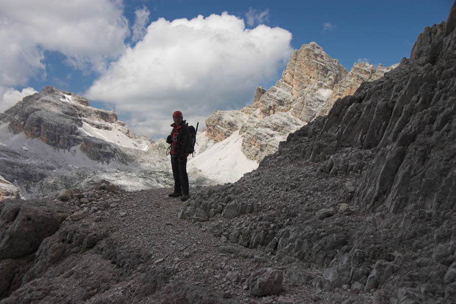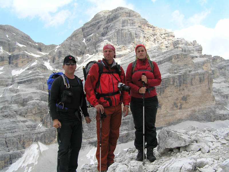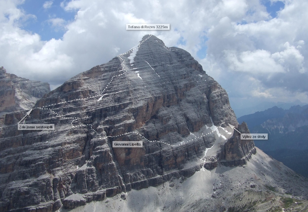 Třetí den vyrážíme na očekávanou ferratu Giovanni Lipella, jenž skalním masivem vede až na Tofana di Rozes 3225m. Počasí nám přeje. Avizované zbytky sněhu v červnu na hřebenu před vrcholem nás přimějí vzít s sebou mačky i cepín. Z parkoviště od Rif. A. Dibona 2050m začínáme stoupat pod jižní stěnu Tofany, kterou postupně obcházíme až k několika stovek metrů dlouhé štole z dob první světové války. Výstup z čelovkami byl pěkný zážitek. Štolou v podstatě začíná ferrata, která převážně po výlezu prudce stoupá a traverzuje po západním hřbetu Tofany až k Tre Dita 2694m, což bylo i místem, kam jsme nakonec došli a poté se rozhodli s časových důvodů o sestup k Rif. Giussani 2580m a nikoli o zbytek ferraty a výstupu na vrchol. Některé úseky ferraty byly přeci jenom silovější a strmější a tak postup nebyl nejrychlejší. Byli jsme i asi pomalí, postupně nás předběhly asi tři party. Nevědomí o délce, reálné obtížnosti závěru ferraty vyvolalo pochyby a obavy ze zdolání posledních úseků, zejména pro naši Verču. Od Tre Dita klesáme do sedla k Rif. Giussani, kde též míjíme bohaté zbytky staveb z dob válečných. Po necelých dvou hodinkách příjemné sestupové cesty jsme zpět na parkovišti. |