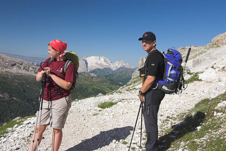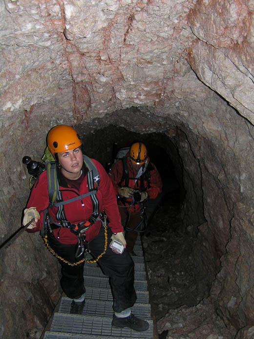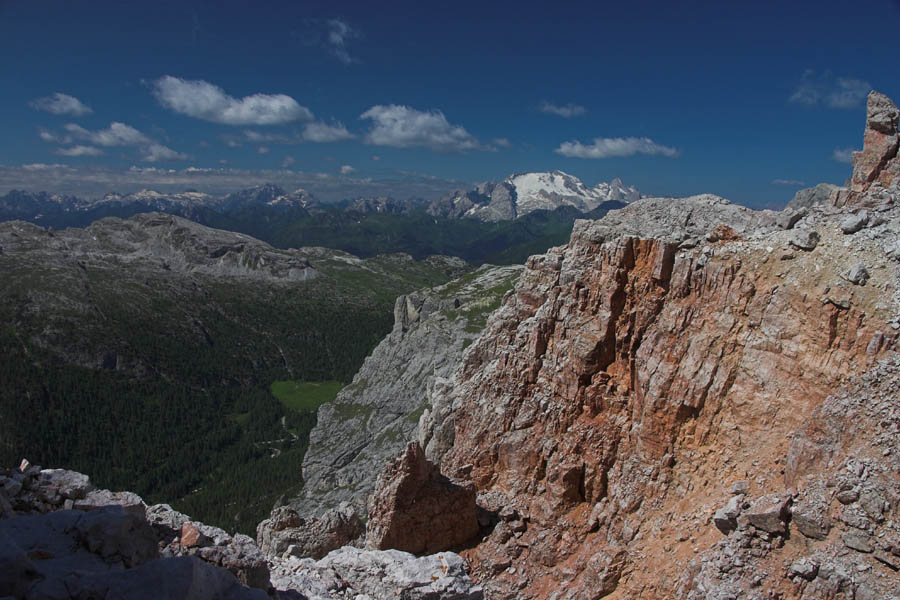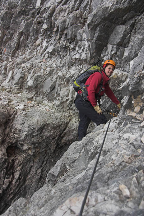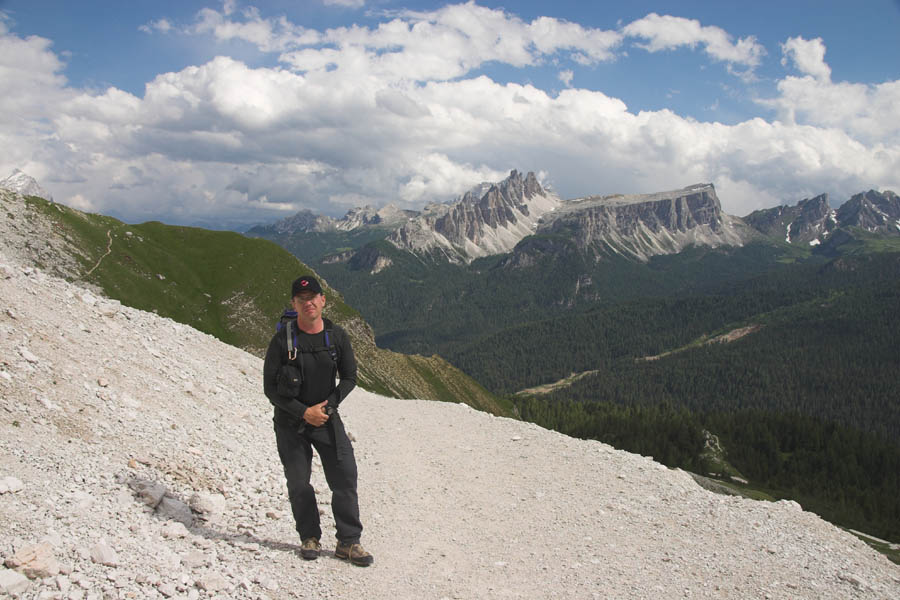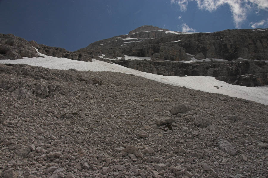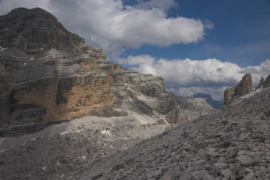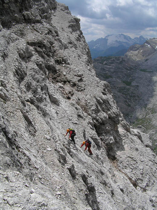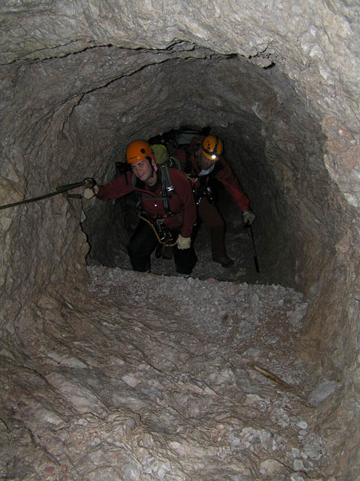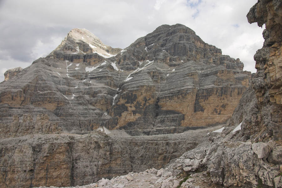 Třetí den vyrážíme na očekávanou ferratu Giovanni Lipella, jenž skalním masivem vede až na Tofana di Rozes 3225m. Počasí nám přeje. Avizované zbytky sněhu v červnu na hřebenu před vrcholem nás přimějí vzít s sebou mačky i cepín. Z parkoviště od Rif. A. Dibona 2050m začínáme stoupat pod jižní stěnu Tofany, kterou postupně obcházíme až k několika stovek metrů dlouhé štole z dob první světové války. Výstup z čelovkami byl pěkný zážitek. Štolou v podstatě začíná ferrata, která převážně po výlezu prudce stoupá a traverzuje po západním hřbetu Tofany až k Tre Dita 2694m, což bylo i místem, kam jsme nakonec došli a poté se rozhodli s časových důvodů o sestup k Rif. Giussani 2580m a nikoli o zbytek ferraty a výstupu na vrchol. Některé úseky ferraty byly přeci jenom silovější a strmější a tak postup nebyl nejrychlejší. Byli jsme i asi pomalí, postupně nás předběhly asi tři party. Nevědomí o délce, reálné obtížnosti závěru ferraty vyvolalo pochyby a obavy ze zdolání posledních úseků, zejména pro naši Verču. Od Tre Dita klesáme do sedla k Rif. Giussani, kde též míjíme bohaté zbytky staveb z dob válečných. Po necelých dvou hodinkách příjemné sestupové cesty jsme zpět na parkovišti. |