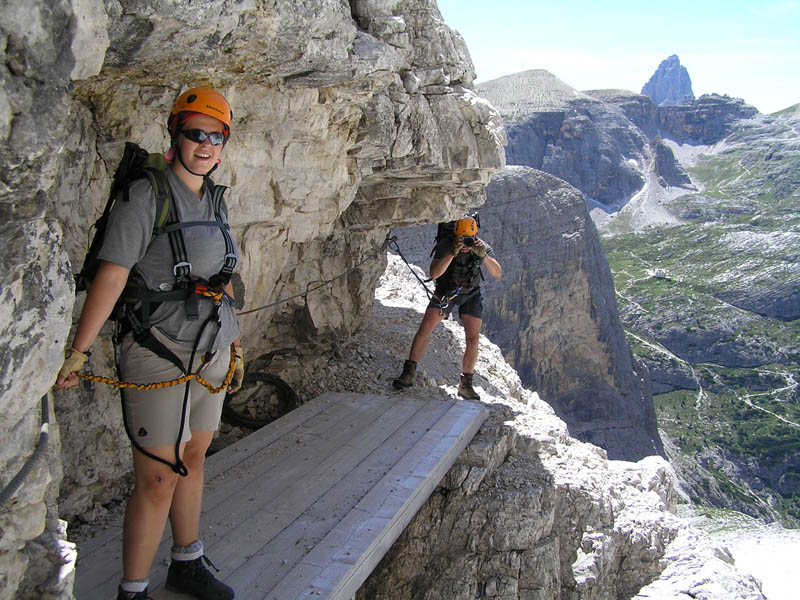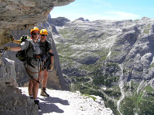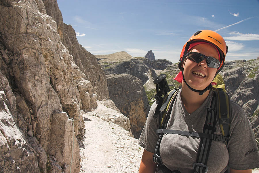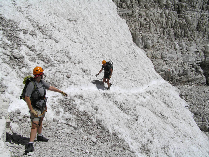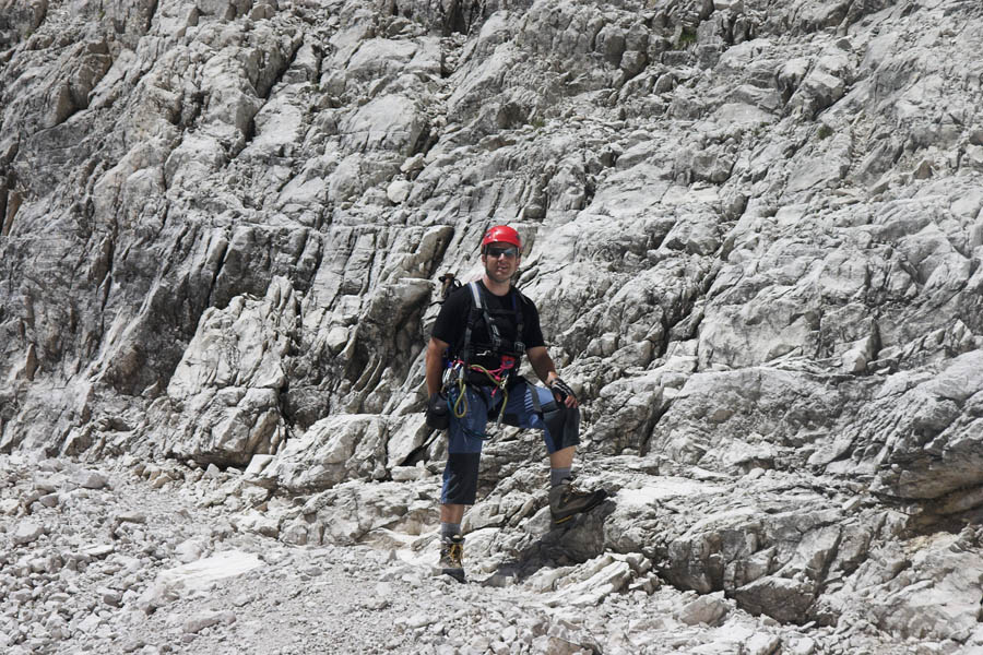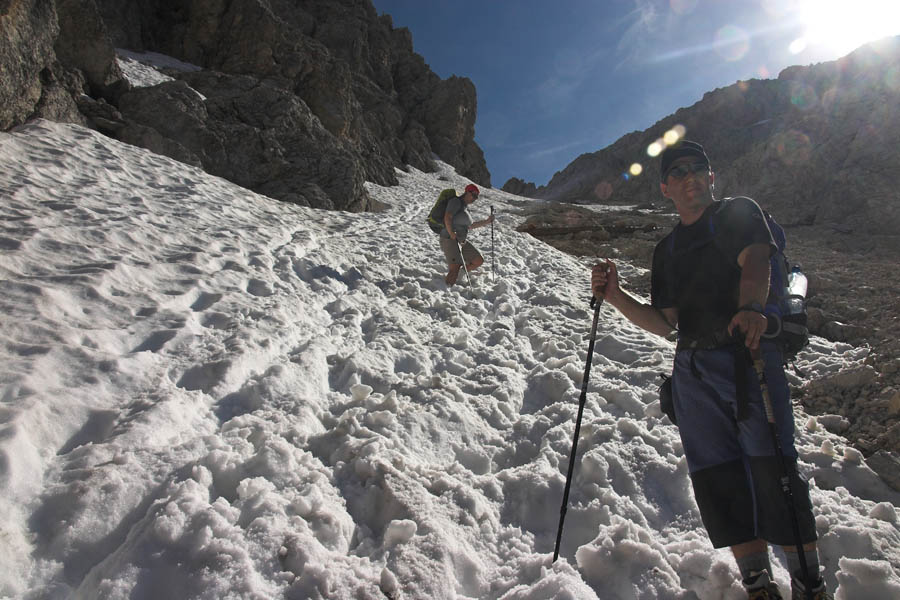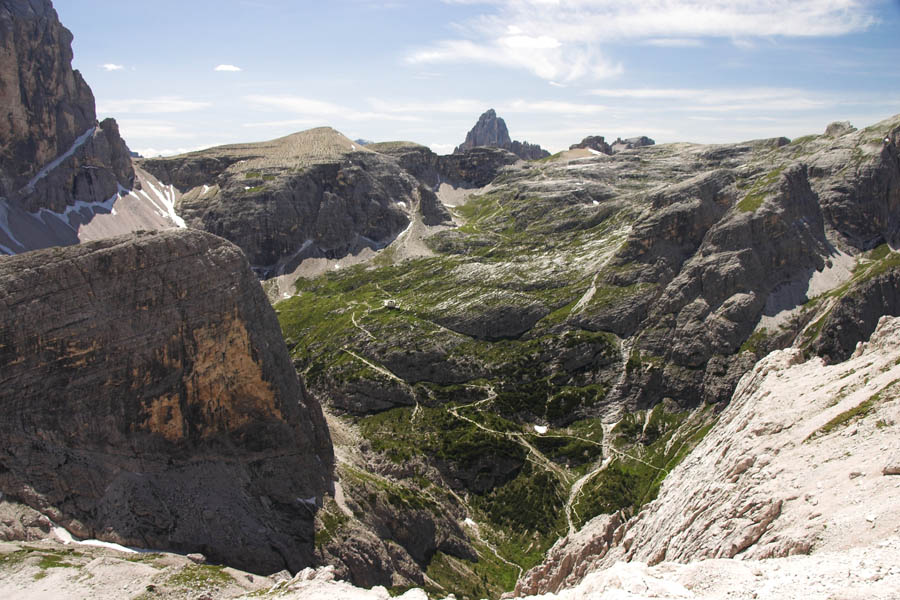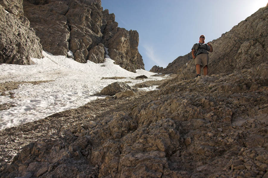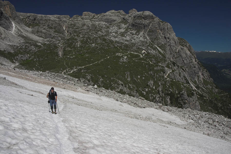 Prvního dne je na plánu oblíbená panoramatická ferrata Apinisteig. Počasí bude velmi slunečné. Pozvolna stoupáme od parkoviště u Piano Fiscalino 1450m. Vyrážíme vcelku časně ráno údolím přes Rif. Fondo Valle Fiscalina 1540m, za níž se cesta vklíní do údolí a začne rychleji stoupat a po dvou hodinkách jsme až na samotné Rif. Zsigmondy Comici 2224m. Po malé pauze opět stoupáme po zbytcích sněhu pod masivem Cima Dodici 3094m směrem k sedlu Giralba, před ním však odbočíme a kolem jezera zamíříme vlevo k masivu Cima Undici. Hůře značená cesta a Petrovo mylné přesvědčení o nástupu k ferratě nás zavedlo jinam a tak jsme se museli vrátit a nabrali tak půl druhé hodiny. Z ferraty je vidět celé údolí. Pár úseků se zbytkem sněhu se snadno zvládlo díky zajištění a jinak traverzující a mírně v závěru stoupající cesta nebyla nikterak technicky složitá. Poskytne úžasné pohledy po celém okolí. Z posledního rozcestí v sedle Undici 2649m před sedlem Sentinella klesneme opravdu prudkým suťoviskem a sněhem zkratkou dolů. Krájíme metry po desítkách a nápor na kolena začníná sílit. Nakonec volíme v půli mírnější a delší sestup po 124 obcházející hřeben lesním porostem. Po šesté jsme zpět u auta. |