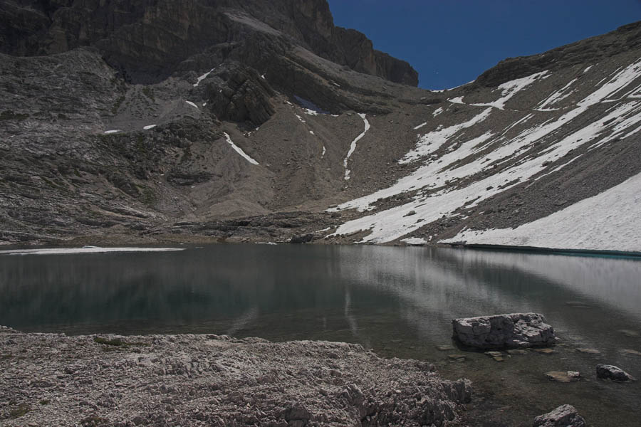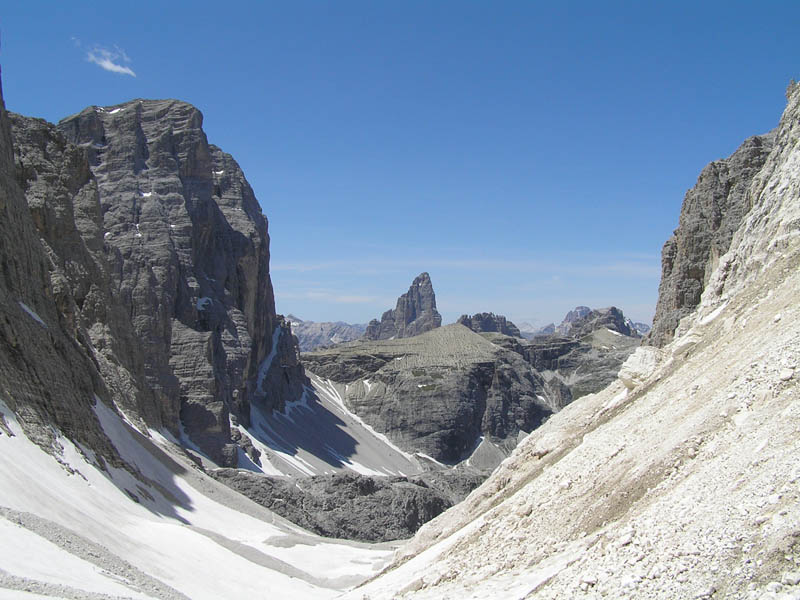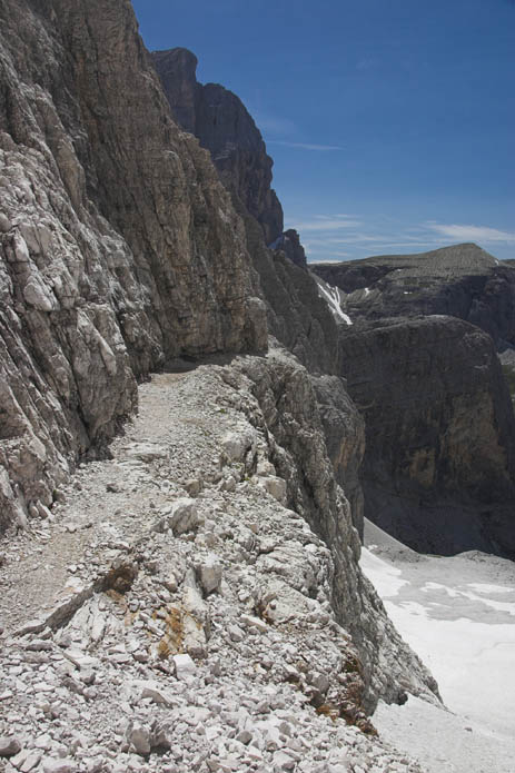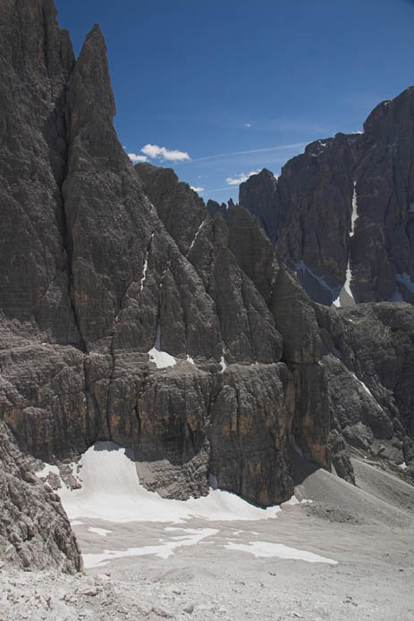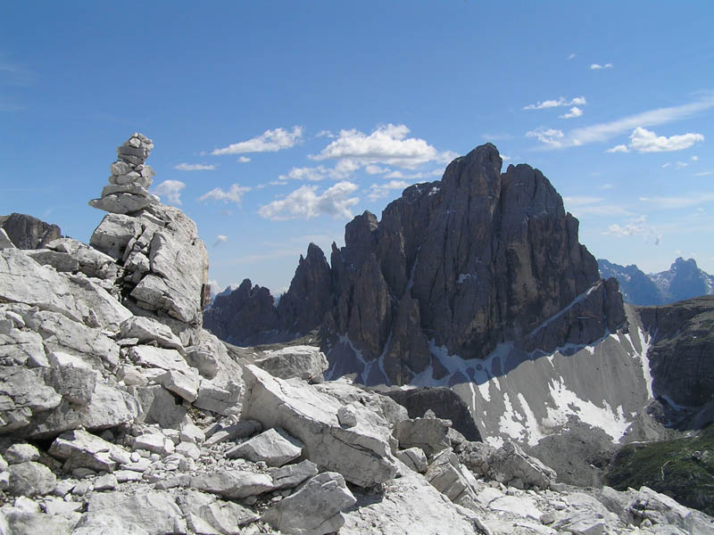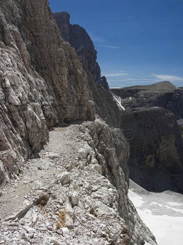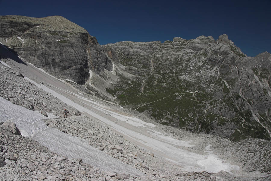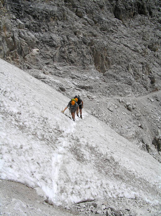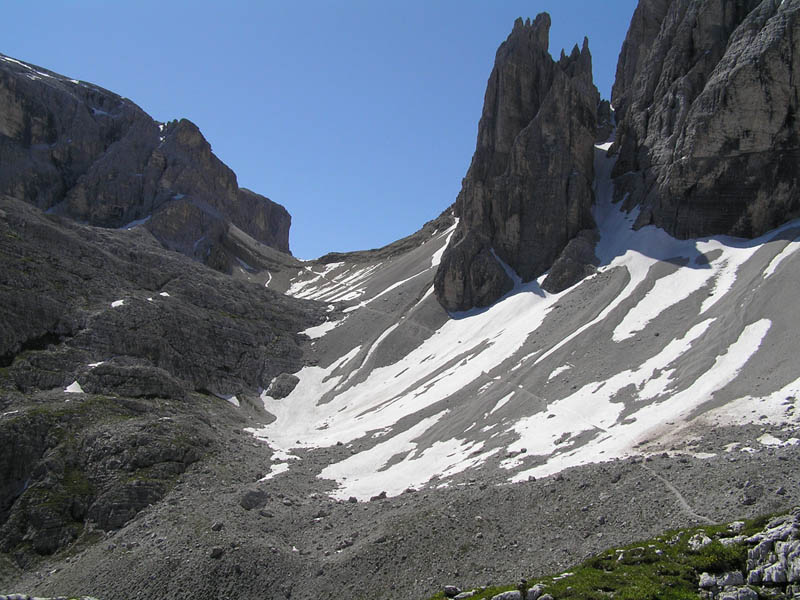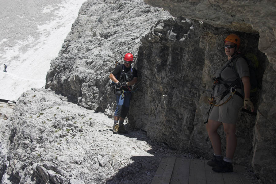 Prvního dne je na plánu oblíbená panoramatická ferrata Apinisteig. Počasí bude velmi slunečné. Pozvolna stoupáme od parkoviště u Piano Fiscalino 1450m. Vyrážíme vcelku časně ráno údolím přes Rif. Fondo Valle Fiscalina 1540m, za níž se cesta vklíní do údolí a začne rychleji stoupat a po dvou hodinkách jsme až na samotné Rif. Zsigmondy Comici 2224m. Po malé pauze opět stoupáme po zbytcích sněhu pod masivem Cima Dodici 3094m směrem k sedlu Giralba, před ním však odbočíme a kolem jezera zamíříme vlevo k masivu Cima Undici. Hůře značená cesta a Petrovo mylné přesvědčení o nástupu k ferratě nás zavedlo jinam a tak jsme se museli vrátit a nabrali tak půl druhé hodiny. Z ferraty je vidět celé údolí. Pár úseků se zbytkem sněhu se snadno zvládlo díky zajištění a jinak traverzující a mírně v závěru stoupající cesta nebyla nikterak technicky složitá. Poskytne úžasné pohledy po celém okolí. Z posledního rozcestí v sedle Undici 2649m před sedlem Sentinella klesneme opravdu prudkým suťoviskem a sněhem zkratkou dolů. Krájíme metry po desítkách a nápor na kolena začníná sílit. Nakonec volíme v půli mírnější a delší sestup po 124 obcházející hřeben lesním porostem. Po šesté jsme zpět u auta. |