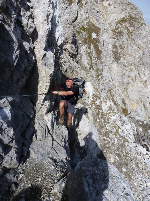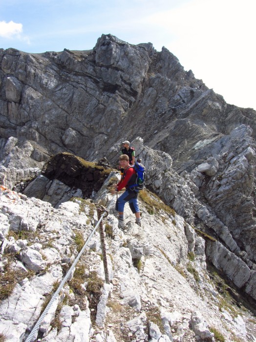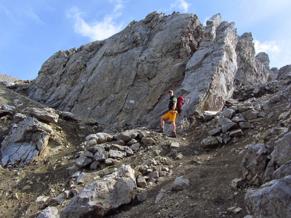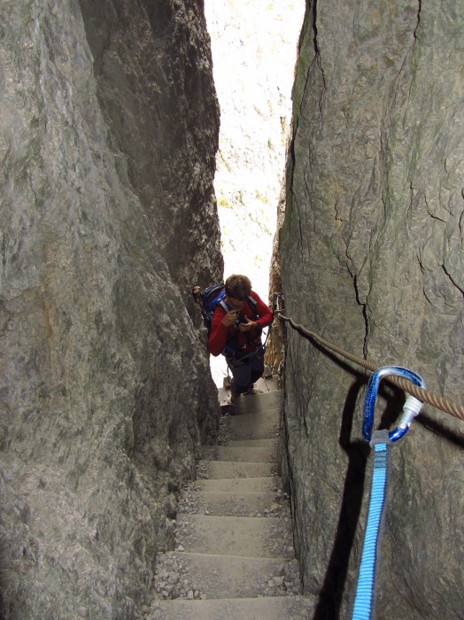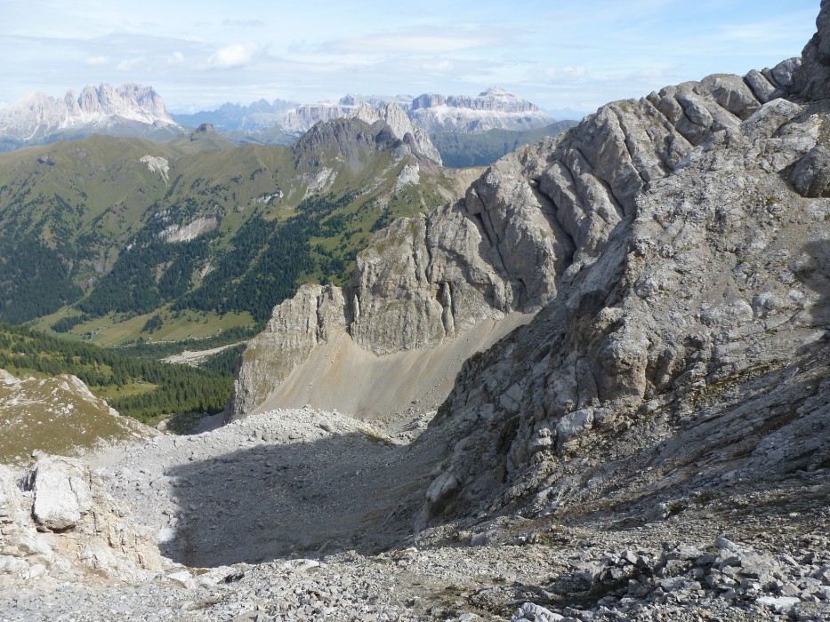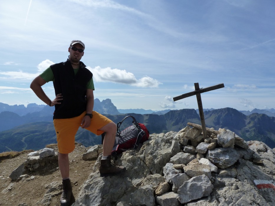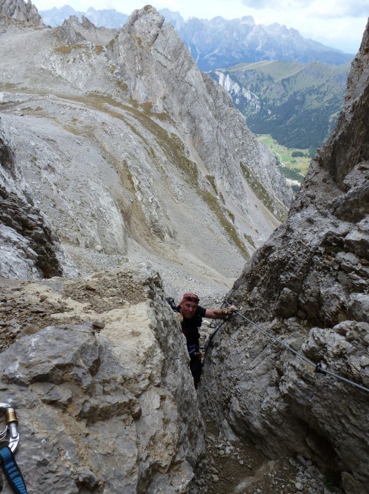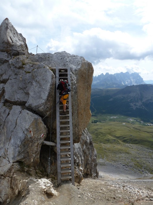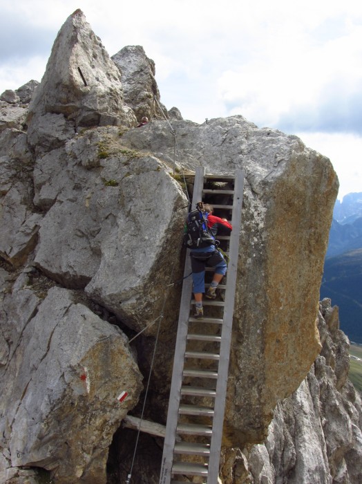 Poslední náš den, volíme ryze odpočinkovou trasu. Z Passo di S.Pellegrino 1900m, kam jsme museli opět dojet autem, vyjíždíme sedačkovou lanovkou na Rif. Paradiso 2170m. Odsud pod táhlým hřebenem osvětleným sluncem stoupáme do sedla s chatou Rif. P.so d. Selle 2528m. Po krátké pauze a pivečku, začínáme prudce stoupat na hřeben s ferratou Bepi Zac, což je hřebenová cesta po válečné linii první světové války, plná zákopů, střílen, zbytků příbytků a jiných svědků tehdejších bojů. Brzy procházíme nejprve přes vrchol Laste Gran 2716m a poté i Cima dela Costabela 2762m, na kterém jsme si dali delší pohodovou pauzu na slunci. Asi hodinku. Nádherně zde bylo vidět na včerejší vrchol Marmolady, dnes bez mráčku. Poobědvali jsme a vyrazili dále. Konečně dorážíme k místu, kde se snad dá použít i úvazek, jinak je cesta velmi snadná. Skalní tunely, žebříky a lana ferraty nás doprovázejí až na samotné sedlo Forcella de Ciadin 2664m, odkud již jen klesneme opět k lanovce. Původní záměr vyšplhat na Cimadell Uomo 3010m, jsme zavrhli, hůře značená cesta a čas odjezdu poslední lanovky nás hnal raději dolů. Ale stihnout by se to dalo. |