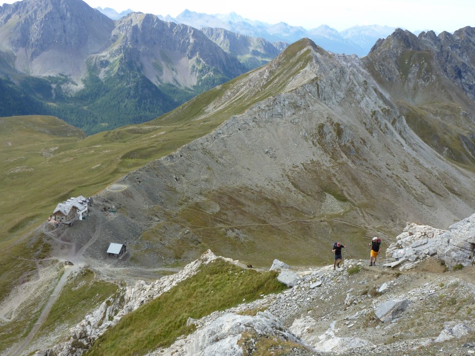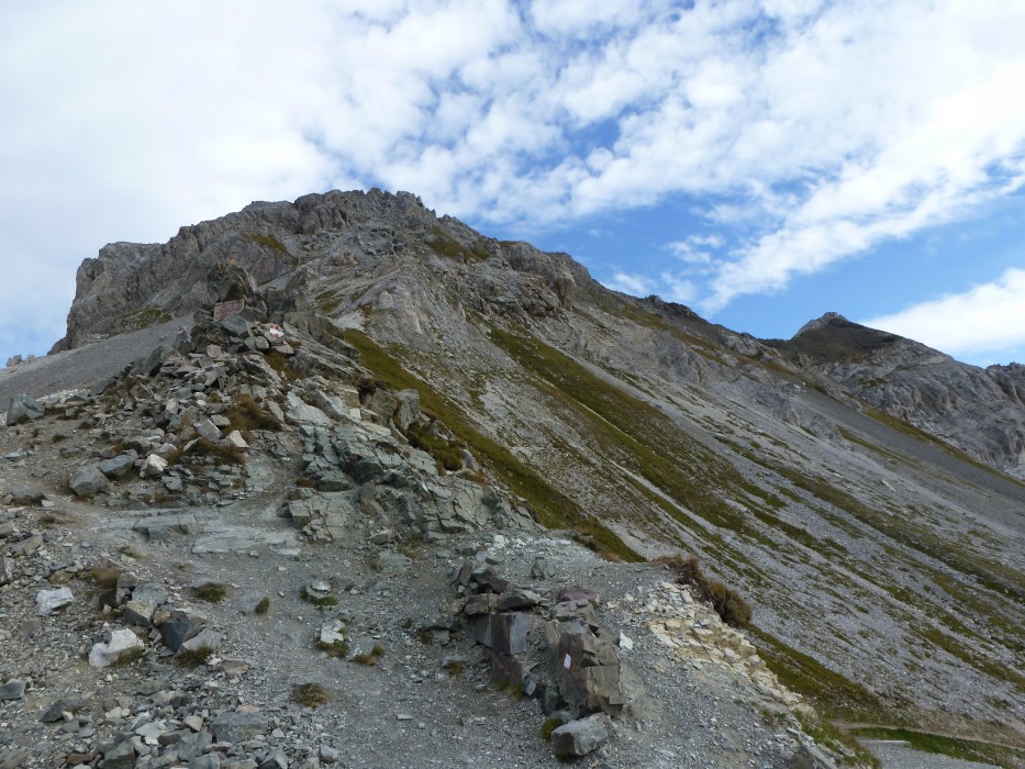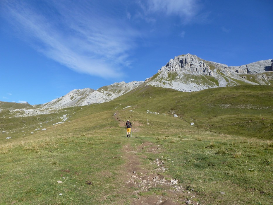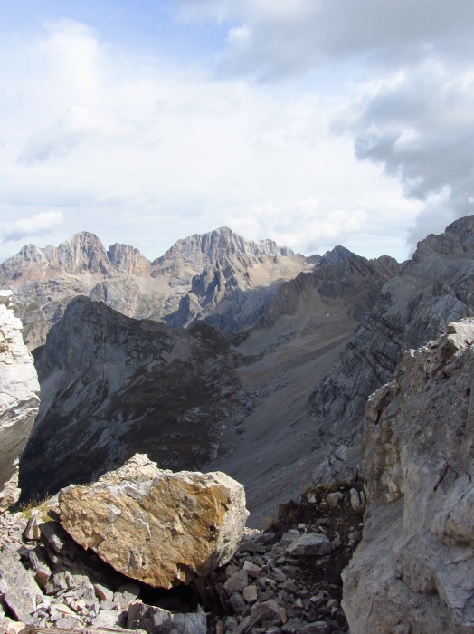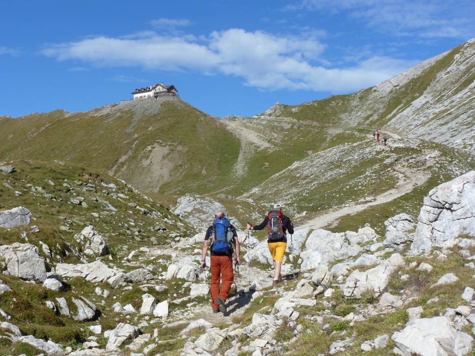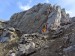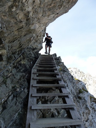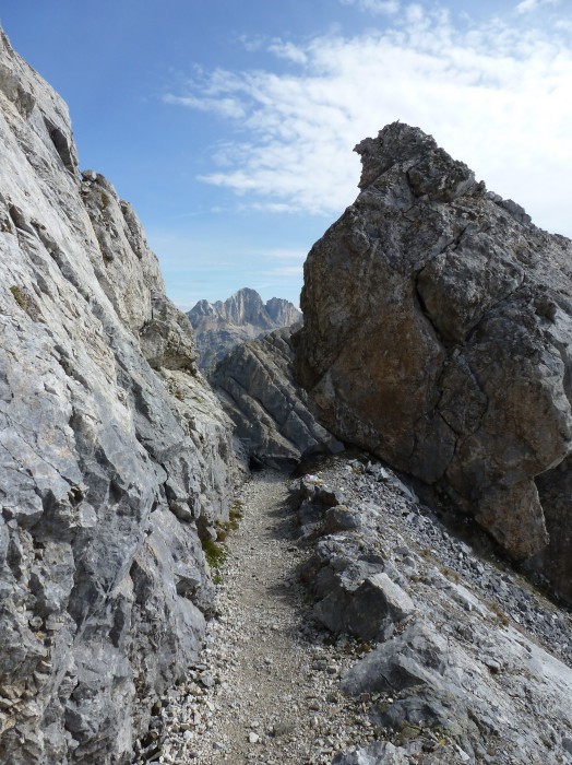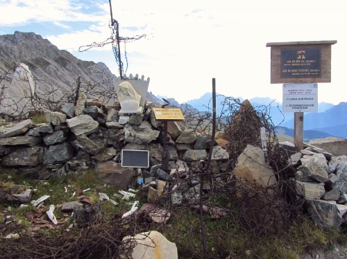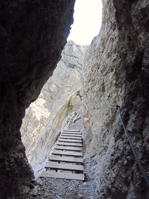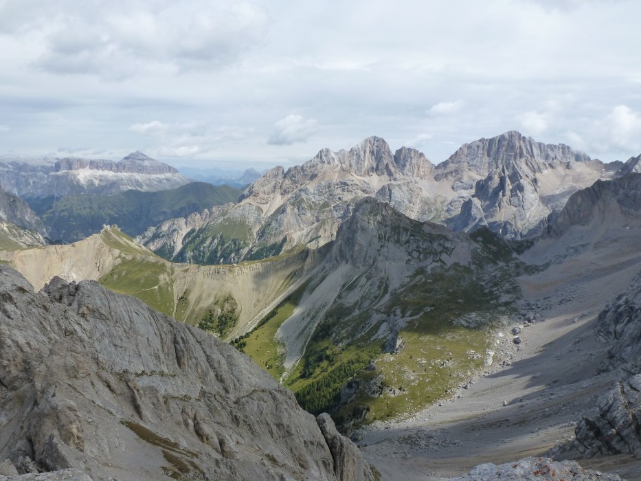 Poslední náš den, volíme ryze odpočinkovou trasu. Z Passo di S.Pellegrino 1900m, kam jsme museli opět dojet autem, vyjíždíme sedačkovou lanovkou na Rif. Paradiso 2170m. Odsud pod táhlým hřebenem osvětleným sluncem stoupáme do sedla s chatou Rif. P.so d. Selle 2528m. Po krátké pauze a pivečku, začínáme prudce stoupat na hřeben s ferratou Bepi Zac, což je hřebenová cesta po válečné linii první světové války, plná zákopů, střílen, zbytků příbytků a jiných svědků tehdejších bojů. Brzy procházíme nejprve přes vrchol Laste Gran 2716m a poté i Cima dela Costabela 2762m, na kterém jsme si dali delší pohodovou pauzu na slunci. Asi hodinku. Nádherně zde bylo vidět na včerejší vrchol Marmolady, dnes bez mráčku. Poobědvali jsme a vyrazili dále. Konečně dorážíme k místu, kde se snad dá použít i úvazek, jinak je cesta velmi snadná. Skalní tunely, žebříky a lana ferraty nás doprovázejí až na samotné sedlo Forcella de Ciadin 2664m, odkud již jen klesneme opět k lanovce. Původní záměr vyšplhat na Cimadell Uomo 3010m, jsme zavrhli, hůře značená cesta a čas odjezdu poslední lanovky nás hnal raději dolů. Ale stihnout by se to dalo. |