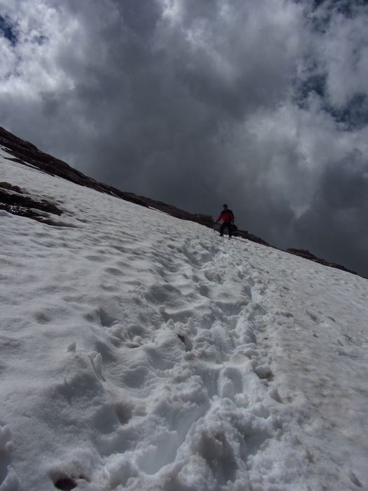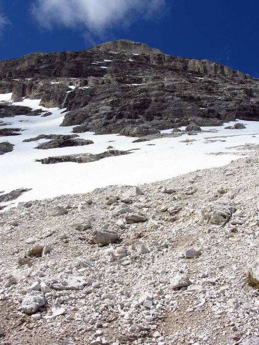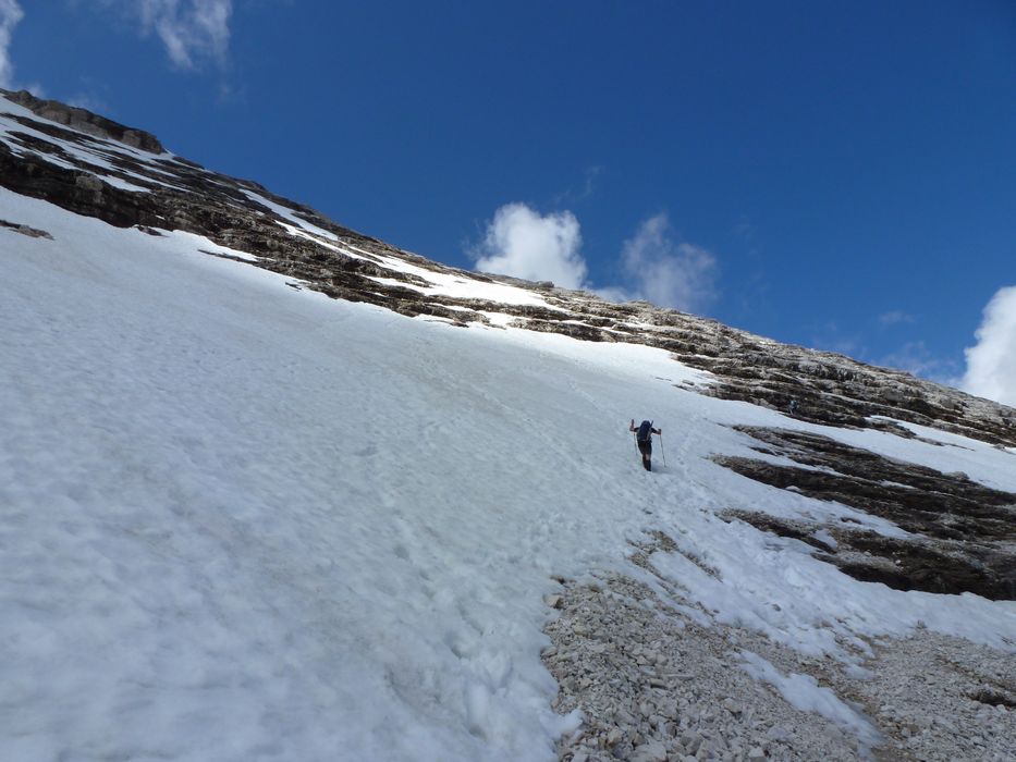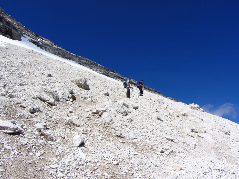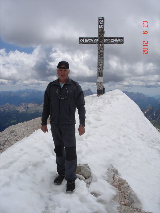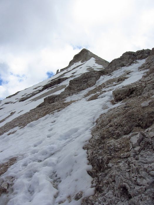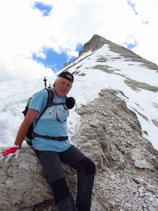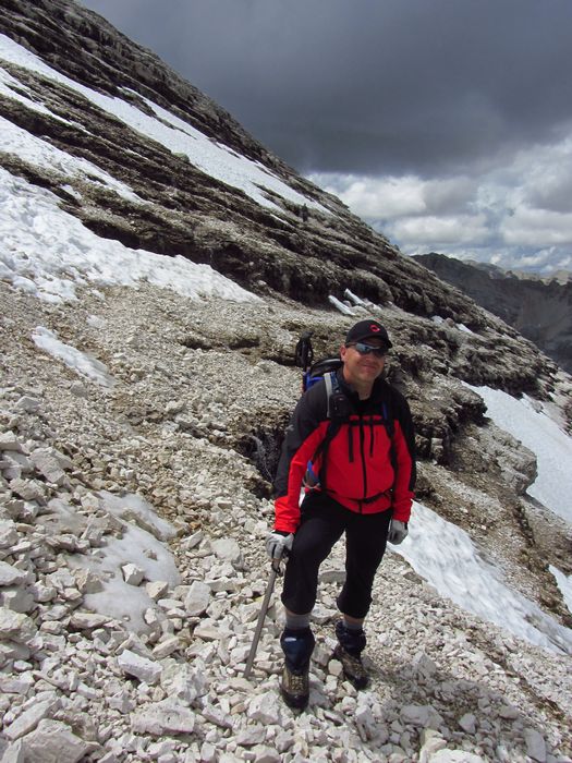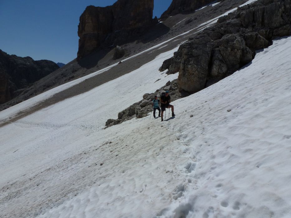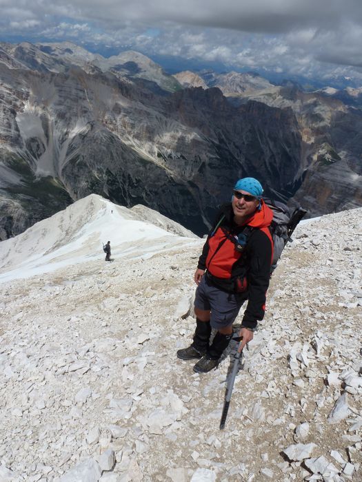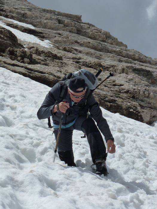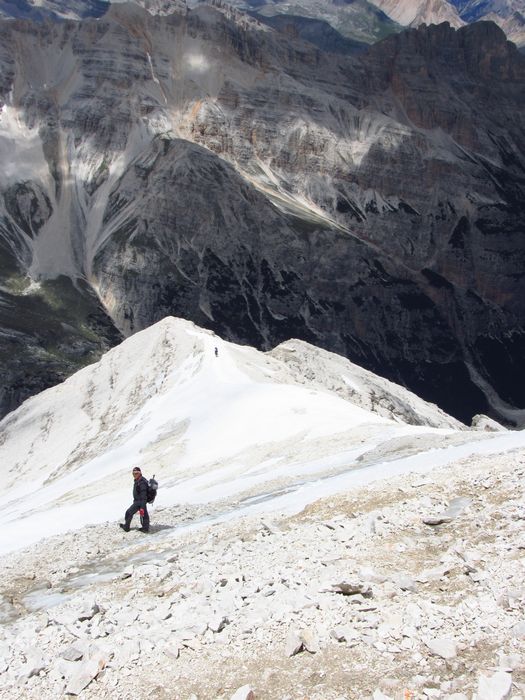 Druhý den je dnem výstupu na loni nedosažený vrchol Tofana di Rozes 3225m, klasickou cestou přes Rif. Giussani 2600m. Vyrážíme časně od Rif. A. Dibona 2050m . Lidí je zde málo, slunce svítí, stoupáme vcelku rychle a brzy jsme na chatě. Posedíme na terase a sledujeme vzdálenou dvojici na sněhovým polích, směr jejich cesty, kudy se asi i my budeme ubírat na vrchol. Bylo překvapením, že cesta je symbolicky značena modrými tečkami a tak po nich vyrážíme. Na prvním sněhu, který vůbec nebyl zmrzlý se boříme, postup je náročnější a riziko zranění je na místě při nečekaném propadu i přes půl metru. Nejprve lehce šikmo traverzujeme, pak stoupáme přes skalní ostrůvky meandrovitě směrem ke hřebenu. Dost se leze, ruce jsou potřeba, neboť to klouže po vlhké skále a tak uklízíme hole. S prvním sněhem na hřebenu a blyštícím se ledem pod ním s pomocí cepínu pomalu kráčíme po hraně vzhůru. Kolem poledne jsme na vrcholu u kříže a nabízí se nám úžasný pohled do okolí. Po krátké pauze sestupujeme, mraky se totiž honí. Sestup byl rychlý, místy těžší, sníh byl měkčí. Před třetí hodinou jsme zpět na chatě. Začíná lehce pršet. Po pauze a po stejné cestě jako ráno sklesáme dolů. V závěru nás dožene i déšť. |