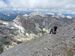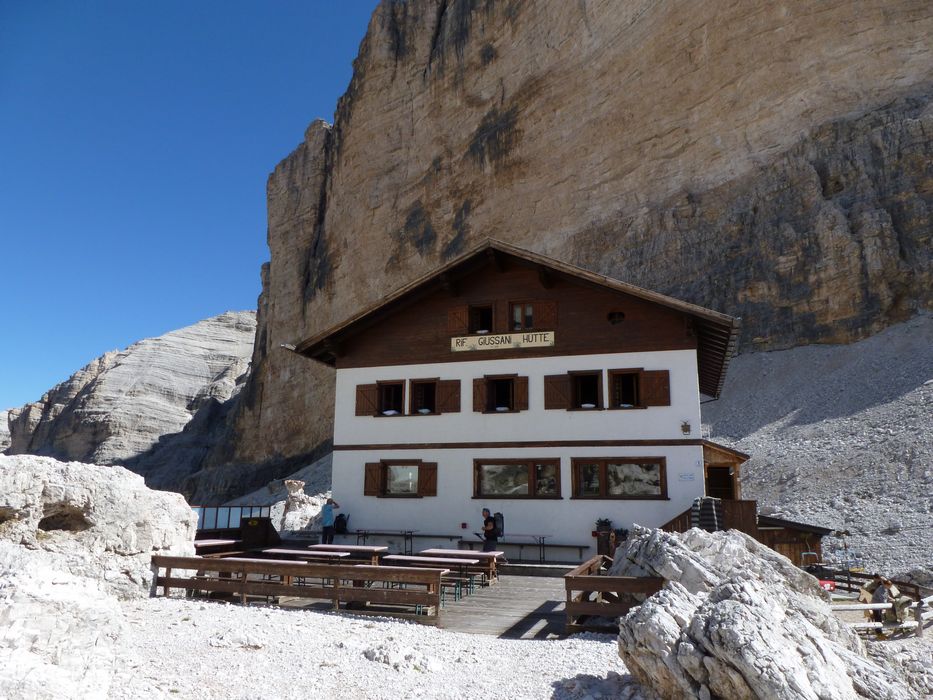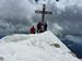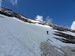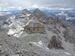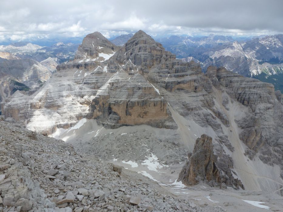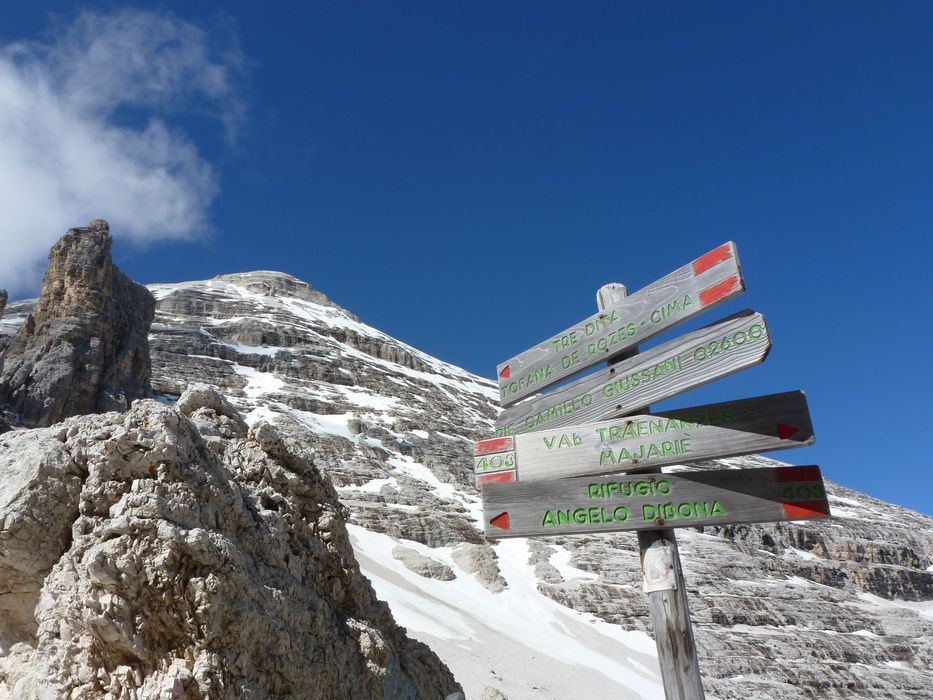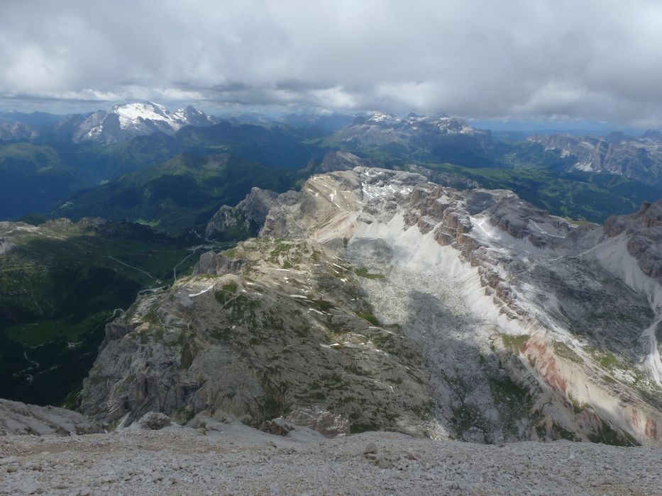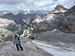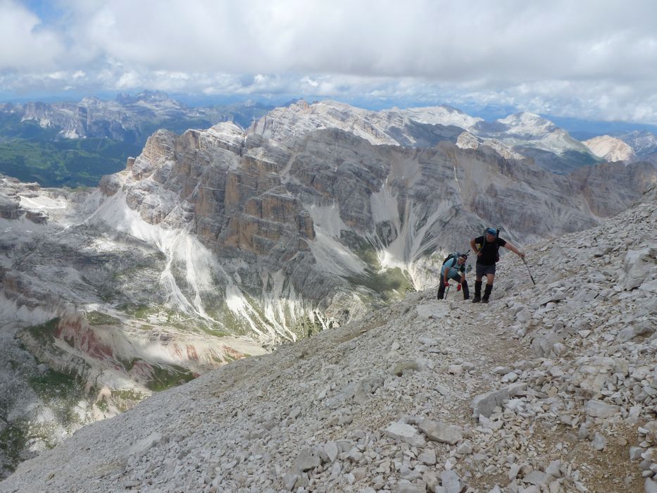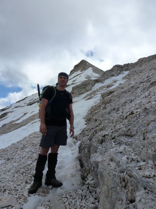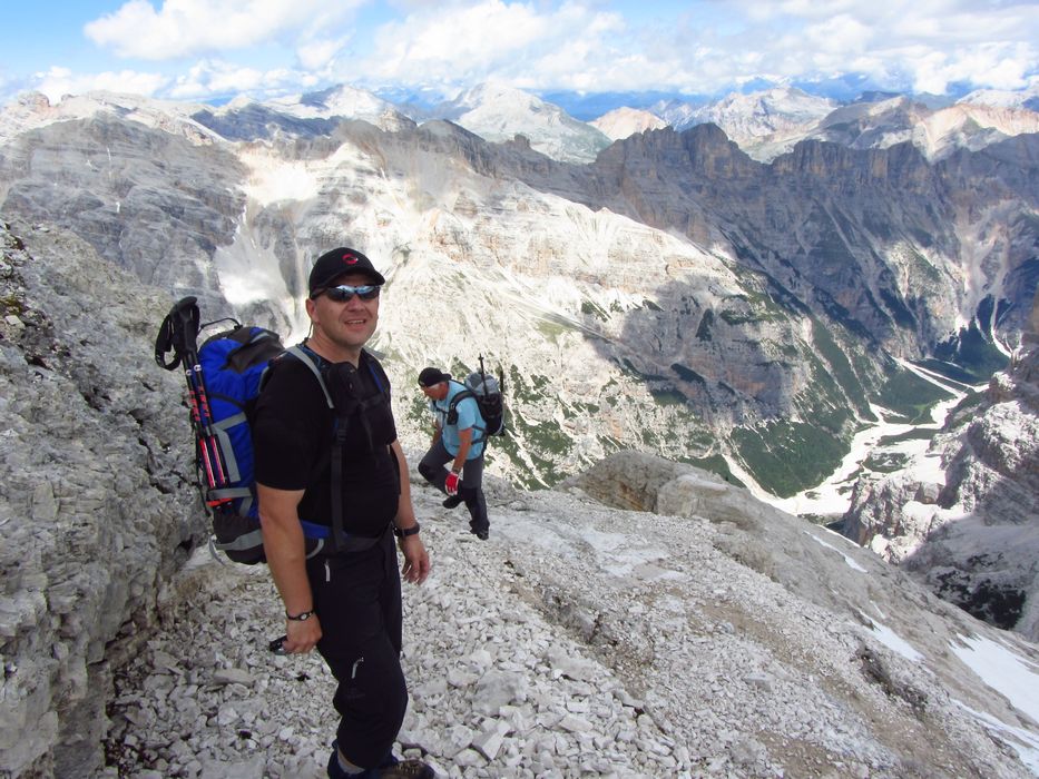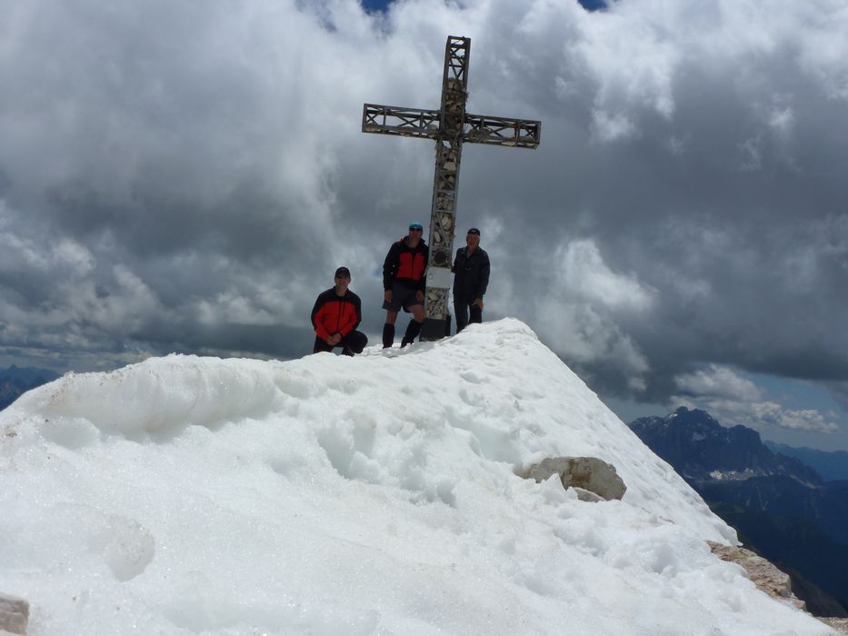 Druhý den je dnem výstupu na loni nedosažený vrchol Tofana di Rozes 3225m, klasickou cestou přes Rif. Giussani 2600m. Vyrážíme časně od Rif. A. Dibona 2050m . Lidí je zde málo, slunce svítí, stoupáme vcelku rychle a brzy jsme na chatě. Posedíme na terase a sledujeme vzdálenou dvojici na sněhovým polích, směr jejich cesty, kudy se asi i my budeme ubírat na vrchol. Bylo překvapením, že cesta je symbolicky značena modrými tečkami a tak po nich vyrážíme. Na prvním sněhu, který vůbec nebyl zmrzlý se boříme, postup je náročnější a riziko zranění je na místě při nečekaném propadu i přes půl metru. Nejprve lehce šikmo traverzujeme, pak stoupáme přes skalní ostrůvky meandrovitě směrem ke hřebenu. Dost se leze, ruce jsou potřeba, neboť to klouže po vlhké skále a tak uklízíme hole. S prvním sněhem na hřebenu a blyštícím se ledem pod ním s pomocí cepínu pomalu kráčíme po hraně vzhůru. Kolem poledne jsme na vrcholu u kříže a nabízí se nám úžasný pohled do okolí. Po krátké pauze sestupujeme, mraky se totiž honí. Sestup byl rychlý, místy těžší, sníh byl měkčí. Před třetí hodinou jsme zpět na chatě. Začíná lehce pršet. Po pauze a po stejné cestě jako ráno sklesáme dolů. V závěru nás dožene i déšť. |