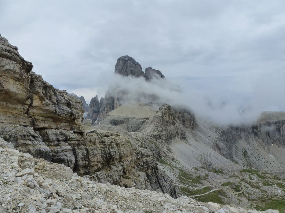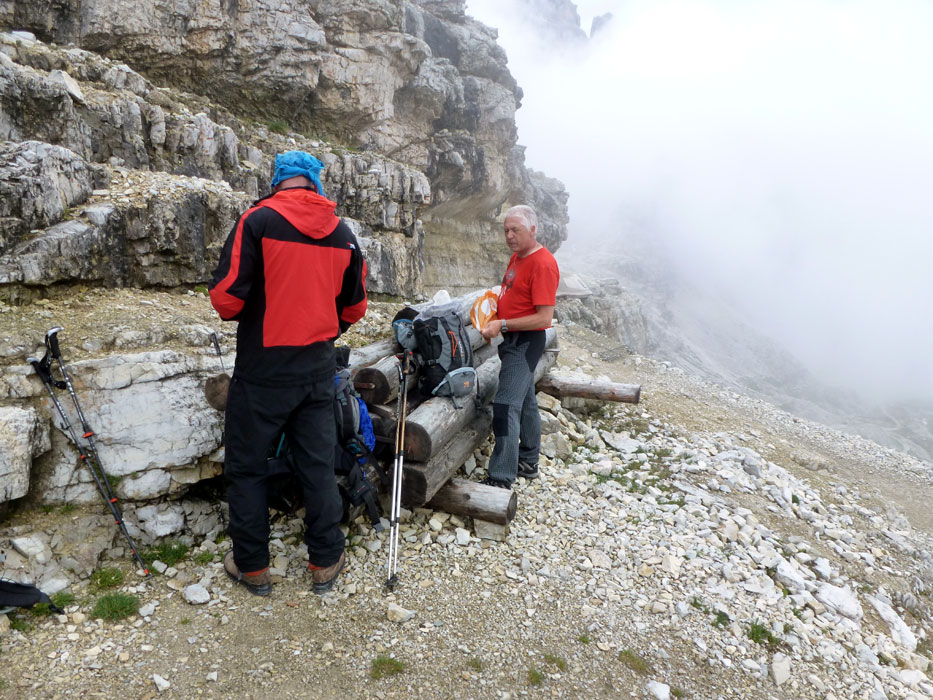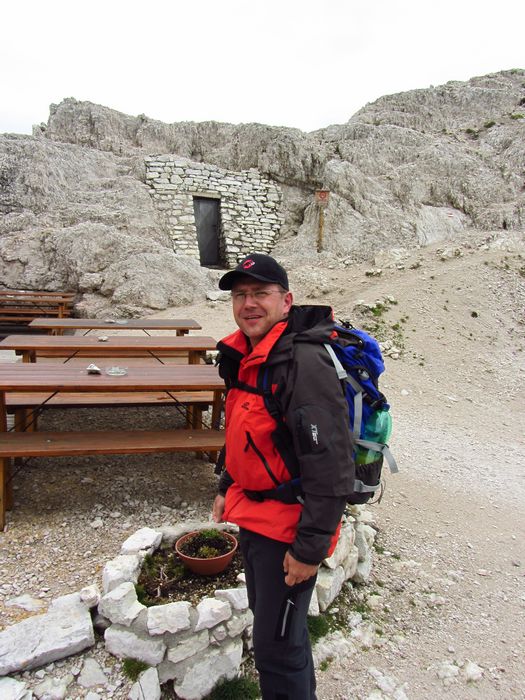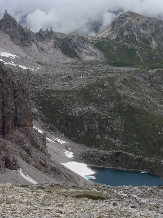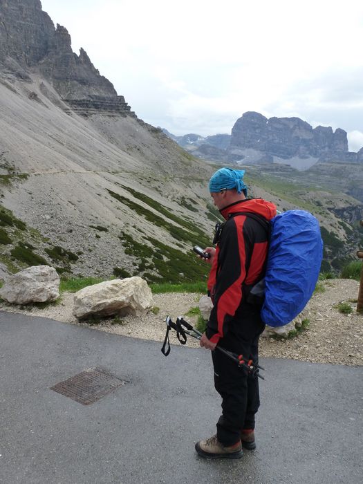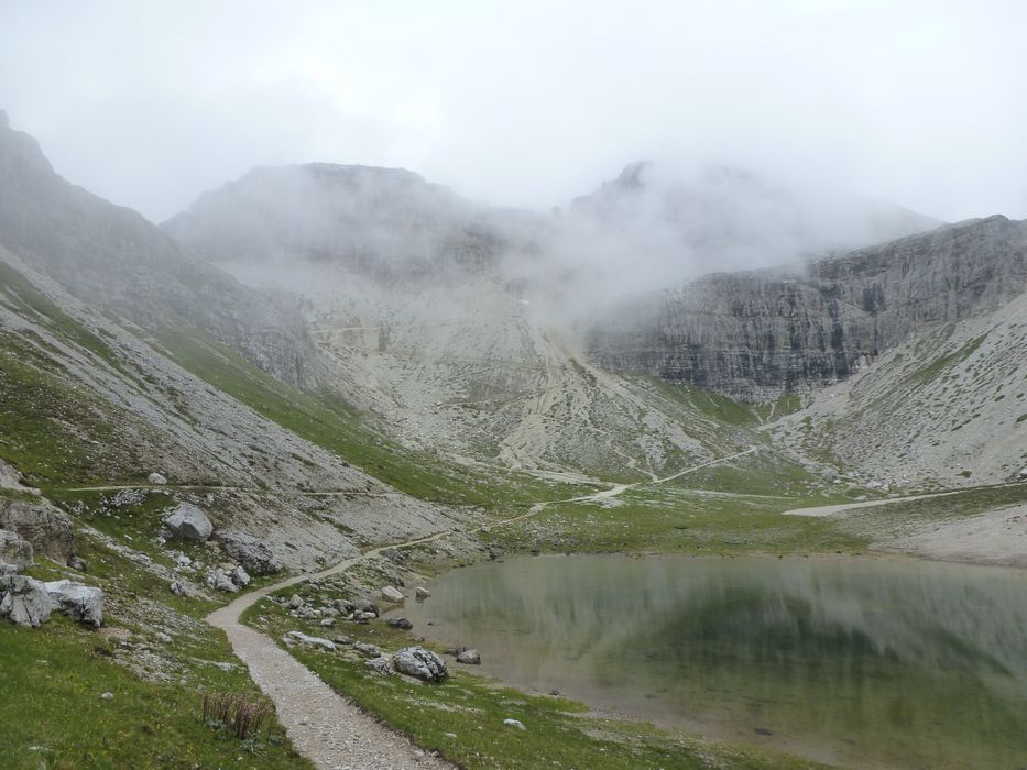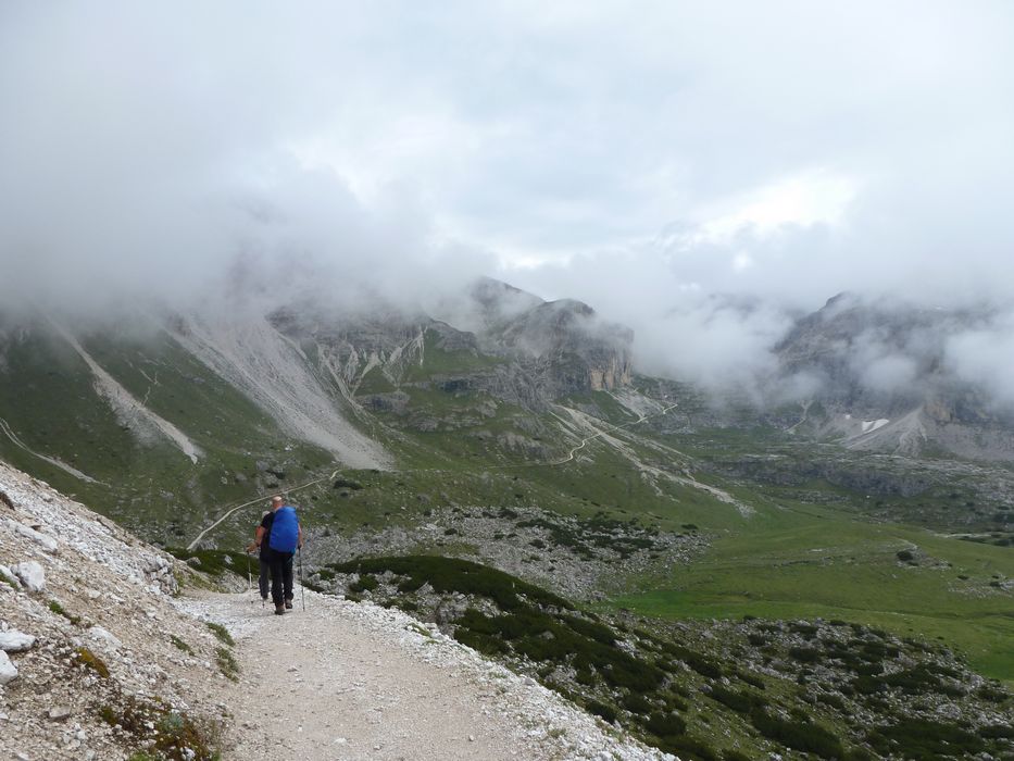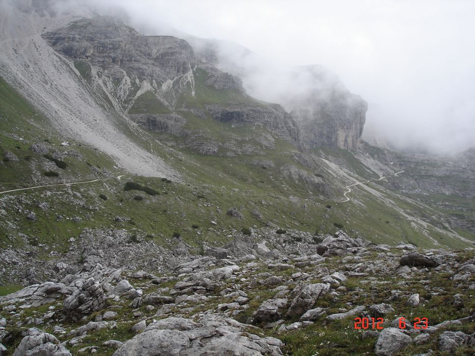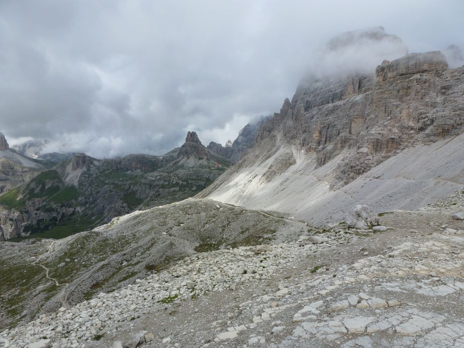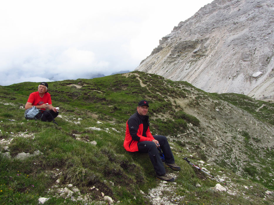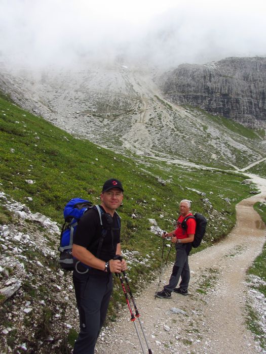 Italská předpověď nevychází a od rána vydatně prší. Původní ferrata Strobel se tedy nedá uskutečnit. Přes dvě hodiny čekáme v autě a zvažujeme alternativní plán. Ačkoli je obloha šedá a stále prší, jedeme na placené parkoviště u Rif. Auronzo s tím, že někam zkrátka dojdeme. Po desáté hodině vyrážíme, přes Rif. Lavaredo 2390m a pak směrem k Rif. Pian di Cengia 2528m. Cesta k ní zprvu dost klesá a hned poté následuje dlouhé stoupání v šedi mraků. Kolem pozorujeme sviště. Netrvá dlouho a jsme v sedle, občas se objeví slunce. Po krátké pauze na Rif. Pian di Cengia 2528m jsme se zamysleli nad hřebenovou ferratou Chartenweg a následně výstup po části ferraty De Luca na Monte Paterno 2746m, ale s ohledem na ranní zpoždění a občasné hřmění za šedými mraky se půjde na Rif. Locatelli 2438m. Tempo je rychlé a za chvíli jsme tam. Je víkend a přibylo zde dost lidí. Následuje výstup cestou pod Monte Paterno do sedla pod Tre Cime di Lavaredo. Dnes chodíme nějak rychle a protože je ještě čas, tak tento masiv zprava zprvu přes suťoviska a kamenné pole a později po okružní cestě celý ještě obejdeme přes Forc. di Mezzo . Na posledním kilometru se dává opět do deště a tak jsme dorazili včas. |