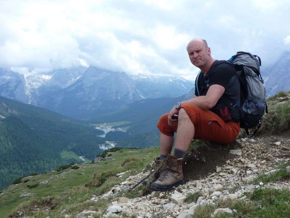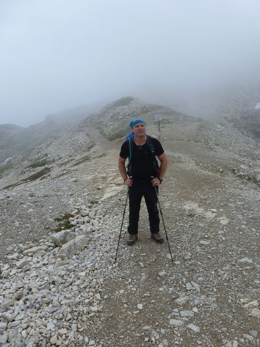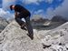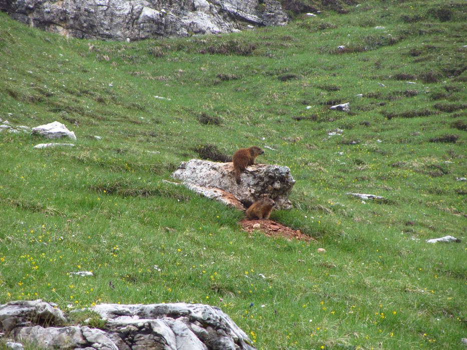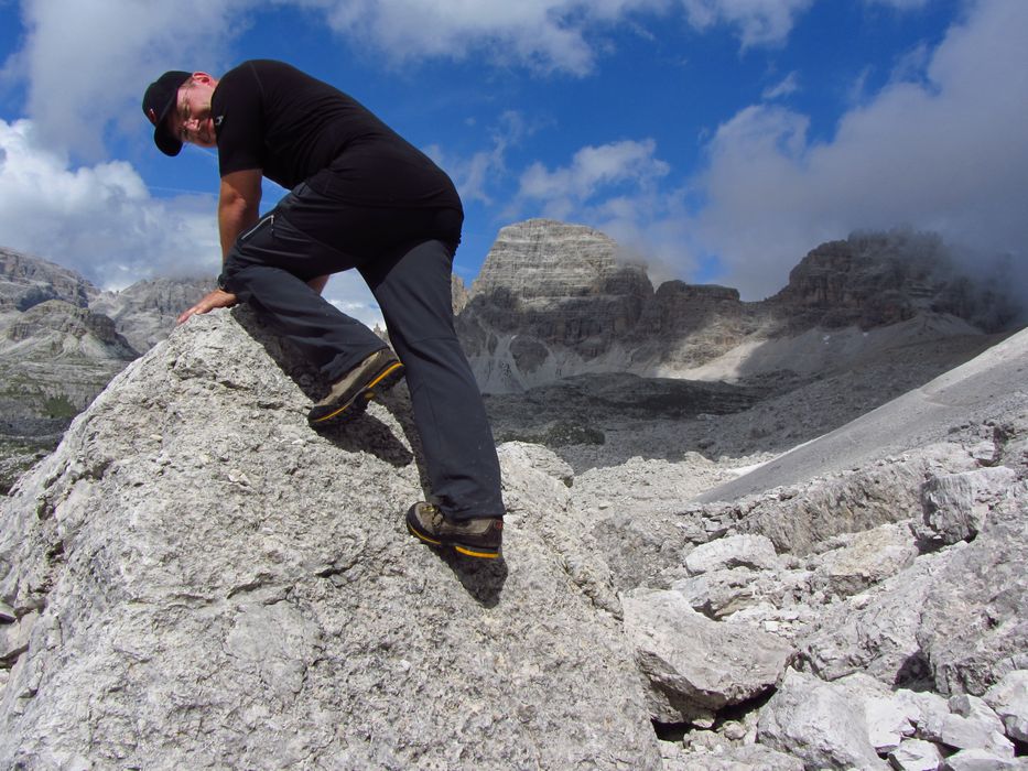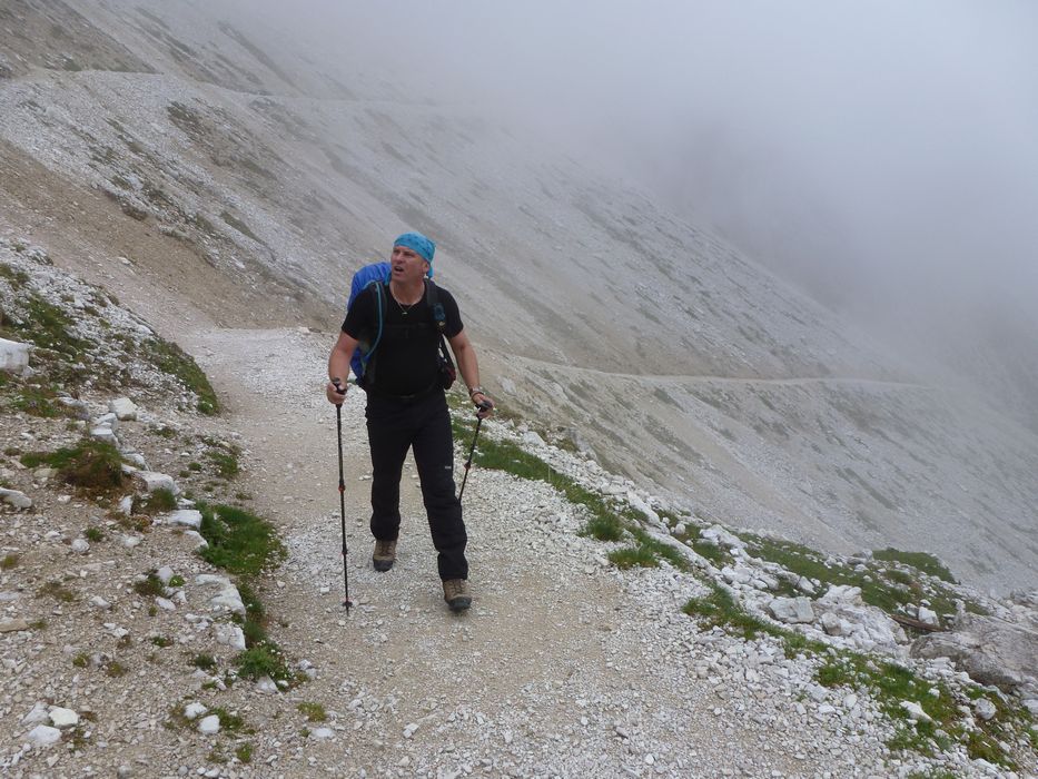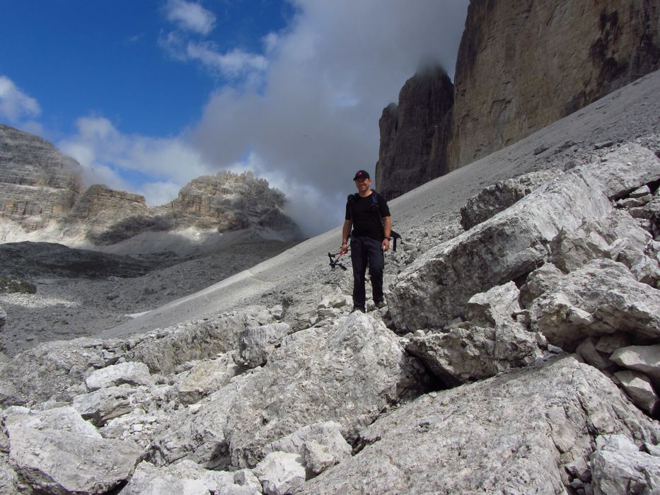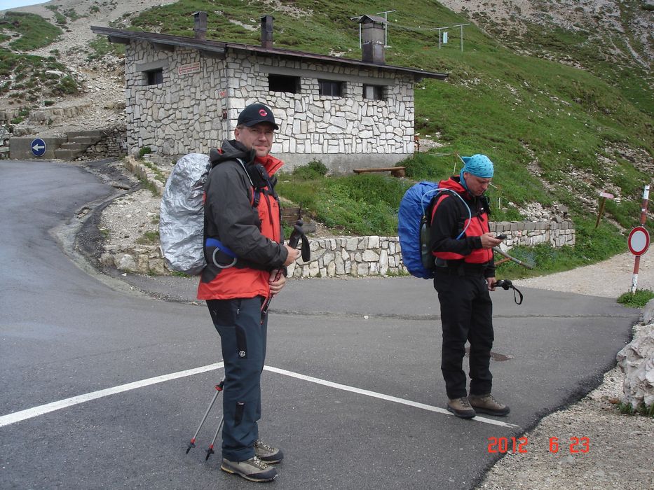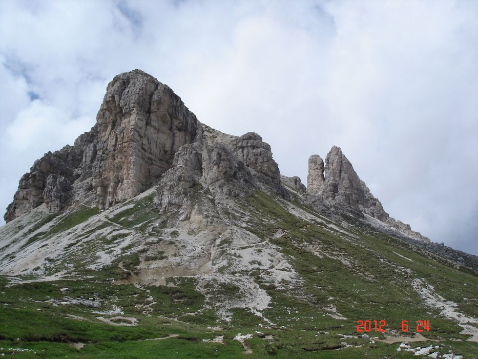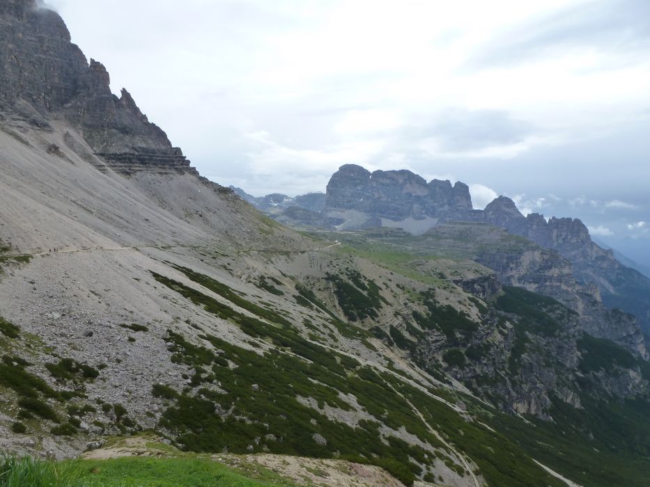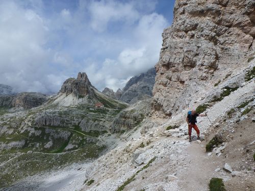 Italská předpověď nevychází a od rána vydatně prší. Původní ferrata Strobel se tedy nedá uskutečnit. Přes dvě hodiny čekáme v autě a zvažujeme alternativní plán. Ačkoli je obloha šedá a stále prší, jedeme na placené parkoviště u Rif. Auronzo s tím, že někam zkrátka dojdeme. Po desáté hodině vyrážíme, přes Rif. Lavaredo 2390m a pak směrem k Rif. Pian di Cengia 2528m. Cesta k ní zprvu dost klesá a hned poté následuje dlouhé stoupání v šedi mraků. Kolem pozorujeme sviště. Netrvá dlouho a jsme v sedle, občas se objeví slunce. Po krátké pauze na Rif. Pian di Cengia 2528m jsme se zamysleli nad hřebenovou ferratou Chartenweg a následně výstup po části ferraty De Luca na Monte Paterno 2746m, ale s ohledem na ranní zpoždění a občasné hřmění za šedými mraky se půjde na Rif. Locatelli 2438m. Tempo je rychlé a za chvíli jsme tam. Je víkend a přibylo zde dost lidí. Následuje výstup cestou pod Monte Paterno do sedla pod Tre Cime di Lavaredo. Dnes chodíme nějak rychle a protože je ještě čas, tak tento masiv zprava zprvu přes suťoviska a kamenné pole a později po okružní cestě celý ještě obejdeme přes Forc. di Mezzo . Na posledním kilometru se dává opět do deště a tak jsme dorazili včas. |