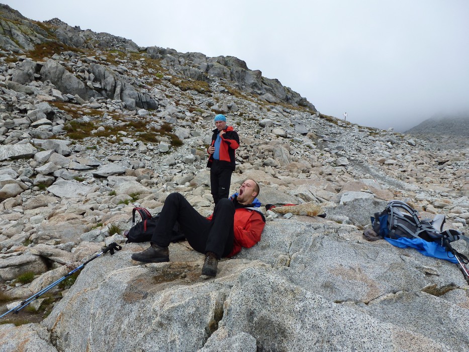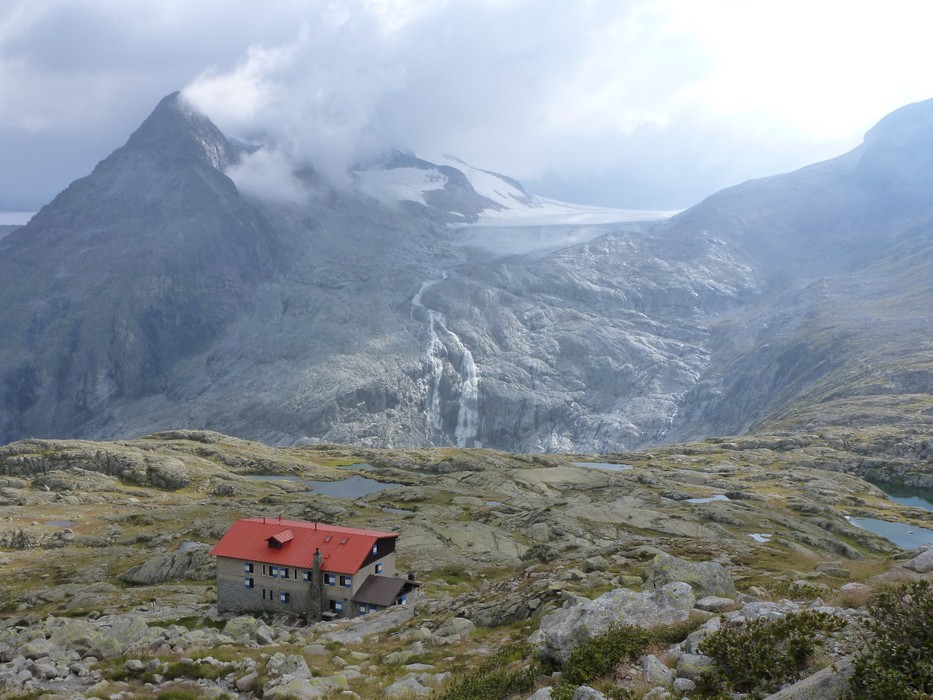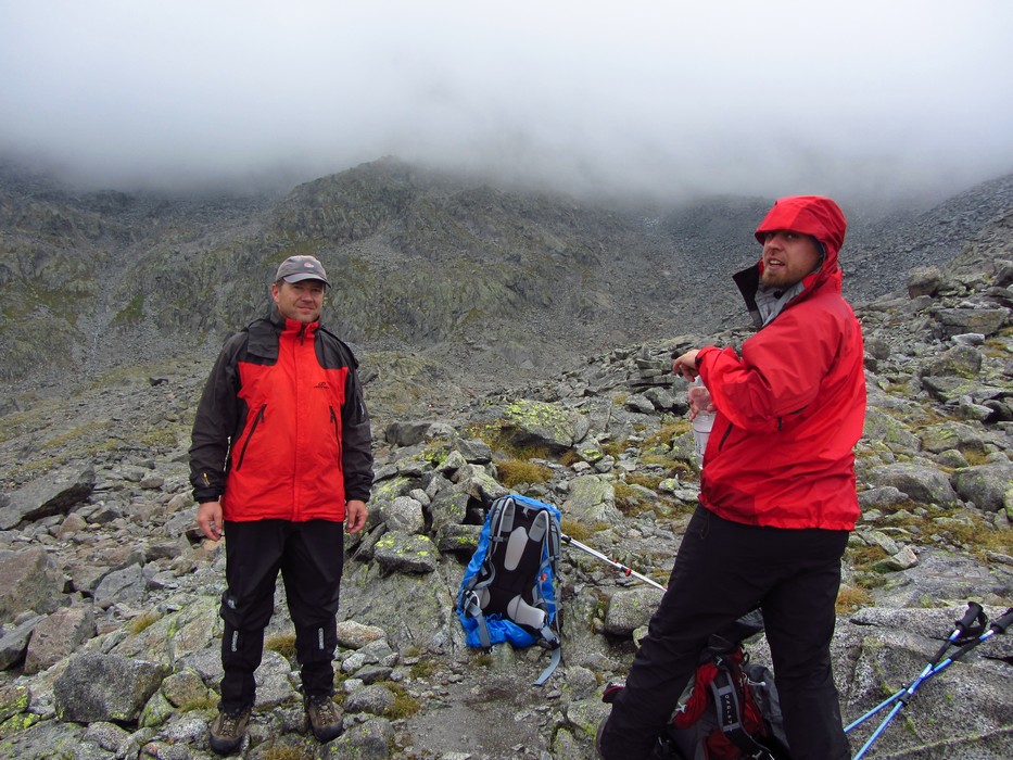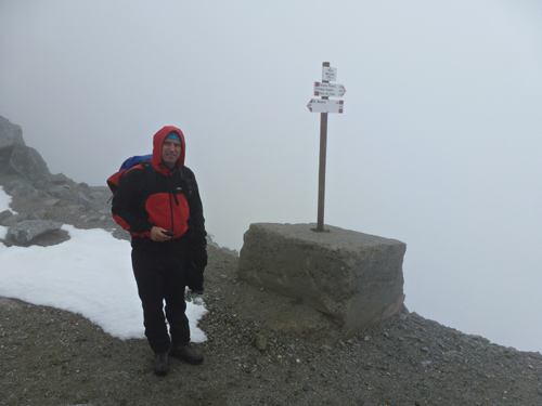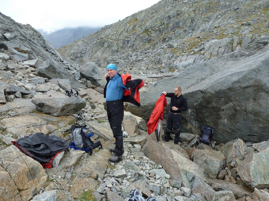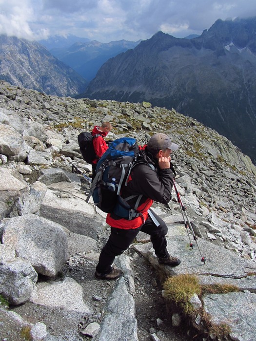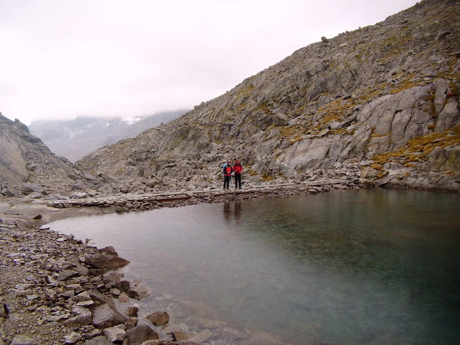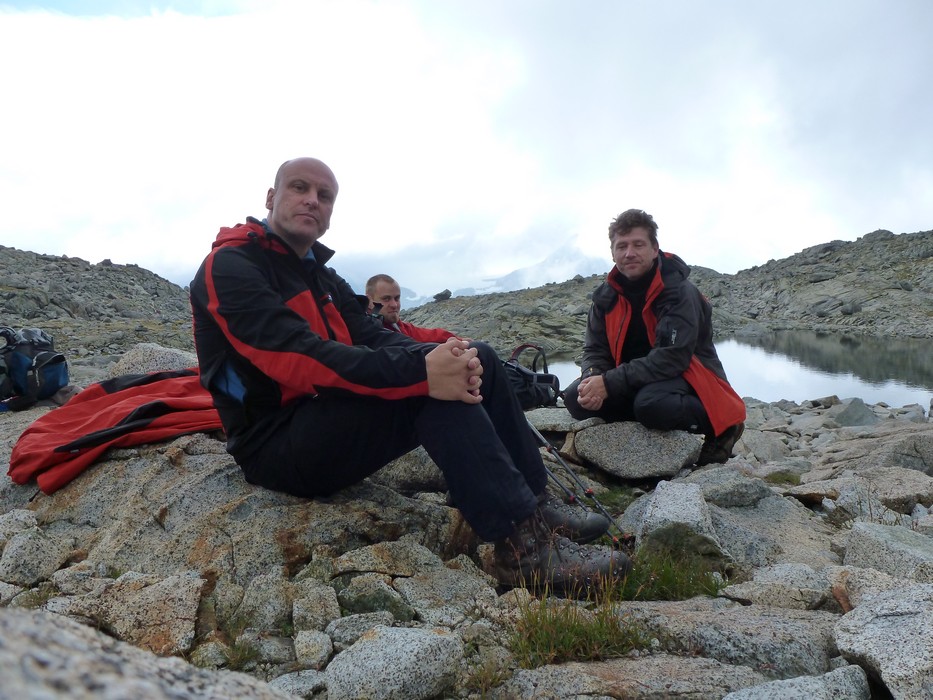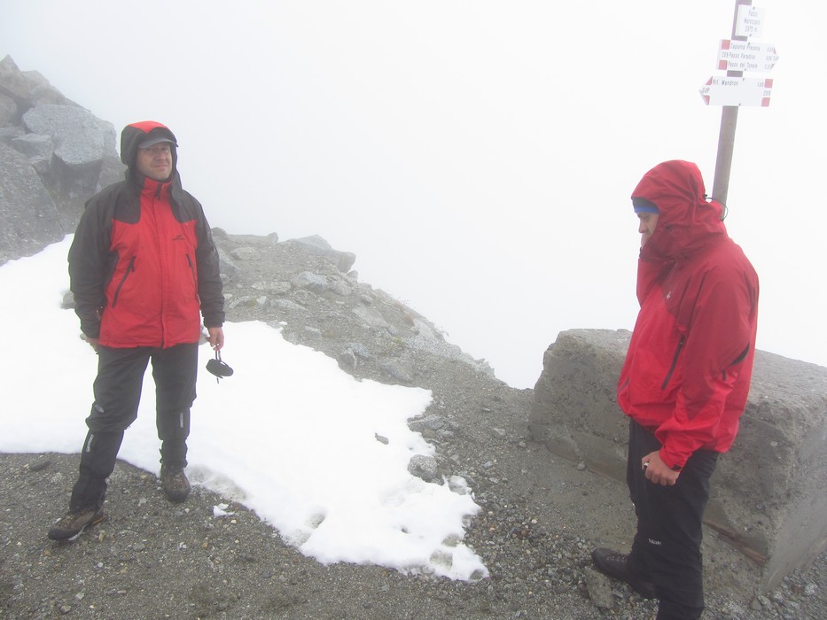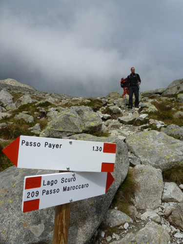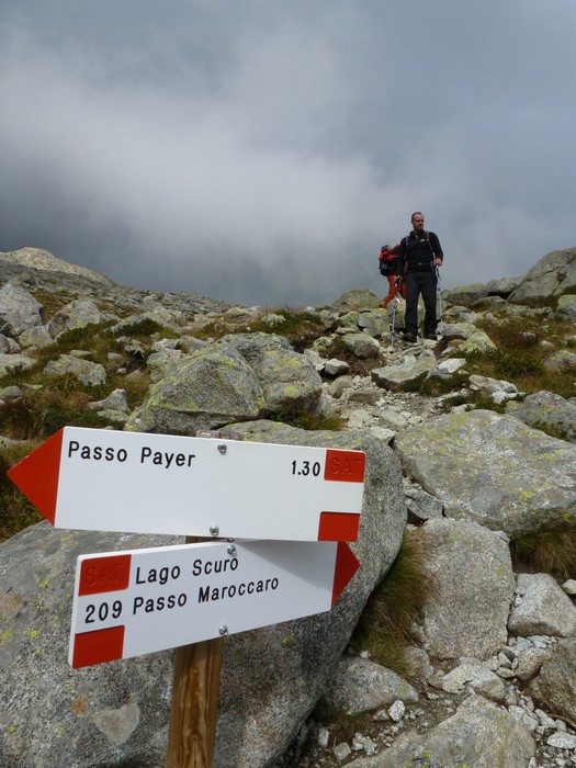 Během pondělního rána z Rif. Brentei sejdeme pár set výškových metrů do údolí a přesouváme se autem do oblasti Adamello na Malga Bedole 1584m. Odsud odpoledne stoupáme s těžšími bágly na Rif. Madron 2449m, kde budeme spát a jsme rádi, že dnes nás déšť nepotrápil. Povečeříme a venku začíná pršet. Sledujeme proud deště a popíjeme víno. Jdeme brzy spát. Úterní ráno dle místních mělo být prý hezky, přízvučně po italsky „BENE“, ale nebylo, prší a prší. Přesto vyrážíme na Cima Payer 3056m a dále máme v plánu hřebenovou frontovou ferratu. Při výstupu déšť, ale nedá pokoj a s výškou se opět déšť mění na sníh. V sedle Cima Payer sněží a fouký ledový vítr, nejen ruce chřadnou. Váháme zda jít dále. Od ferraty, kde jsme vystaveni větru tedy nakonec bohužel upustíme a klesáme. Odbočíme se podívat zkratkou k Lago Scuro, kde před polednem konečně trochu ustává déšť. Proto vyrazíme ještě na Passo Maroccaro 2975m, jednak aby bylo kam jít a také, že tam je signál :-). Výstup do sedla bez firnového sněhu tentokrát byl daleko těžší. V sedle fouká, ale neprší. Po telefonátech, klesáme zpět na Rif. Madron. Uděláme si pár zastávek, vždy když na chvíli mezi mraky se objeví slunce. |