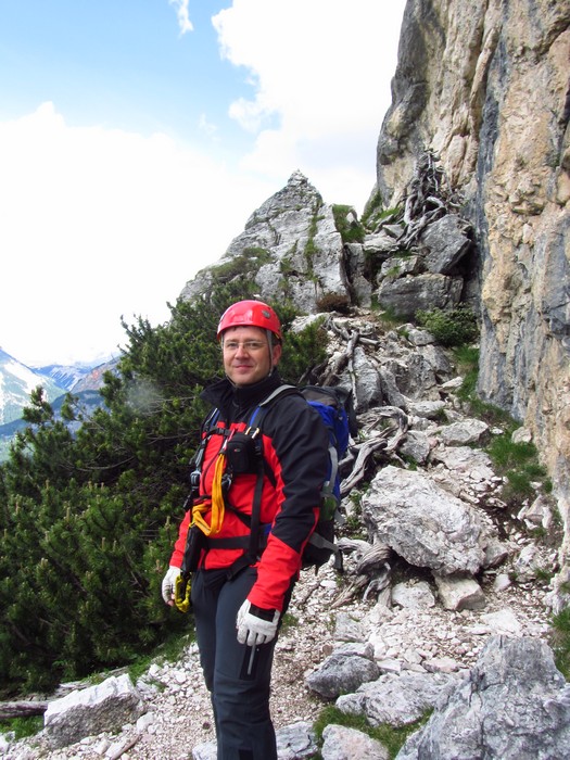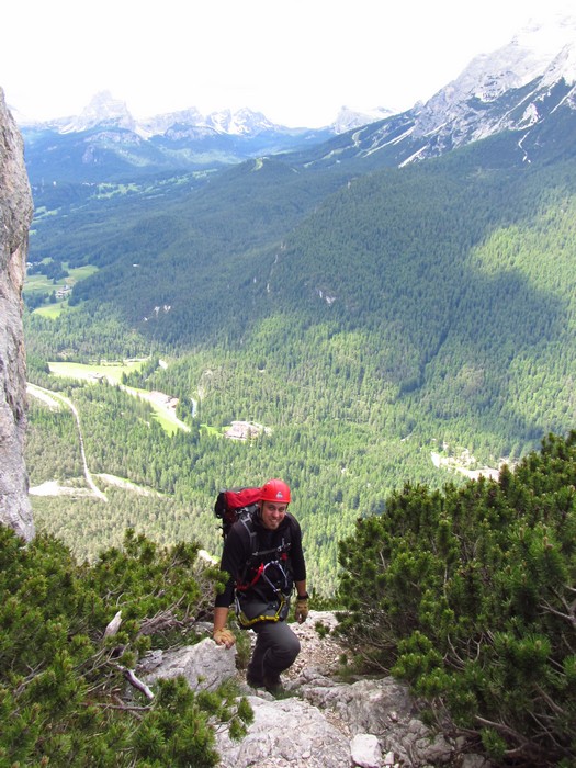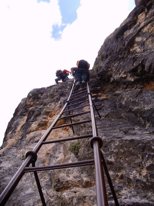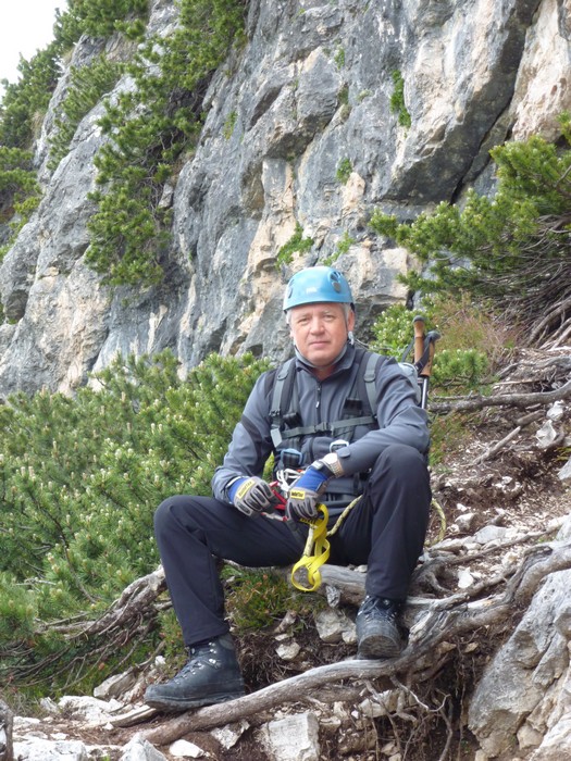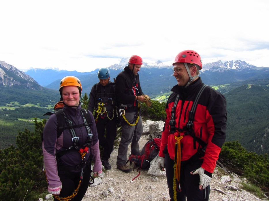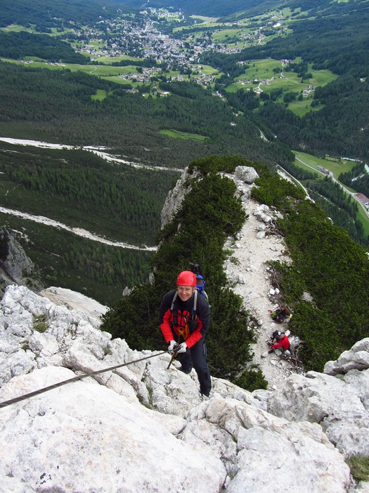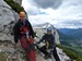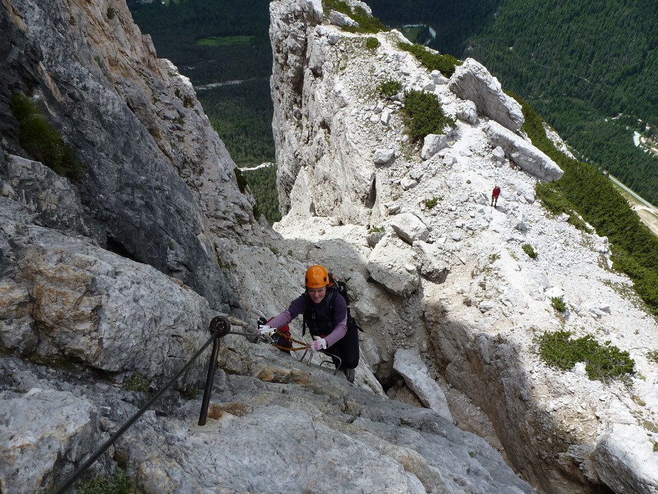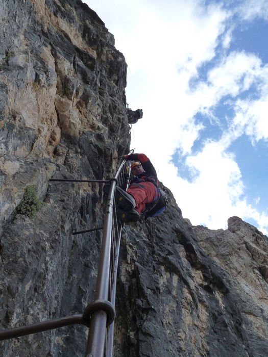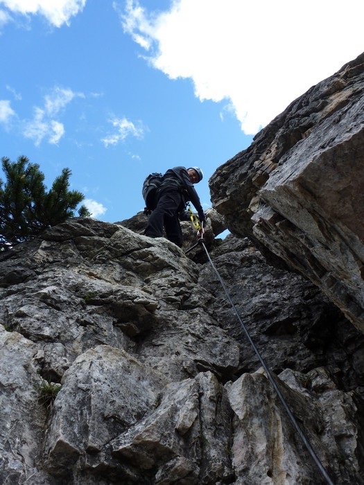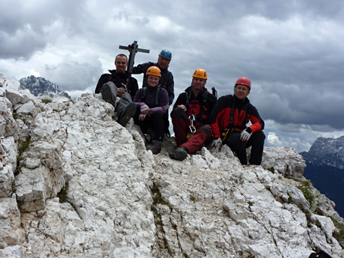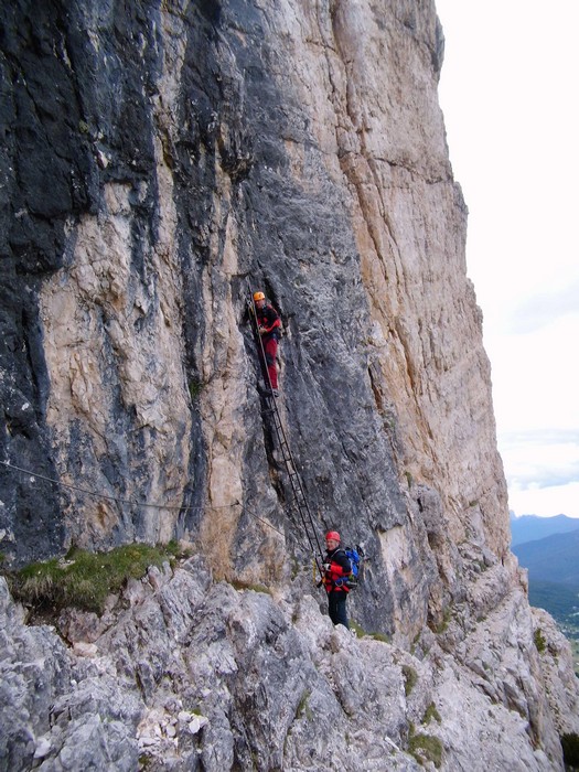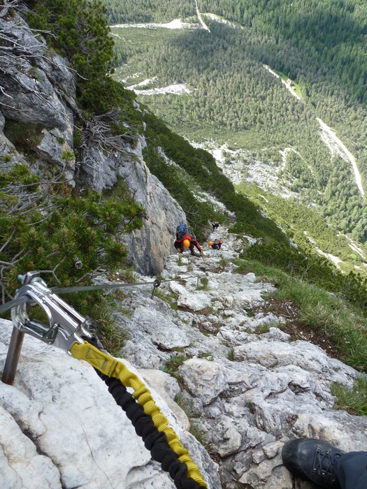 Na druhý den jsme si domluvili společnou ferratu, kterou vyhlédli nocležníci v kempu Honza s Janou :-). Která byla nedaleko nich. A to Albino Michieli al. Strobel. Vyrážíme ráno v půl desáté od Rif. Fiámes 1280m, ferrata začíná velmi nízko hodinovým příkrým nástupem lesním porostem a později klečí, která je i na spodní části ferraty. Cesta nebyla technicky obtížná, ale samotná její délka s několika příkře prokládanými chodeckými pasážemi jí činila nakonec jen fyzicky náročnější, přeci jenom je to přes půl kilometru vzhůru. Kolem jedné odpoledne jsme nahoře, na vrcholu Punta Fiámes 2240m. Po malé pauze v závětří vrcholu nás čeká sestupová cesta suťoviskem. A to bylo natolik příkré a tvořeno převážně s velmi malých kamenů, že dovolilo takřka kluzně sjet velmi rychle dolů. Místy shrnuté pasáže až na hliněný podklad, byly horší, ale nakonec trpěly jen boty o ostré hrany kamenů. S první klečí se postupně cesta změní a stočí doprava a již nás normálně zavede pohodlně dolů k autu. Dnes to bylo kratší. Sestup byl totiž o dost rychlejší nežli jsme čekali.