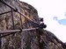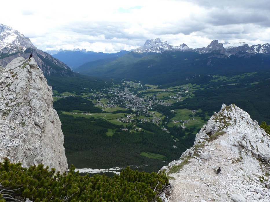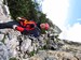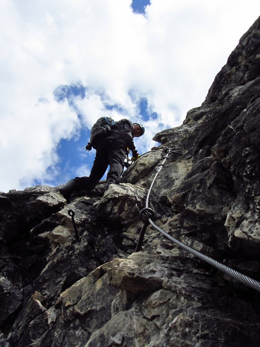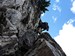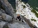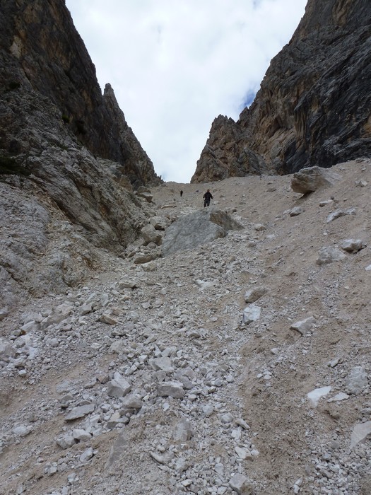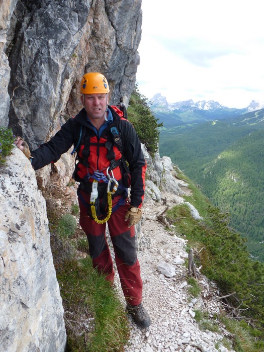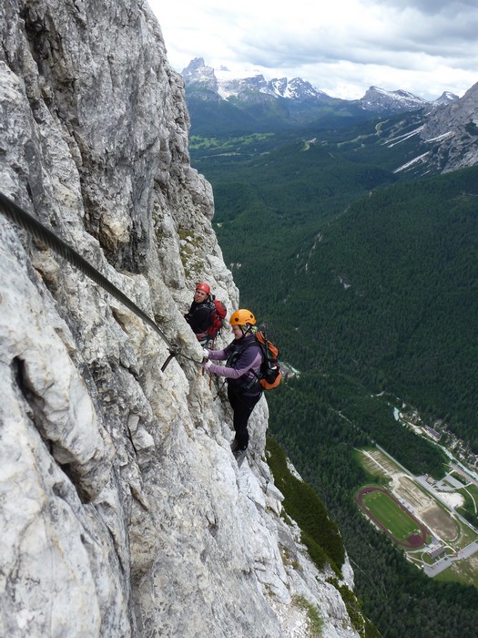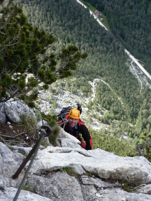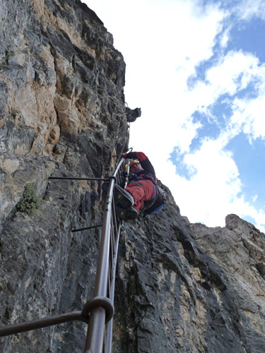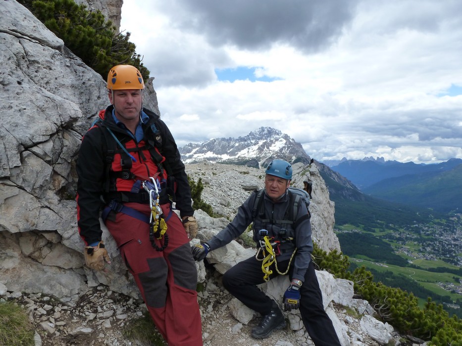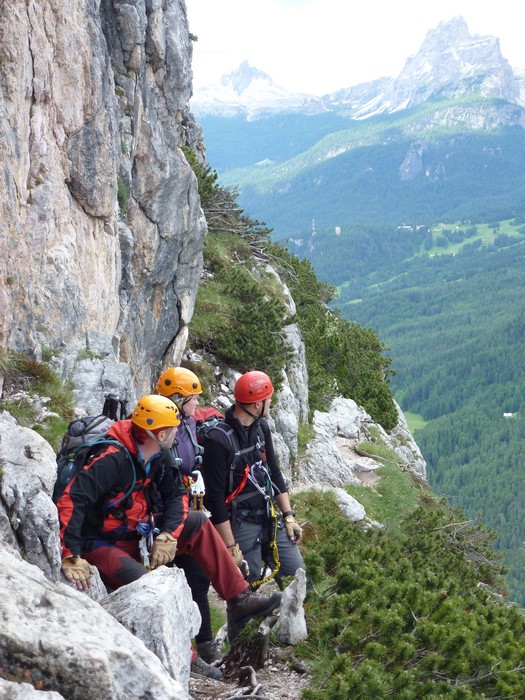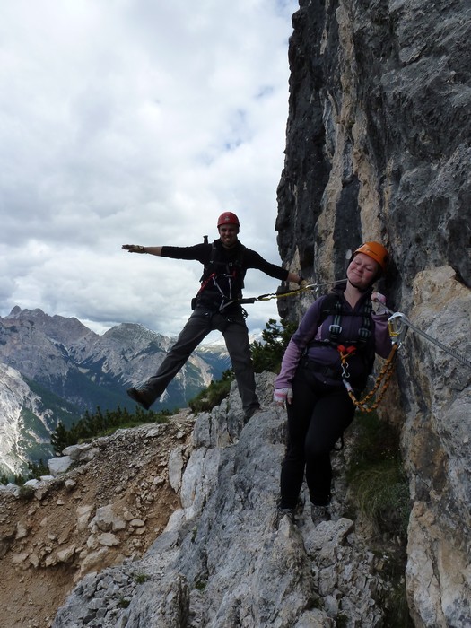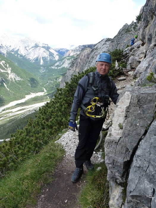 Na druhý den jsme si domluvili společnou ferratu, kterou vyhlédli nocležníci v kempu Honza s Janou :-). Která byla nedaleko nich. A to Albino Michieli al. Strobel. Vyrážíme ráno v půl desáté od Rif. Fiámes 1280m, ferrata začíná velmi nízko hodinovým příkrým nástupem lesním porostem a později klečí, která je i na spodní části ferraty. Cesta nebyla technicky obtížná, ale samotná její délka s několika příkře prokládanými chodeckými pasážemi jí činila nakonec jen fyzicky náročnější, přeci jenom je to přes půl kilometru vzhůru. Kolem jedné odpoledne jsme nahoře, na vrcholu Punta Fiámes 2240m. Po malé pauze v závětří vrcholu nás čeká sestupová cesta suťoviskem. A to bylo natolik příkré a tvořeno převážně s velmi malých kamenů, že dovolilo takřka kluzně sjet velmi rychle dolů. Místy shrnuté pasáže až na hliněný podklad, byly horší, ale nakonec trpěly jen boty o ostré hrany kamenů. S první klečí se postupně cesta změní a stočí doprava a již nás normálně zavede pohodlně dolů k autu. Dnes to bylo kratší. Sestup byl totiž o dost rychlejší nežli jsme čekali.