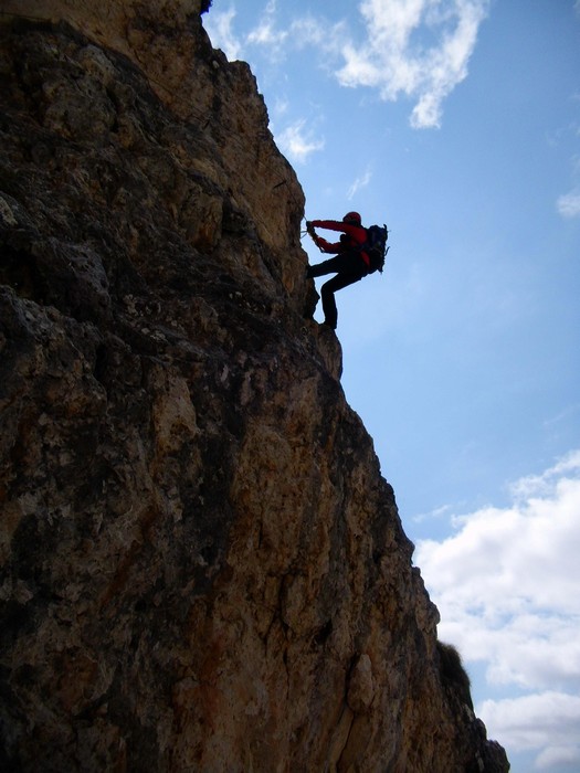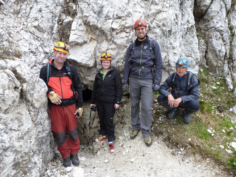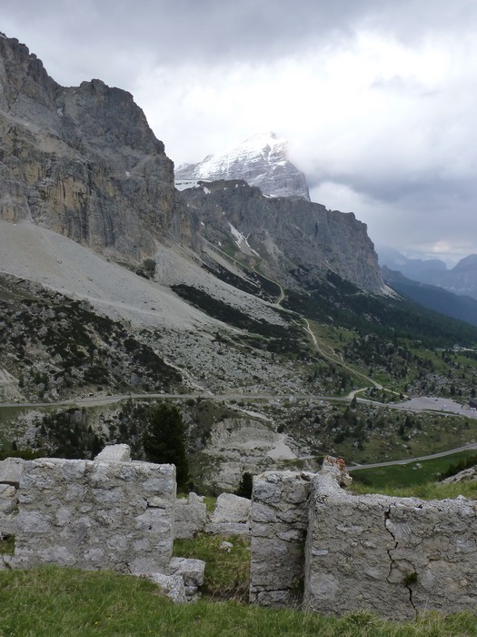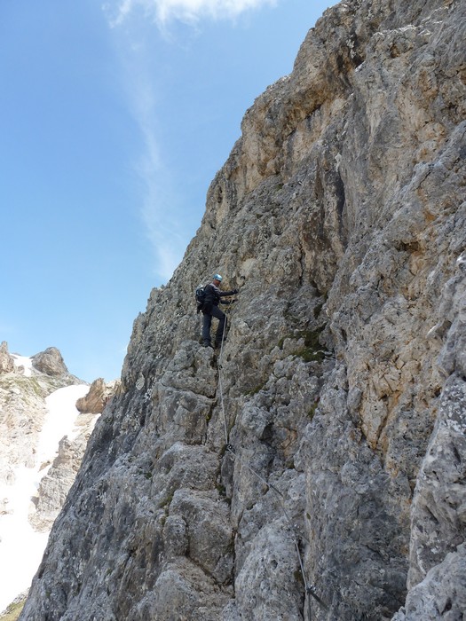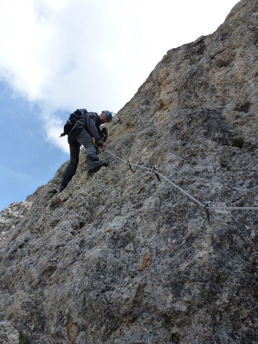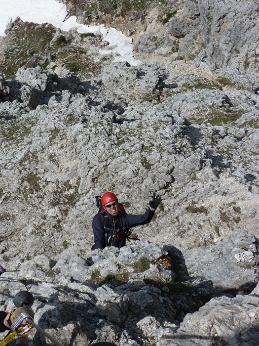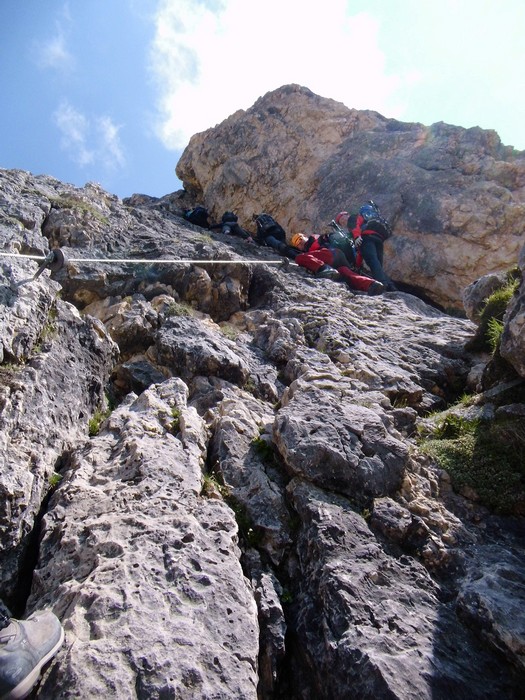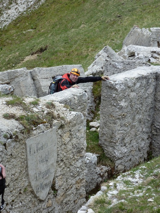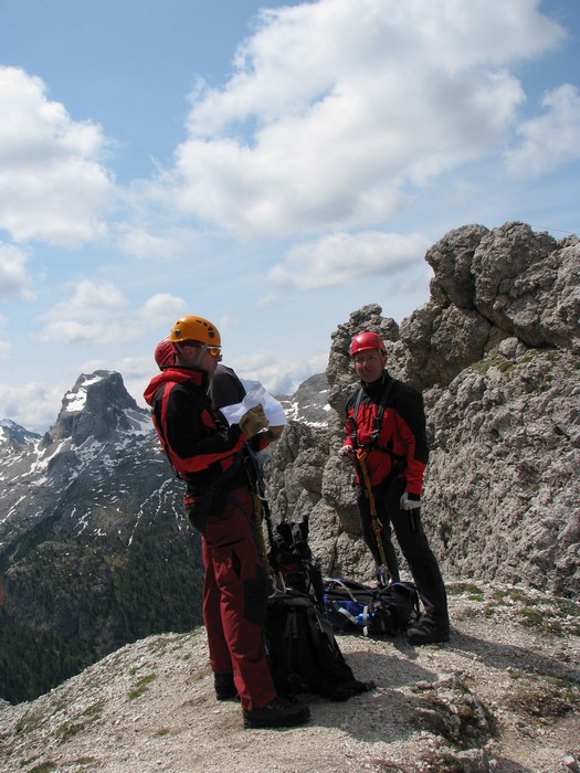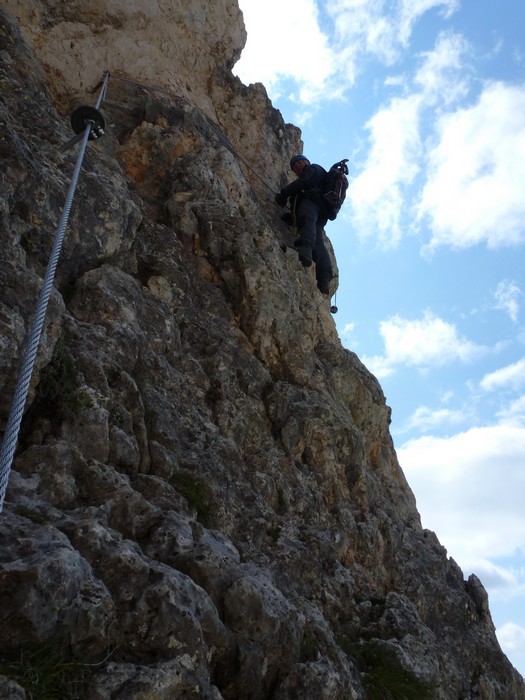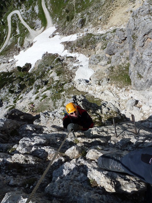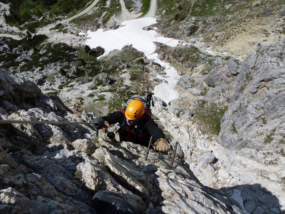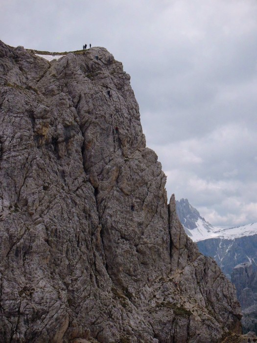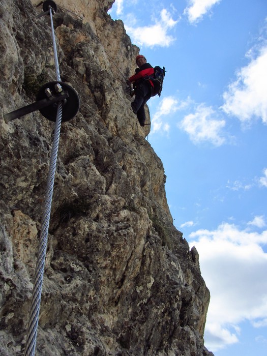 Na čtvrtek jsme si připravili relativně mladou ferratu na Col Dei Bos. Auto jsme nechali v Passo di Falzarego 2117m a vyrážíme kolem desáté k nástupu na ferratu. Uteče přes půl hodiny a jsme u ní, lidí tu přibylo, tvoří se skupinky, ba had na samotné stěně. K naší smůle nás předběhla skupina postarších dam, zjevně s malými zkušenostmi a malou silou a tak první půl hodina se za nimi nepříjemně vlekla. Poté co jsme je předběhli se již lezlo lépe. Ferrata je silovější, vzdušnější, spousta pěkného strmého lezení. Byla výborně odjištěná. Na vrcholu nás čekala odměna v podobě fantastického rozhledu, na stěnu Tofany, na v dáli zasněženou Marmoladu či jen na Rif. Lagazuoi. Po malé pauze, sestupujeme nejkratší cestou dolů se zbytky sněhu. S Passo di Falzarego si popojedeme autem kousek výš do Passo di Valparola 2192m. Tady se vydáme do nedaleké štoly z války, která nás provede místy, kde se bojovalo. Všude to dýchalo “časem” který tu kdysi museli vojáci nedobrovolně trávit. Blížící se oblačnost nás raději zahnala po hodině zpět k autu. I dalo se do děště se sněhem. Všechno vyšlo akorát. Byl to pěkný den, zatím nejslunečnější a zdá se poslední. |