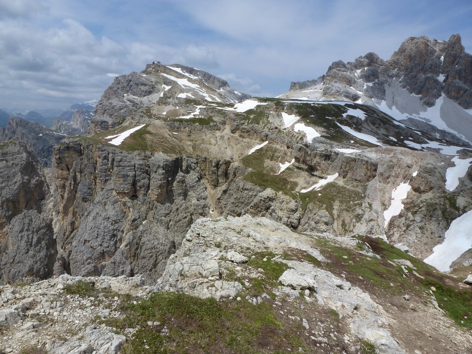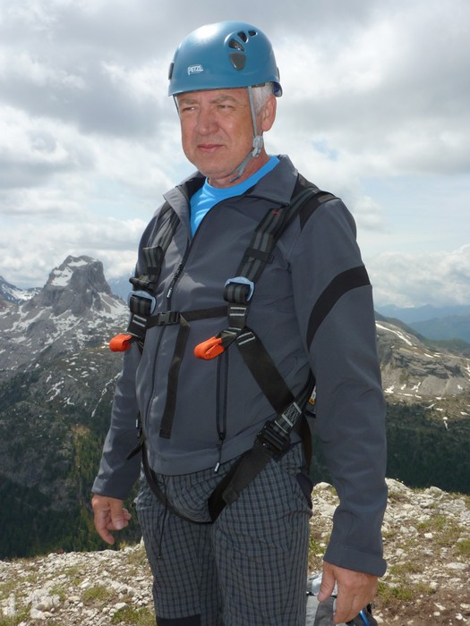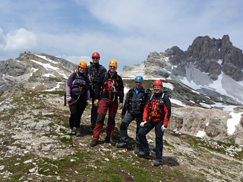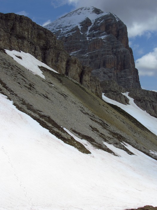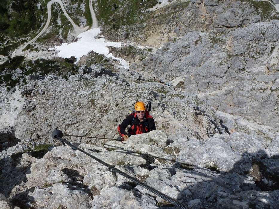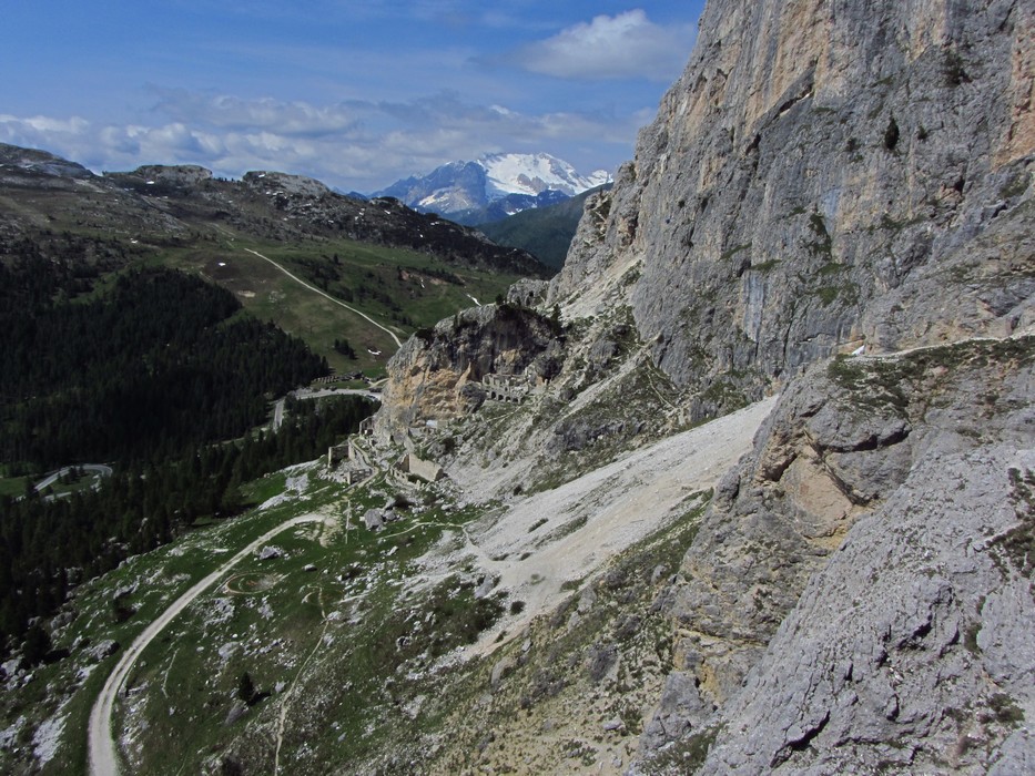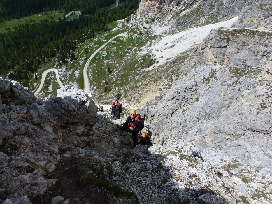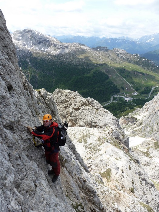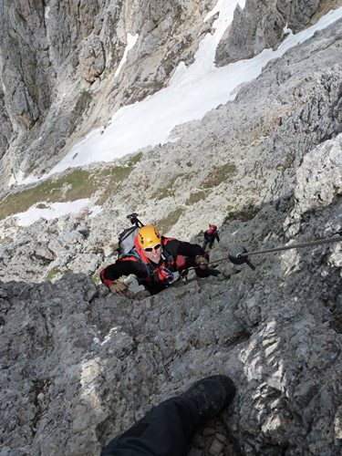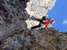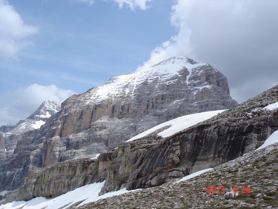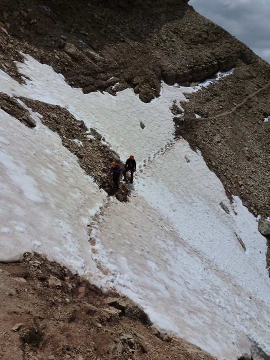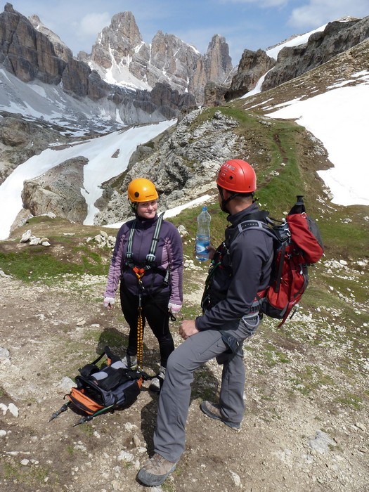 Na čtvrtek jsme si připravili relativně mladou ferratu na Col Dei Bos. Auto jsme nechali v Passo di Falzarego 2117m a vyrážíme kolem desáté k nástupu na ferratu. Uteče přes půl hodiny a jsme u ní, lidí tu přibylo, tvoří se skupinky, ba had na samotné stěně. K naší smůle nás předběhla skupina postarších dam, zjevně s malými zkušenostmi a malou silou a tak první půl hodina se za nimi nepříjemně vlekla. Poté co jsme je předběhli se již lezlo lépe. Ferrata je silovější, vzdušnější, spousta pěkného strmého lezení. Byla výborně odjištěná. Na vrcholu nás čekala odměna v podobě fantastického rozhledu, na stěnu Tofany, na v dáli zasněženou Marmoladu či jen na Rif. Lagazuoi. Po malé pauze, sestupujeme nejkratší cestou dolů se zbytky sněhu. S Passo di Falzarego si popojedeme autem kousek výš do Passo di Valparola 2192m. Tady se vydáme do nedaleké štoly z války, která nás provede místy, kde se bojovalo. Všude to dýchalo “časem” který tu kdysi museli vojáci nedobrovolně trávit. Blížící se oblačnost nás raději zahnala po hodině zpět k autu. I dalo se do děště se sněhem. Všechno vyšlo akorát. Byl to pěkný den, zatím nejslunečnější a zdá se poslední. |