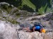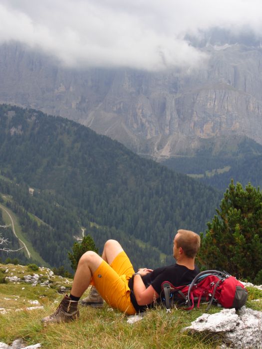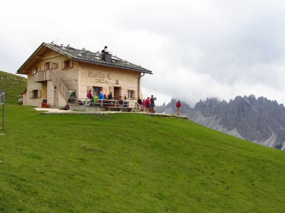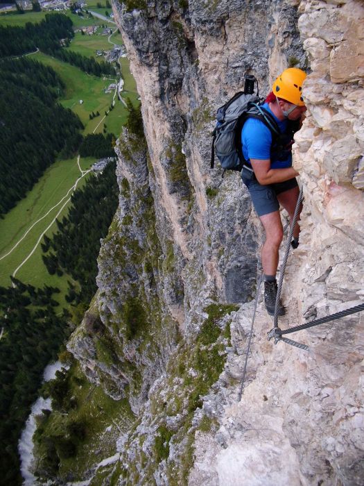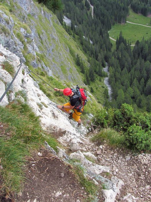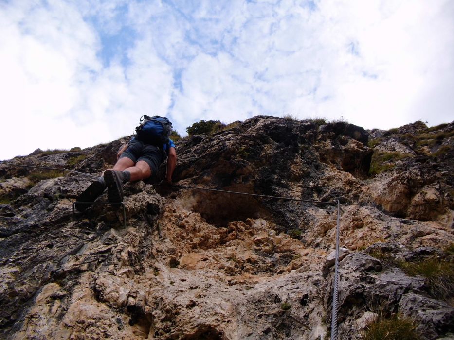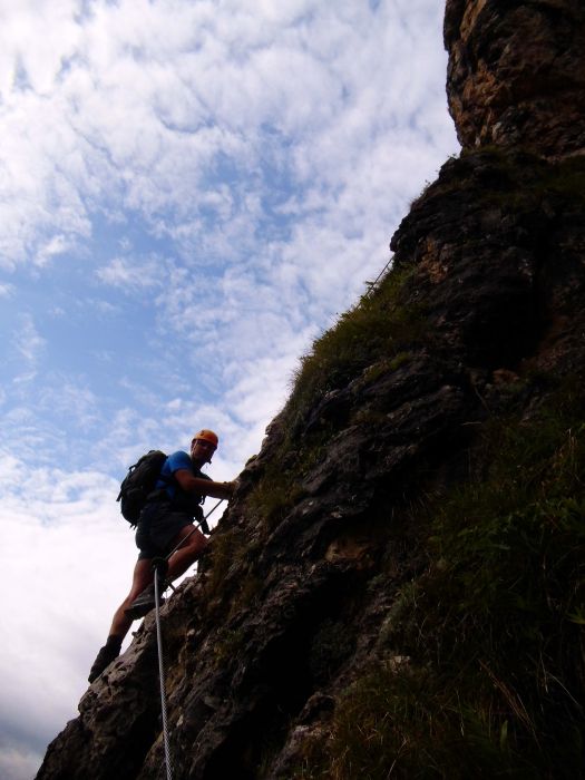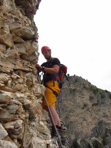 Druhý den jsme vyrazili na ferratu Sandro Pertini, která je popsaná jako dosti obtížná. Do kolen nás dostala cedule na přístupové cestě - Chiuso=zavřeno. Naštěstí dorazili dva Italové, kteří nám řekli, že oni jedou z Padovy jen na tu ferratu, takže jí prostě dají a ať se přidáme. Slovo dalo slovo a vyrazili jsme společně a to i přes další ceduli a zábrany u nástupu. Pravda, na ferratě jsme viděli už nějaké lezce, takže to nám dodalo. Ferrata byla sice v nižší poloze, ale byla tak akorát, dle nás C-D. Perfektně odjištěná, se všemi možnými pomůckami a atrakcemi - žebřík, můstek, vzdušné traverzy, rozhledy. Počasí také paráda, takže pivko u chalupy Stevio 2312m nad ferratou moc chutnalo. Pak jsme ještě vyběhli na hranu hory Stevio s krásným výhledem, no a pak okružní cestou dolů k autu, musíme balit na Otztalky.