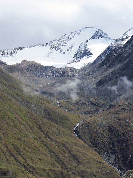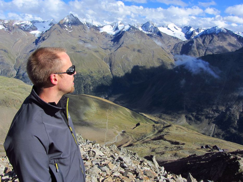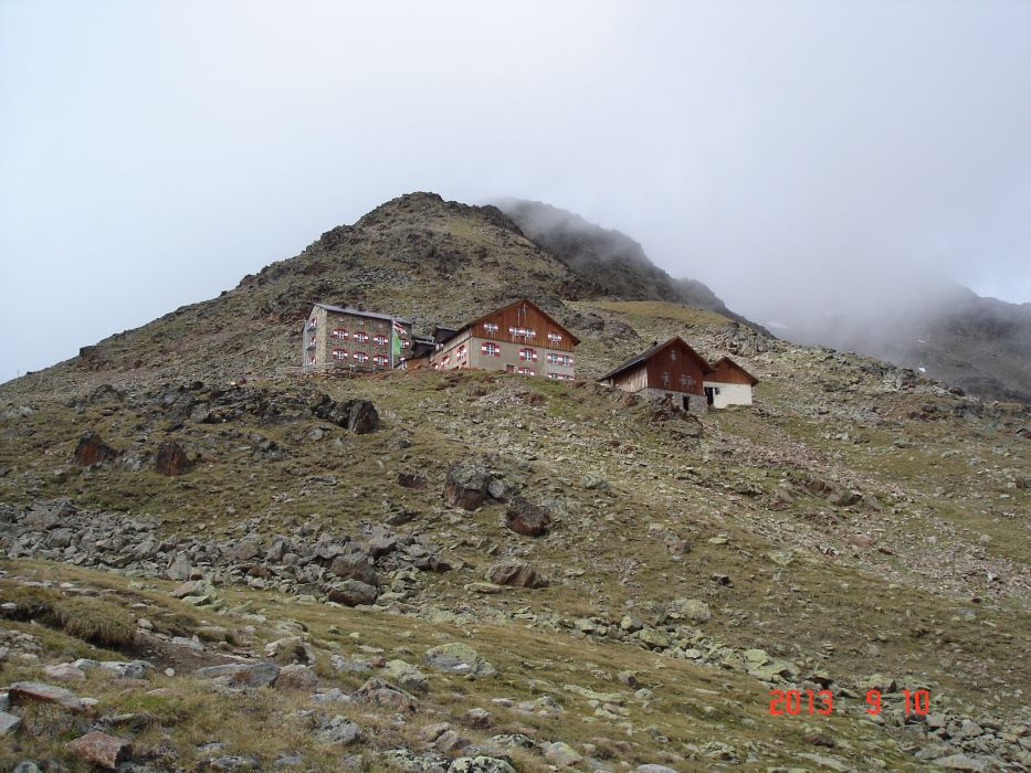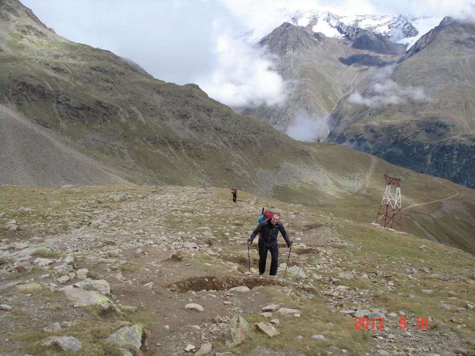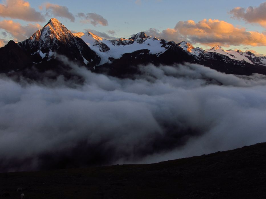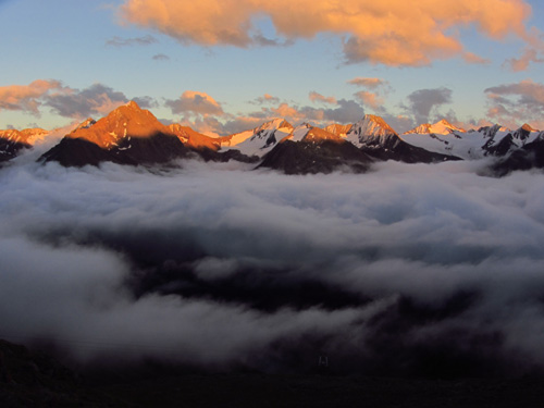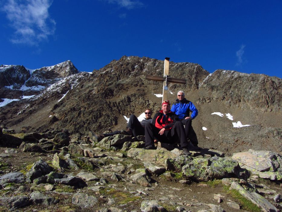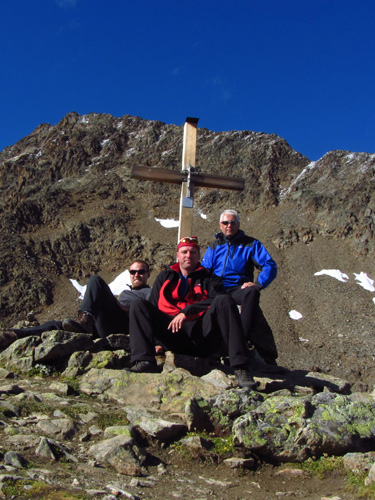 V pondělí byl přejezd do Ventu přes Passo Rombo, zaparkovali jsme u lanovky, ta nás vytáhla do cca 2300m a pak nastal první pochoďák s plnou polní na čtyři dny a na ledovce k chatě Breslauer Hütte 2844m, kde jsme měli zamluvený nocleh. Když jsme se ubytovali a dali si pivko, tak nás krásné počasí ještě vyhnalo na výstup na horu Urkundholm 3113m, abychom splnili normu plánovaných třítisícoveka pokoukali na jižní stěnu Wildspitze, druhé nejvyšší hory Rakouska. No a pak jsme se při i po večeři kochali nádherným západem slunce nad Alpama a ledovcema. |