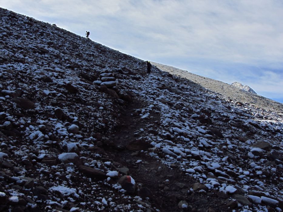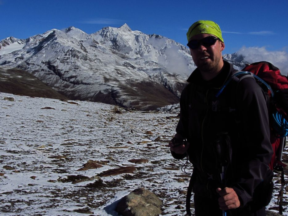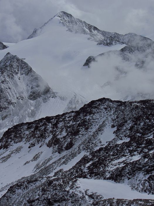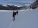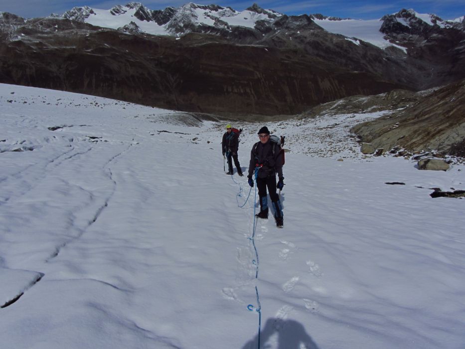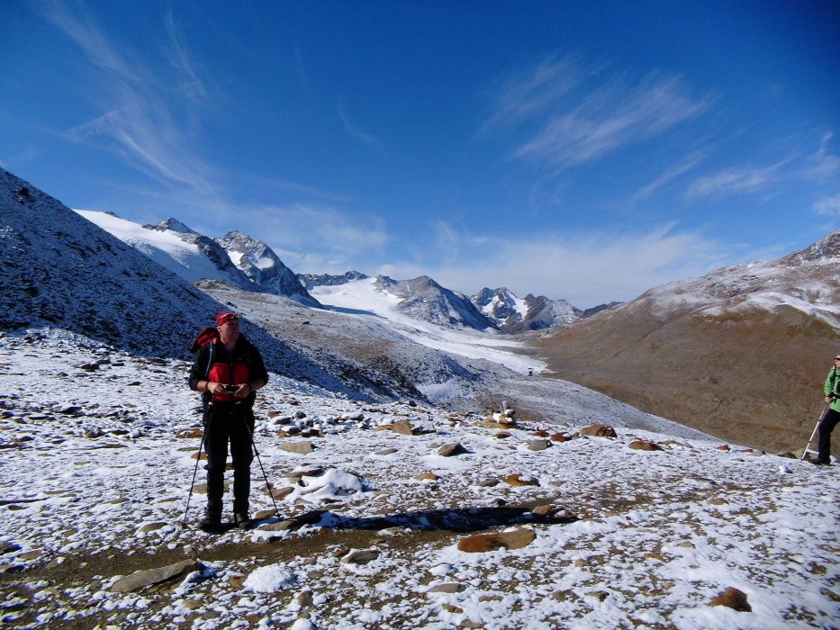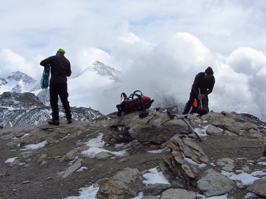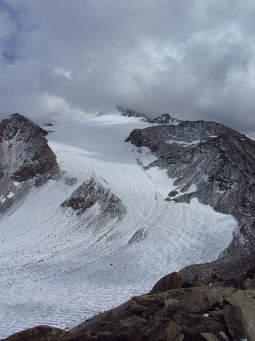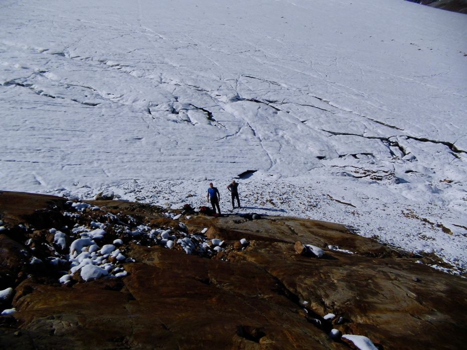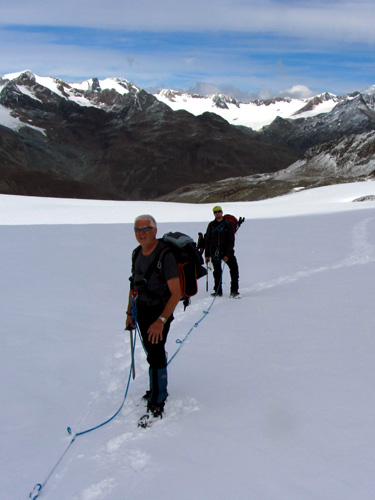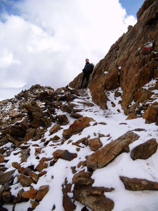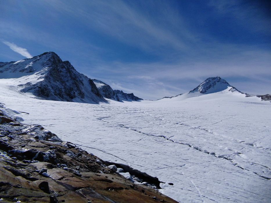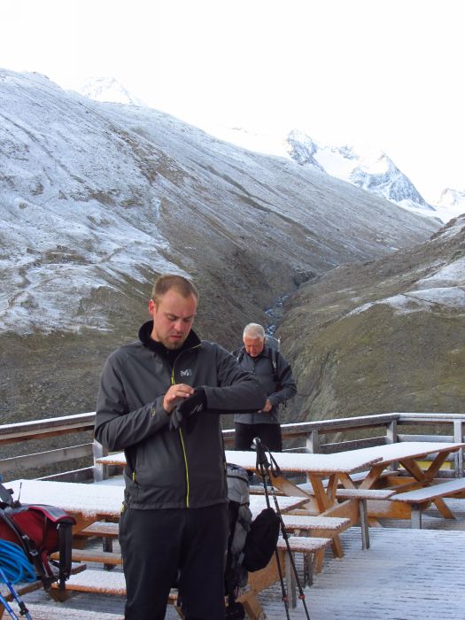Ráno ve středu na nás koukalo sluníčko, modrá obloha, tak jsme radostně vyrazili na další ledovec Hochjochferner do sedla Hauslabjoch 3279m. Celou cestu byly nádherné výhledy na okolní ledovce a hory. Ze sedla již bylo viděl mohylu na počest Otziho, ke které jsme sestoupali a u ní poobědvali. Potom jsme v poklidu po hřebínku asi za hodinu došli k chatě Similaunhütte 3019m, kde byla také platná rezervace. Chata není členem alpských spolků, nedá se uplatnit sleva OEAV, ale úroveň ubytování a ceny za jídlo a pití ta částečně kompenzují, moc se nám tu líbilo. No a ten výhled na hlavní cíl celé výpravy - Similaun 3606m - moc pěkné. |