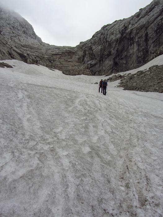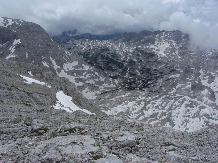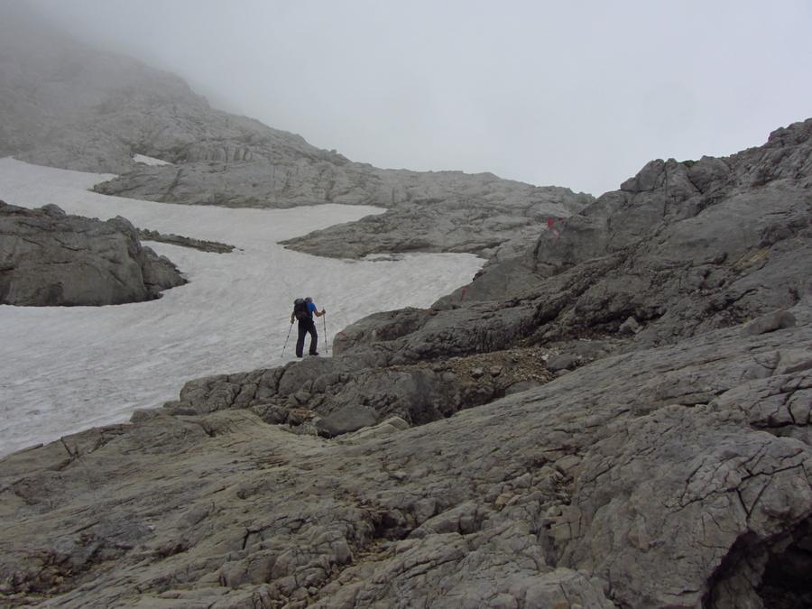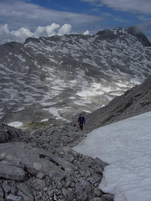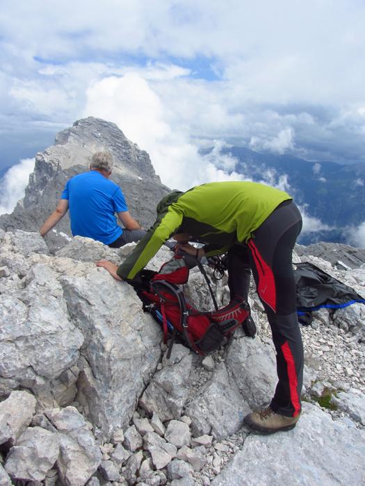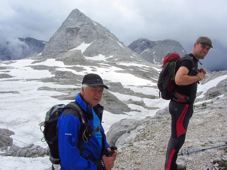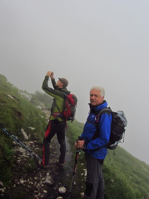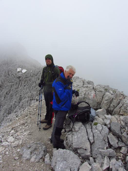 Předpověď počasí a i ranní zamračená realita nám změnily program, místo ferraty, jsme vyrazili k nejvyššímu bodu oblasti naGrosser Priel 2515 m. Za asi dvě hodiny jsme byli na vrcholu u obrovského rudého kříže, sice nebylo nic vidět, ale dali jsme si tady svačinku a začali sestupovat. To už začalo vykukovat sluníčko, otvíraly se pohledy na všechny strany, a tak jsme se rozhodli vyrazit ještě na další výrazný kopec v okolí Temmelberg 2327 m. Vrchol byl opět dobyt a z vršku od malého křížku byl nádherný výhled na okolní hory a na stále ještě zasněžené pláně. Po asi půlhodině válení na vrcholu jsme se začali vracet k chalupě. No a avizované bouřky a déšť přišly až večer, kdy už bylo na stole pivko a rakouské dobroty. |
