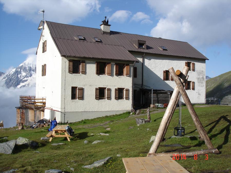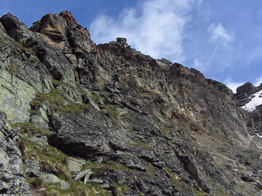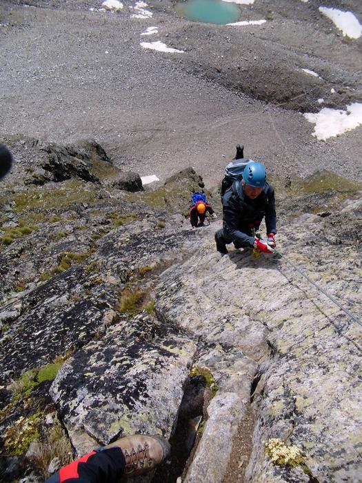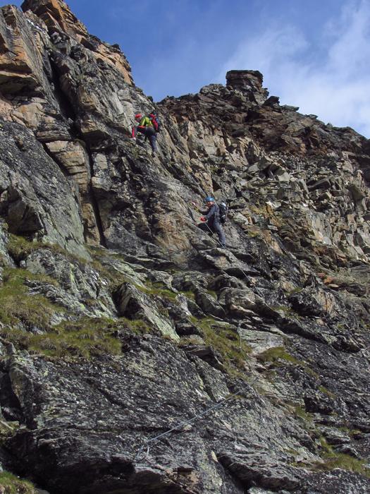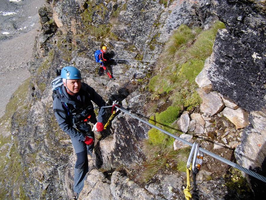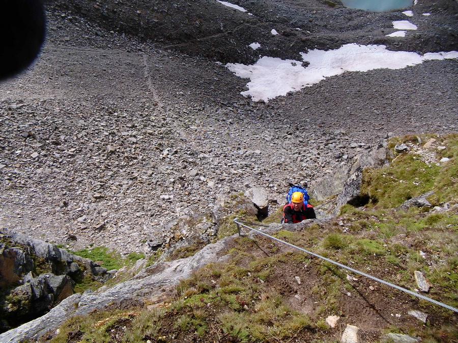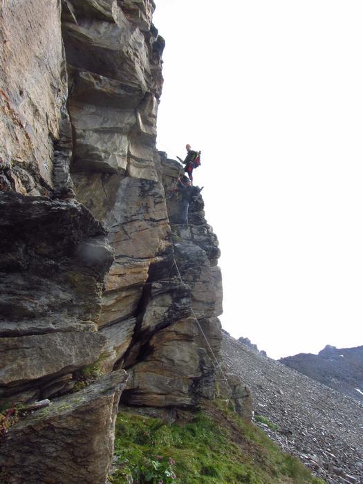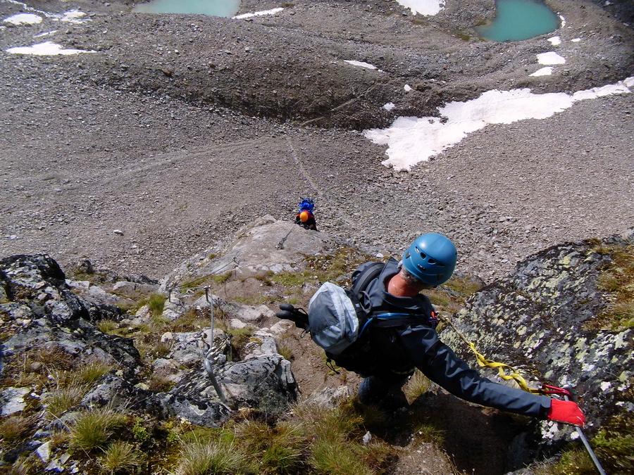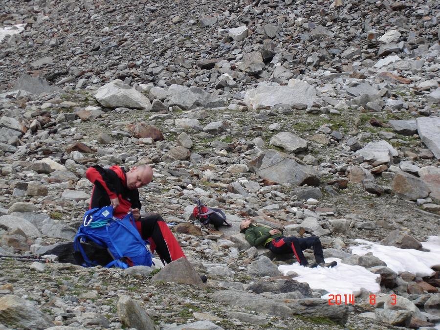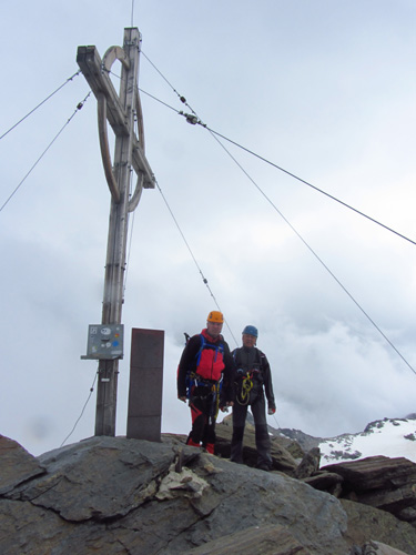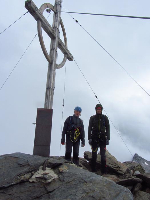 Předpověď na sobotu byla bez bouřek, tak jsme dle plánu vyrazili na ferratu ,vedoucí na vrchol Tschengelser Hochwand 3370m. Ferrata byla uváděna jako „céčková“,což odpovídá i skutečnosti. Na ferratě jsme byli sami, protože dva lezci před námi to otočili a šli normálkou . My jsme po cca 1,5 hodině zajímavého lezení dorazili na vrchol, pokoukali, a vyrazili dolů, protože se začalo kazit počasí. Cestou ale padlo rozhodnutí, že se ještě vypravíme po ledovci na Kleiner Angelus,abychom se řádně připravili a aklimatizovali na další dny. Bohužel cca 100m pod vrcholem jsme se museli otočit, navléct si všechno oblečení z batohů a pelášit dolů, protože přišel vítr, déšť, omrzlice, mlha a teplota k nule. Ale jak to na horách bývá, než jsme došli k chalupě, zase bylo slušně, sluníčko a my mohli dát sušit věci a kochat se pohledy na Grosser Angelus, cíl na neděli. |