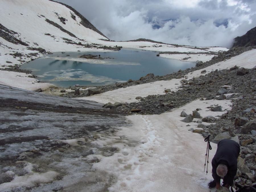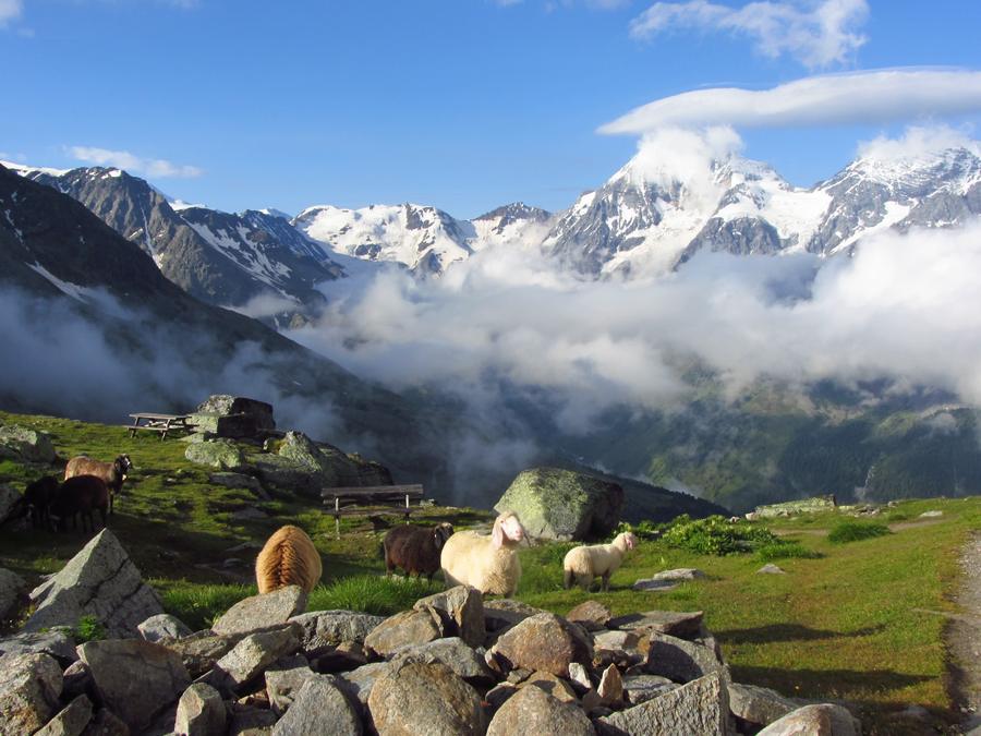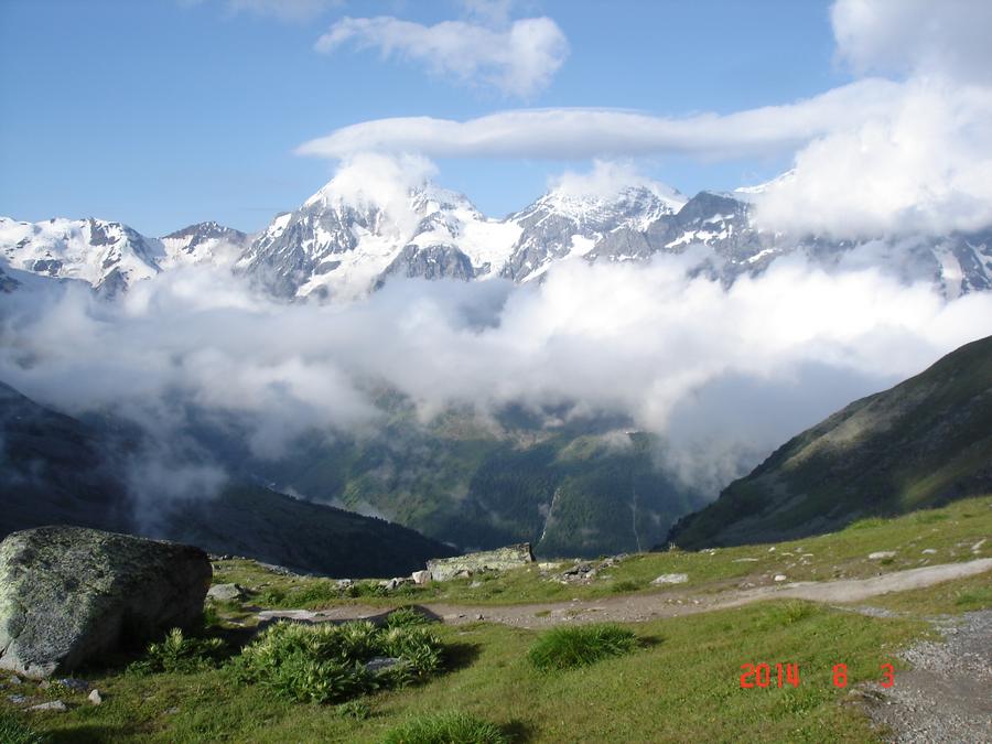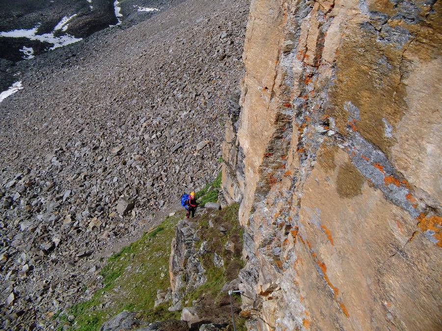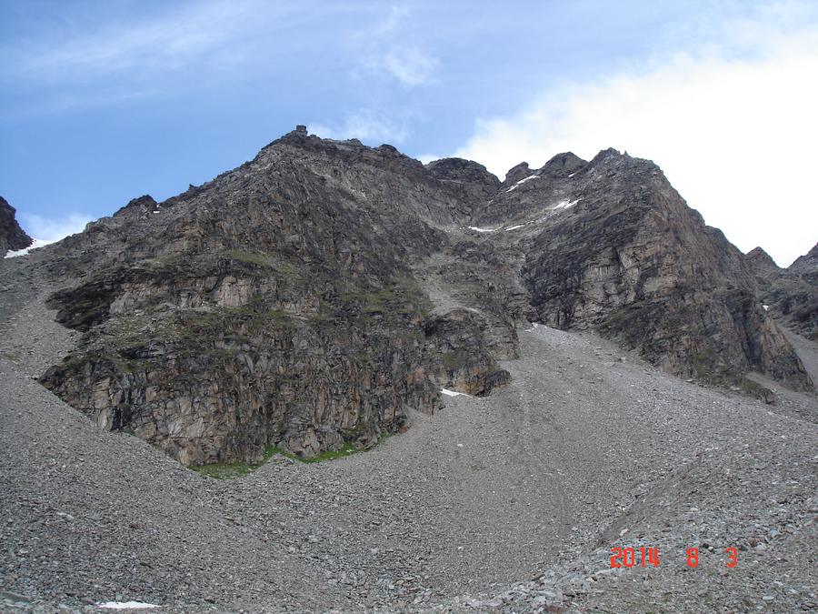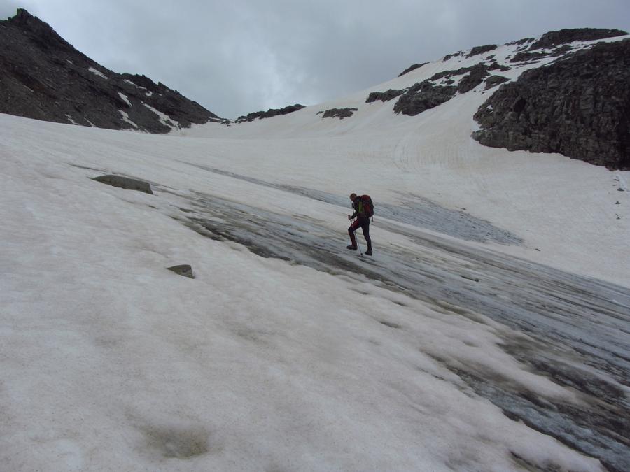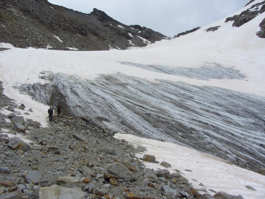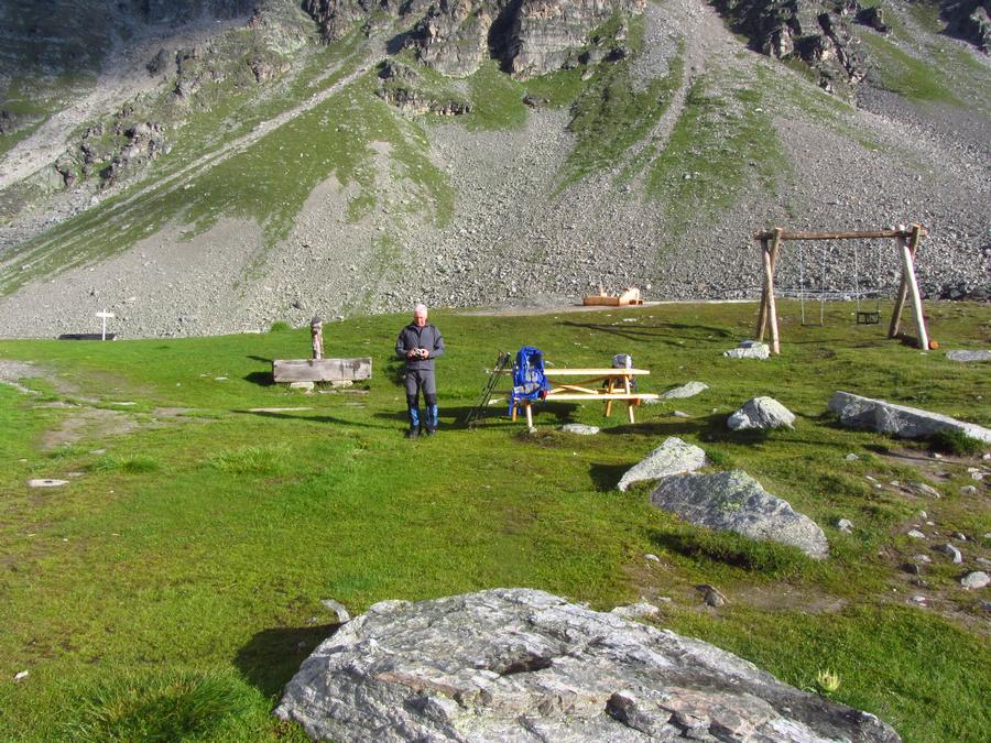 Předpověď na sobotu byla bez bouřek, tak jsme dle plánu vyrazili na ferratu ,vedoucí na vrchol Tschengelser Hochwand 3370m. Ferrata byla uváděna jako „céčková“,což odpovídá i skutečnosti. Na ferratě jsme byli sami, protože dva lezci před námi to otočili a šli normálkou . My jsme po cca 1,5 hodině zajímavého lezení dorazili na vrchol, pokoukali, a vyrazili dolů, protože se začalo kazit počasí. Cestou ale padlo rozhodnutí, že se ještě vypravíme po ledovci na Kleiner Angelus,abychom se řádně připravili a aklimatizovali na další dny. Bohužel cca 100m pod vrcholem jsme se museli otočit, navléct si všechno oblečení z batohů a pelášit dolů, protože přišel vítr, déšť, omrzlice, mlha a teplota k nule. Ale jak to na horách bývá, než jsme došli k chalupě, zase bylo slušně, sluníčko a my mohli dát sušit věci a kochat se pohledy na Grosser Angelus, cíl na neděli. |